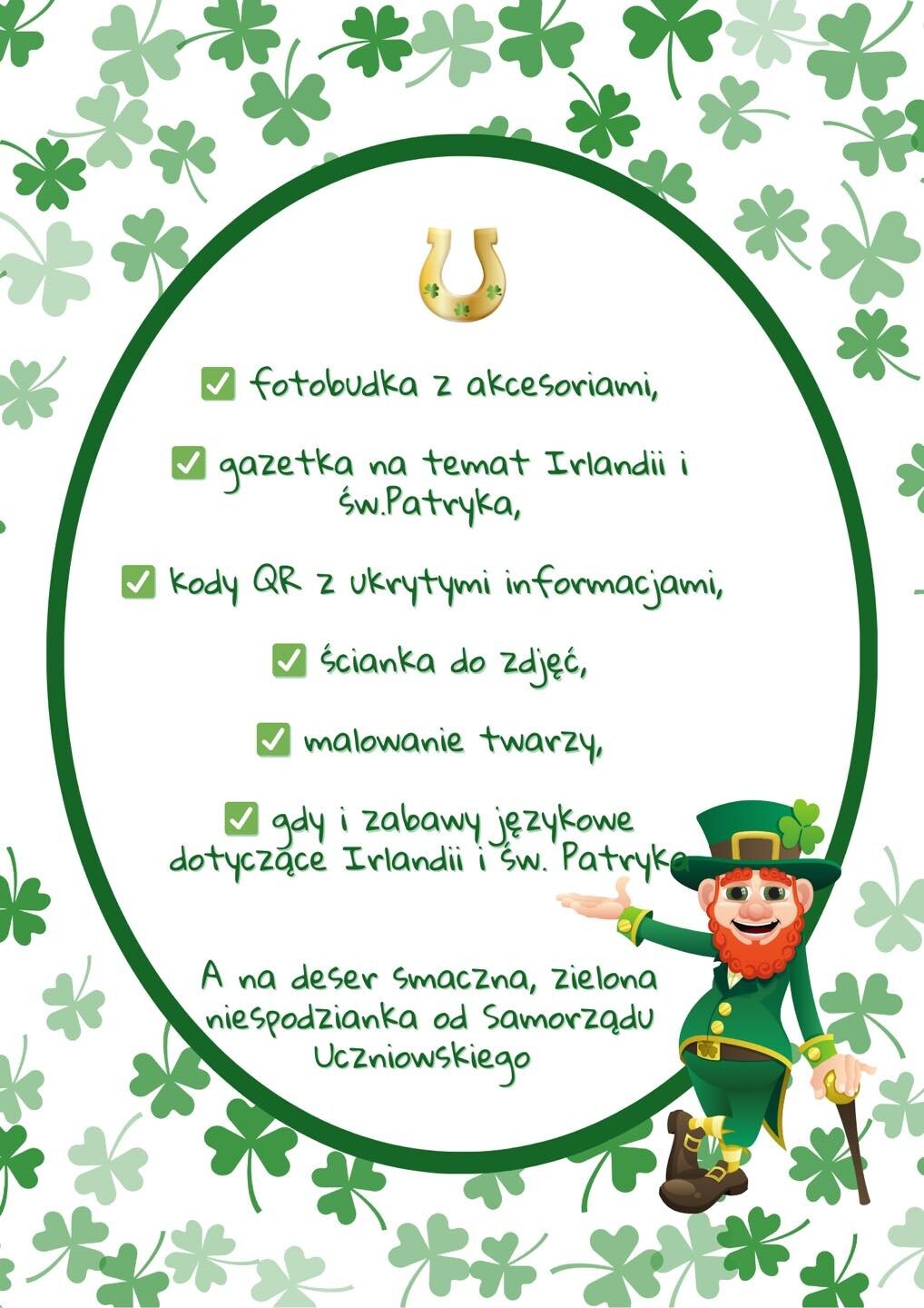 15 marca obchodzić będziemy w naszej szkole Dzień Św. Patryka, patrona Irlandii. Z tej okazji zapraszamy wszystkich do wspólnej zabawy. Nie zapomnijcie ubrać się na zielono, niech będzie Nas widać.