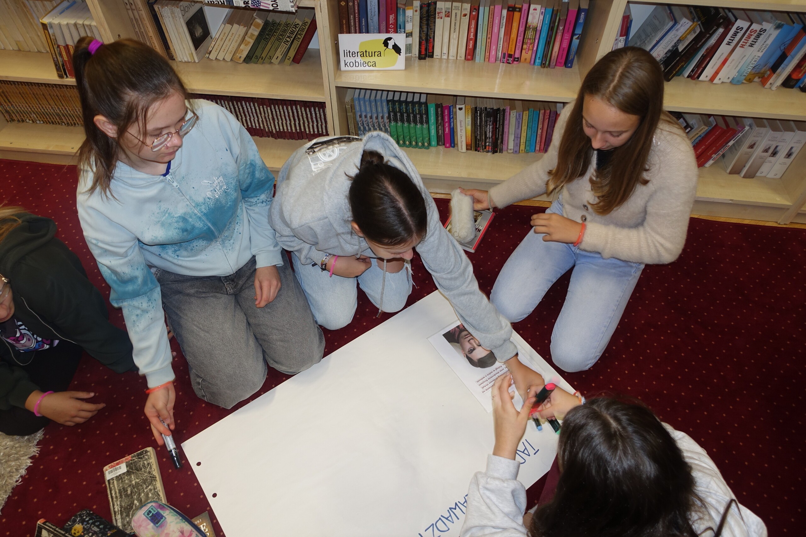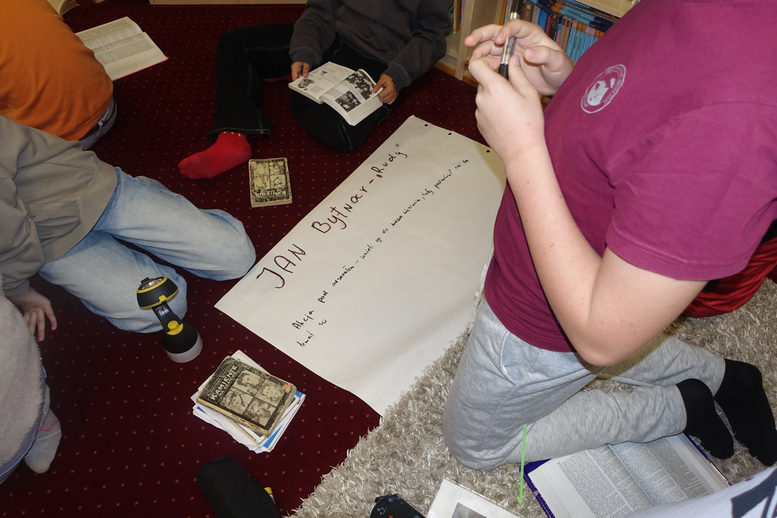 Ale to nie wszystko. Po wspólnym czytaniu uczniowie musieli wykazać się znajomością całej lektury. Była część warsztatowa z pracą w grupach o trzech głównych bohaterach "Kamieni..." oraz rozmowa o patriotyzmie. Cykl zajęć został przygotowany przez Panie: Dorotę Halas i Magdalenę Kubiak.