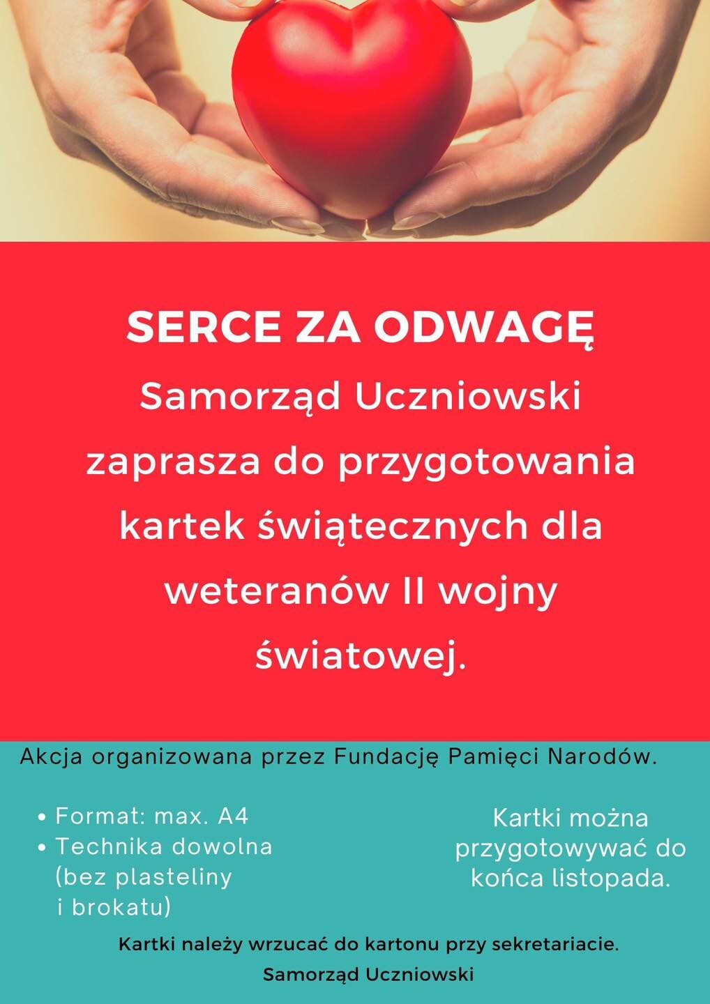 W ramach corocznej akcji "Serce za odwagę" z Fundacji Pamięci Narodów również i w naszej szkole przygotujmy kartki świąteczne dla weteranów II wojny światowej, którym zawdzięczamy wolną i niepodległą Polskę.