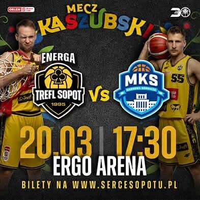 Koszykarskie święto w ERGO ARENIE! W piątek, 20 marca 2026, o godz. 17:30 drużyna Energi Trefla Sopot zmierzy się z MKS-em Dąbrowa Górnicza, a spotkanie zostanie rozegrane jako Mecz Kaszubski. Tego dnia żółto-czarnym będą kibicować licznie zgromadzeni uczniowie z Kaszub, którzy przyjadą na finał konkursu plastycznego „Aktywne Kaszuby”.