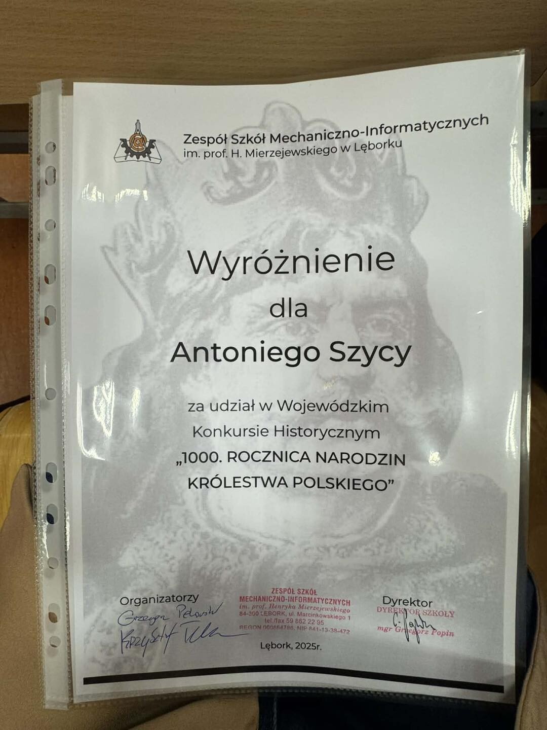 Z radością informujemy, że Anna Wrońska oraz Antoni Szyca, uczniowie Szkoły Podstawowej im. Jana Brzechwy w Wicku, wzięli udział w Wojewódzkim Konkursie Historycznym „1000. ROCZNICA NARODZIN KRÓLESTWA POLSKIEGO”, organizowanym przez Zespół Szkół Mechaniczno-Informatycznych w Lęborku.