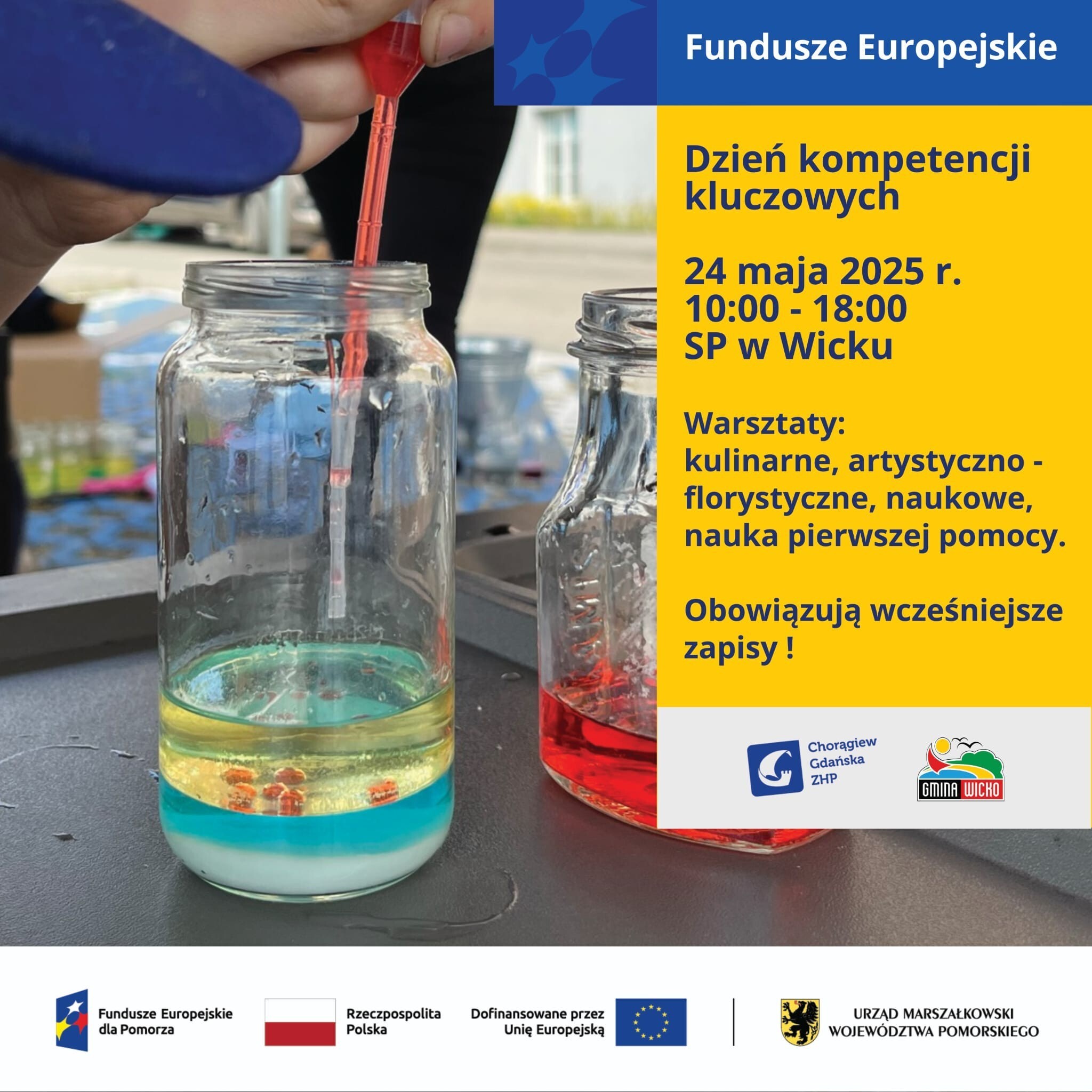 Zajęcia są realizowane w ramach projektu pn. „Aktywni mieszkańcy Gminy Wicko – usługi społeczne dla mieszkańców obszaru Strefy Przybrzeżnej”. Udział w warsztatach jest bezpłatny. Obowiązują jednak wcześniejsze zapisy. Są one przyjmowane telefonicznie pod numerem: 605 990 950 - biuro Hufca ZHP Lębork. Ze względu na ograniczoną ilość miejsc, decydować będzie kolejność zgłoszeń. Zgłoszenia przyjmujemy do czwartku 22.05.2025 r. Serdecznie zapraszamy !