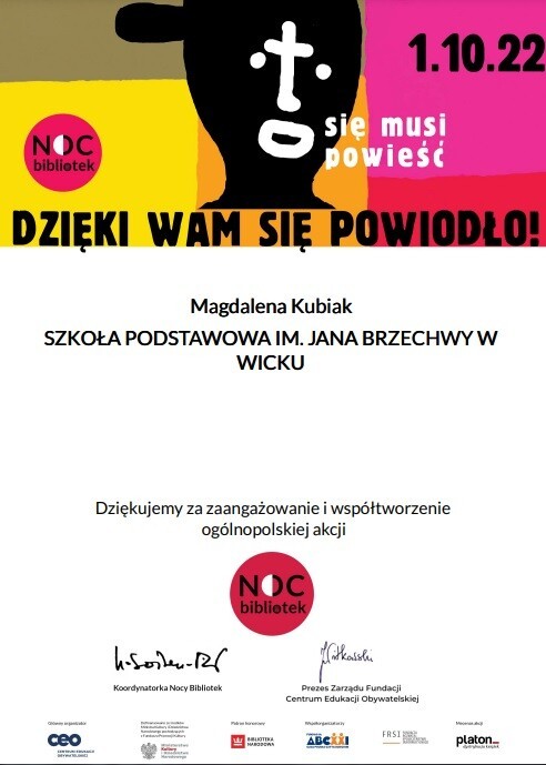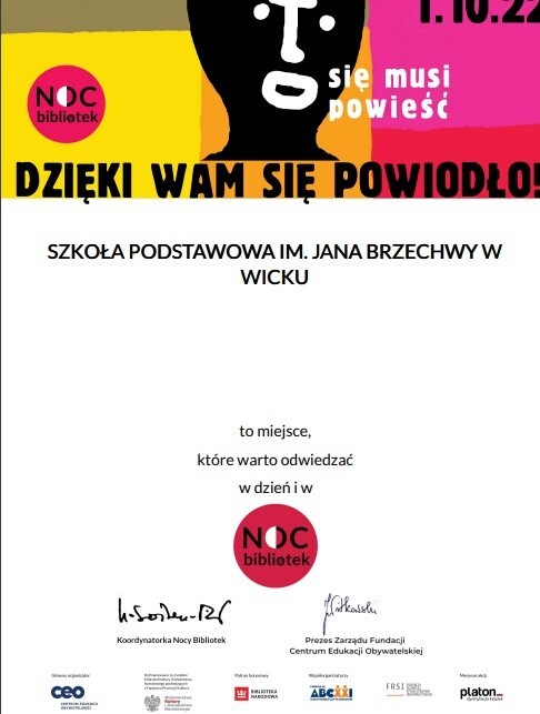 Z przyjemnością pragniemy poinformować, że wczoraj, tj. 21.12.2022, otrzymaliśmy certyfikat z Centrum Edukacji Obywatelskiej za zorganizowanie w naszej szkole akcji "Noc Bibliotek". Już po raz kolejny nasi uczniowie biorą udział w tym ogólnopolskim przedsięwzięciu, promującym czytanie wśród dzieci i młodzieży.