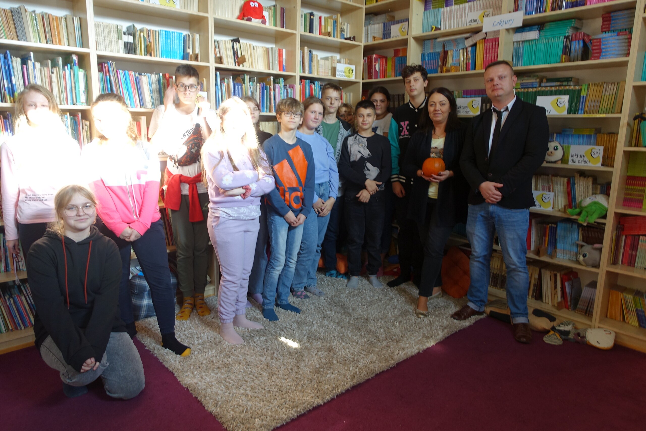 Już tradycyjnie, gdy zbliża się Święto Zmarłych, wspólnie czytamy II część "Dziadów" Adama Mickiewicza z klasami, które akurat wtedy omawiają tę lekturę obowiązkową na lekcjach języka polskiego. W tym roku była to klasa siódma. Uczniowie wraz z nauczycielką języka polskiego, Panią Joanną Jagodzińską oraz naszym Dyrektorem przybyli do naszej bibliotecznej "Narnii" - czytelni, by wspólnie przeczytać dziewiętnastowieczny klasyczny tekst, opisujący pradawne zwyczaje związane ze Świętem Zmarłych.