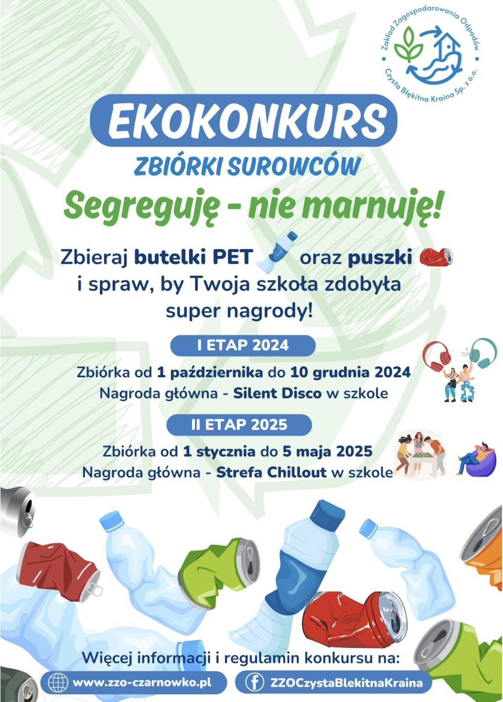 Zbieramy butelki plastikowe i puszki aluminiowe. Rozpoczynamy drugi etap zbiórki surowców w ramach konkursu „Segreguję - nie marnuję”, zorganizowanego przez Zakład Zagospodarowania Odpadów "Czysta Błękitna Kraina" Sp. z o.o. w Czarnówku. Akcja trwa do 5 maja 2025.