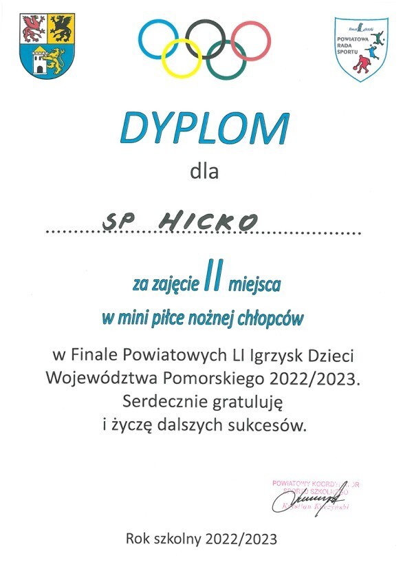 Miło nam poinformować, że Szkoła Podstawowa im. Jana Brzechwy w Wicku została uhonorowana pamiątkowym dyplomem za zdobycie II miejsca przez chłopięcą drużynę minipiłki nożnej w finale powiatowych rozgrywek Igrzysk Dzieci Województwa Pomorskiego. Dziękujemy w imieniu naszych uczniów!