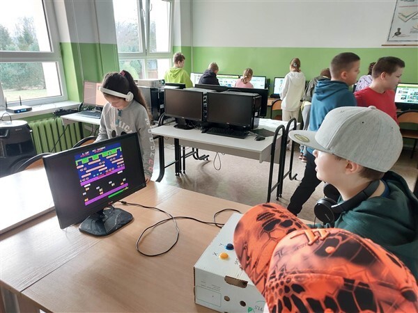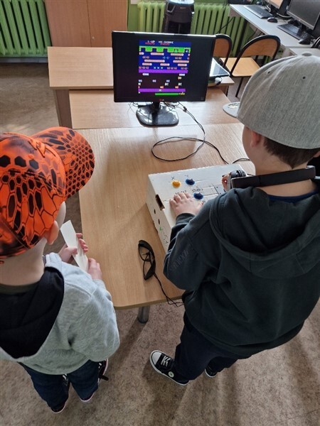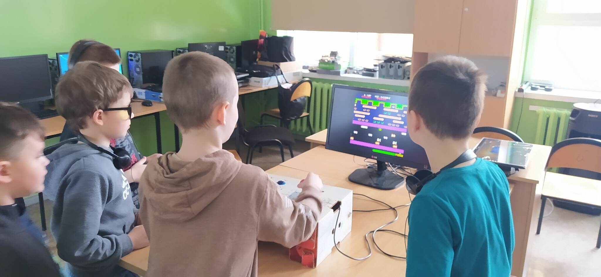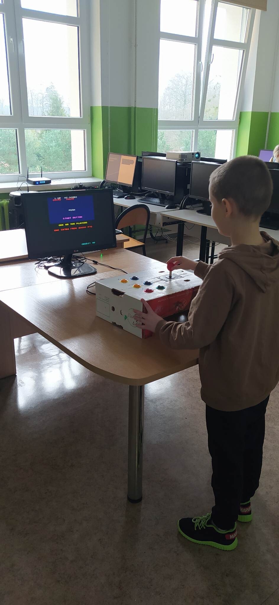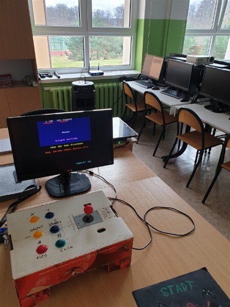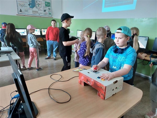 Ponadto w sali komputerowej czekały na uczniów stanowiska z grami komputerowymi oraz przygotowane prezentacje. Był tam również obecny naoczny dowód na to, że dobry joystick do sterowania może być zrobiony własnoręcznie, domowym sposobem, z kartonu - i dobrze działać!