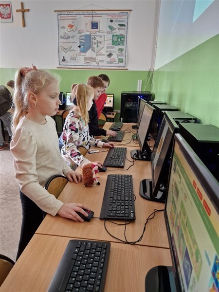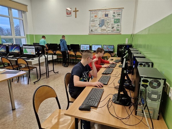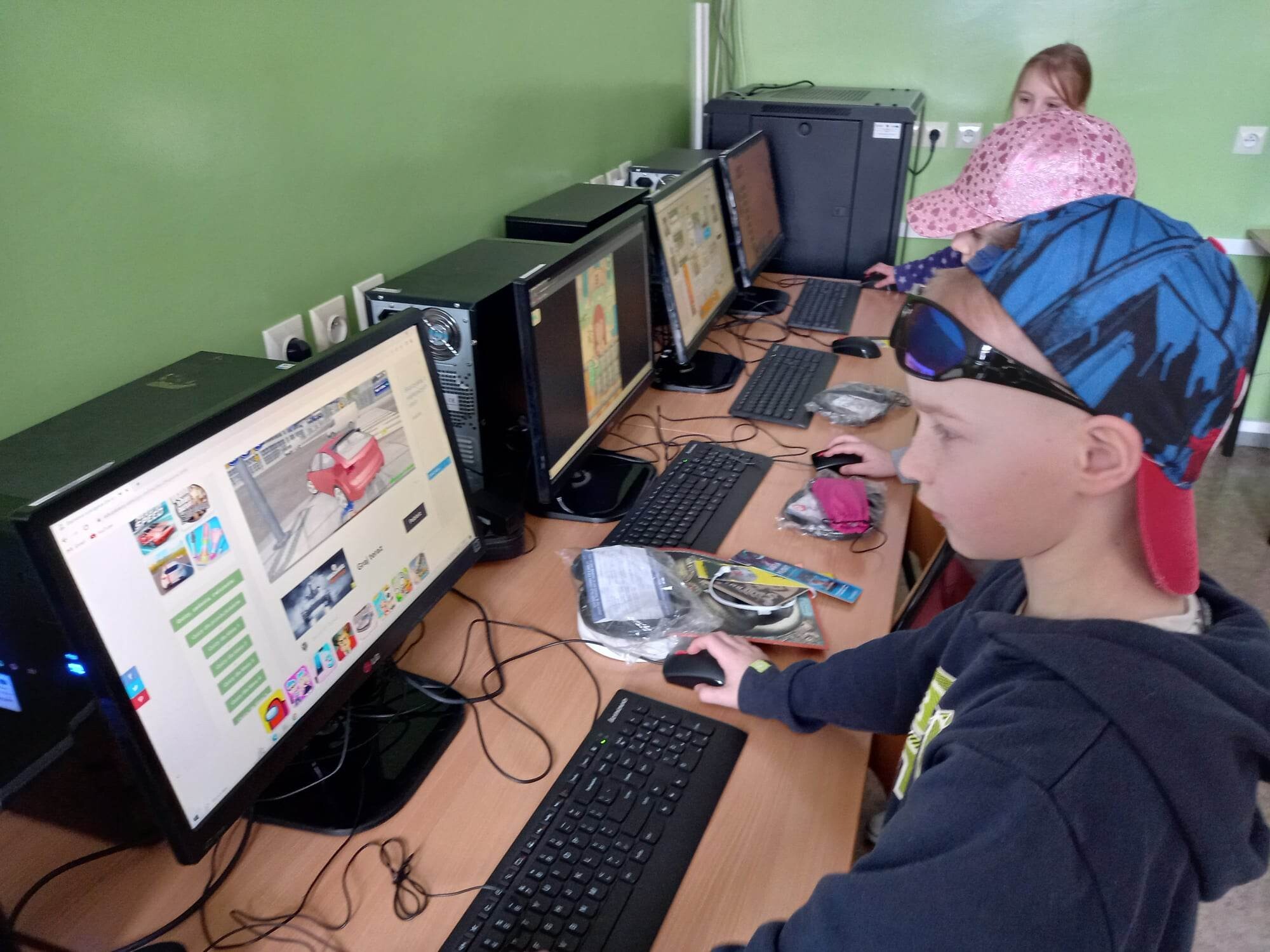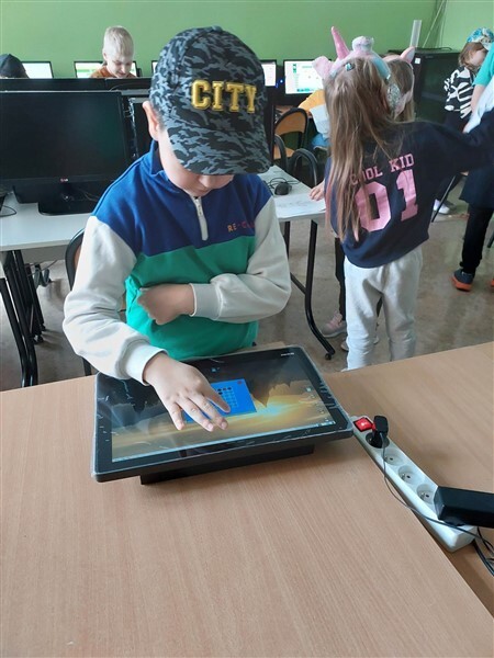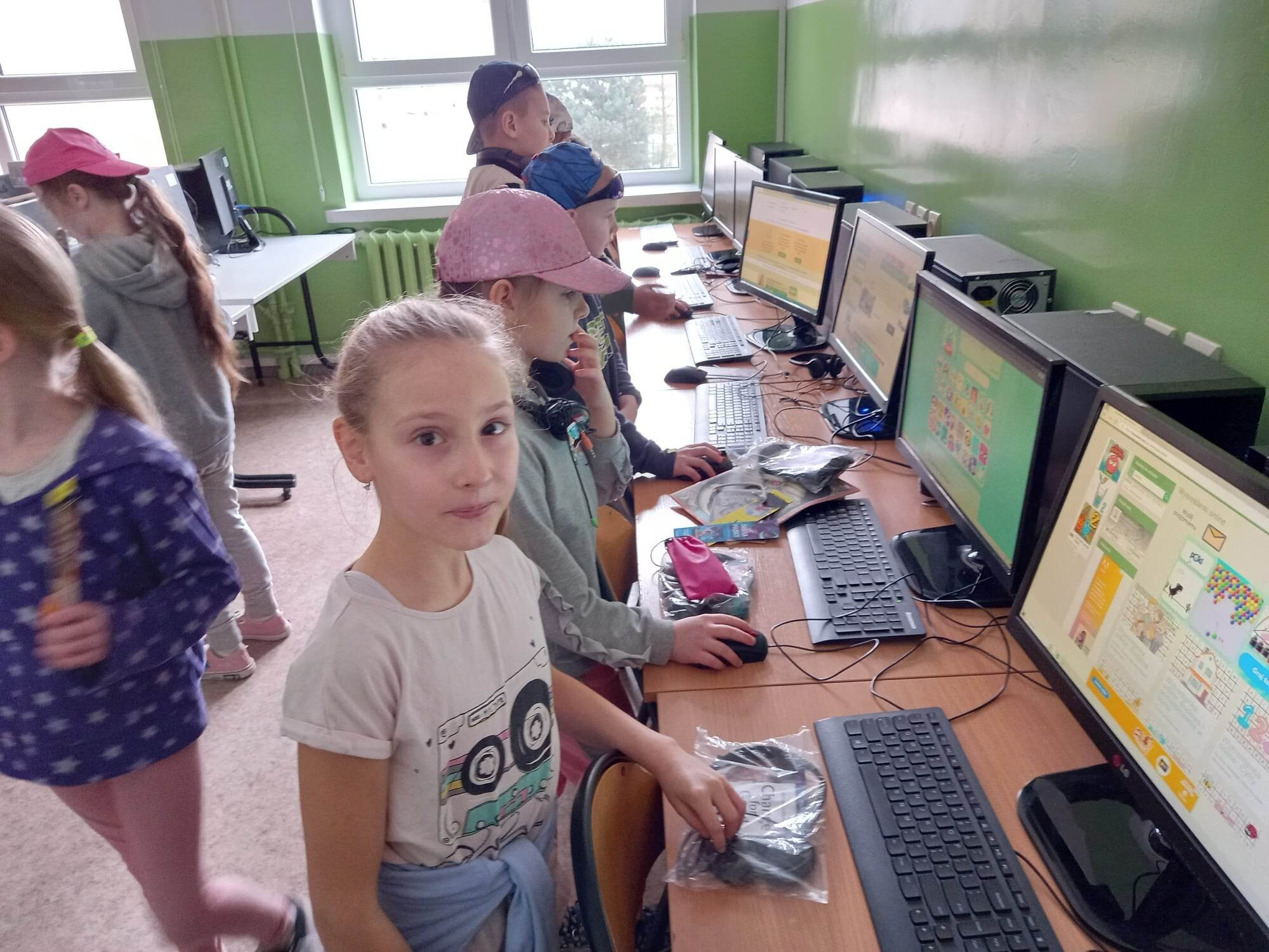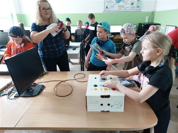 Ponadto w sali komputerowej czekały na uczniów stanowiska z grami komputerowymi oraz przygotowane prezentacje. Był tam również obecny naoczny dowód na to, że dobry joystick do sterowania może być zrobiony własnoręcznie, domowym sposobem, z kartonu - i dobrze działać!