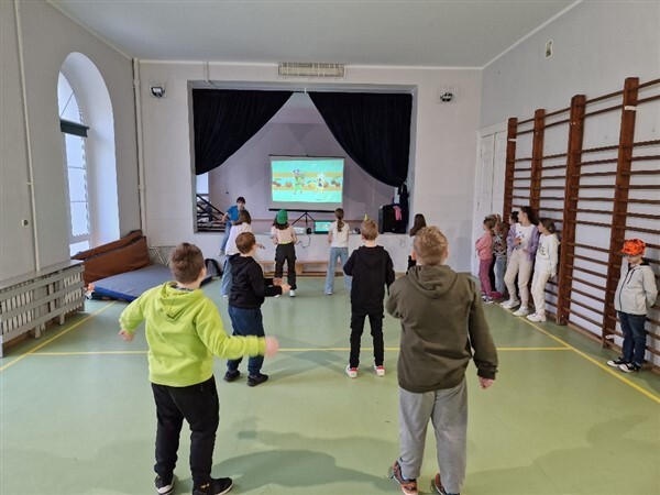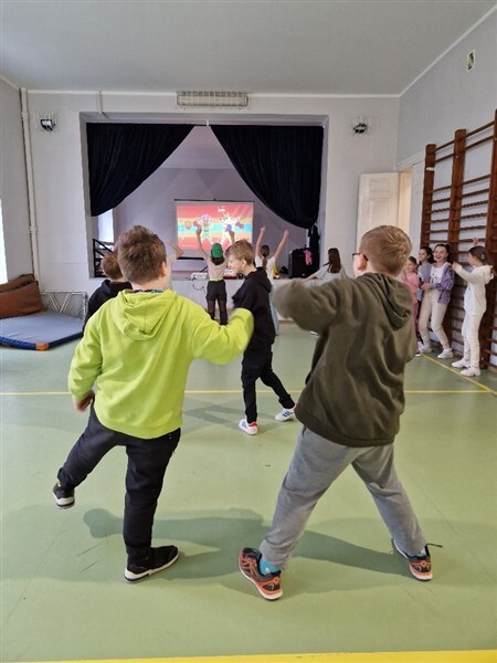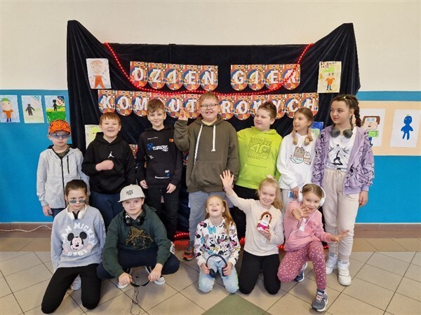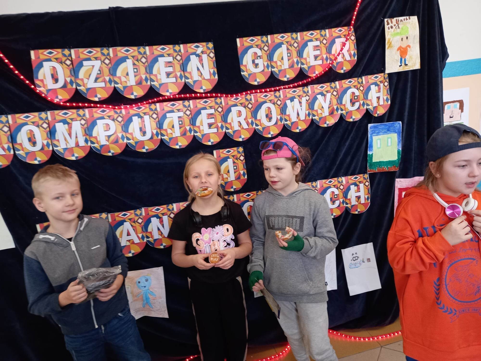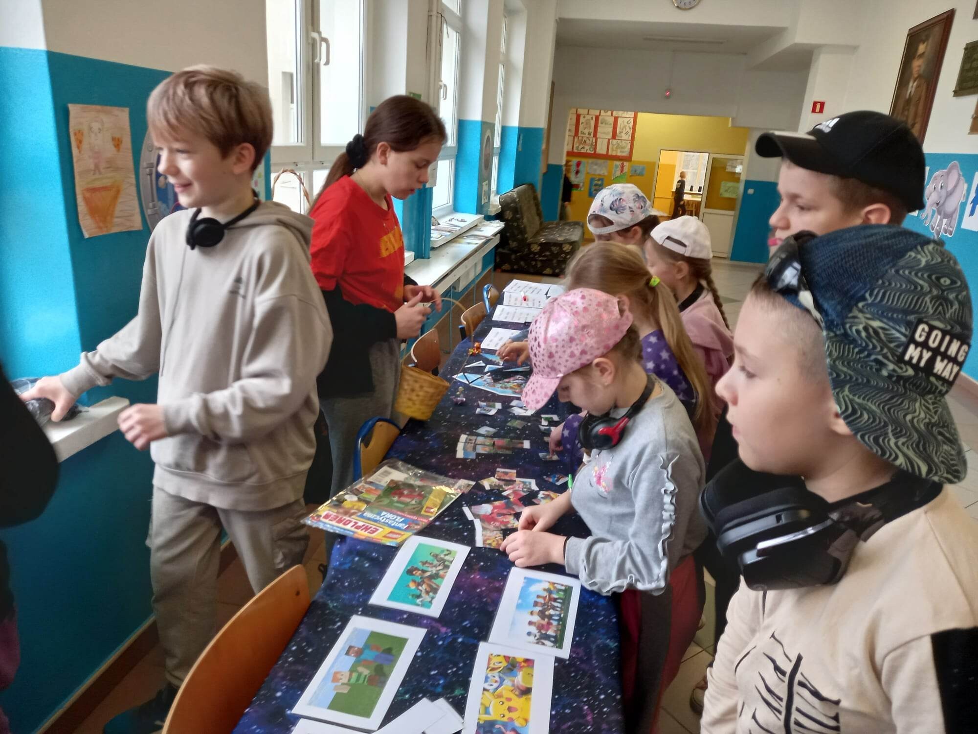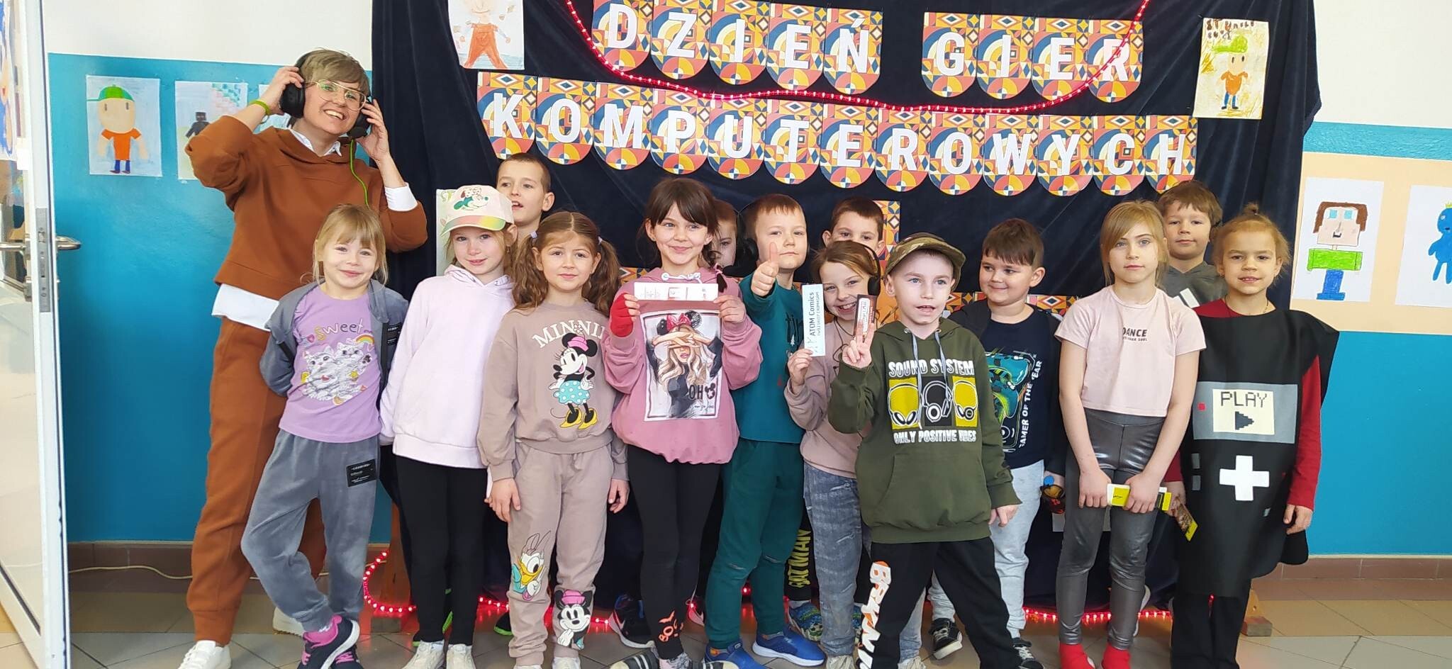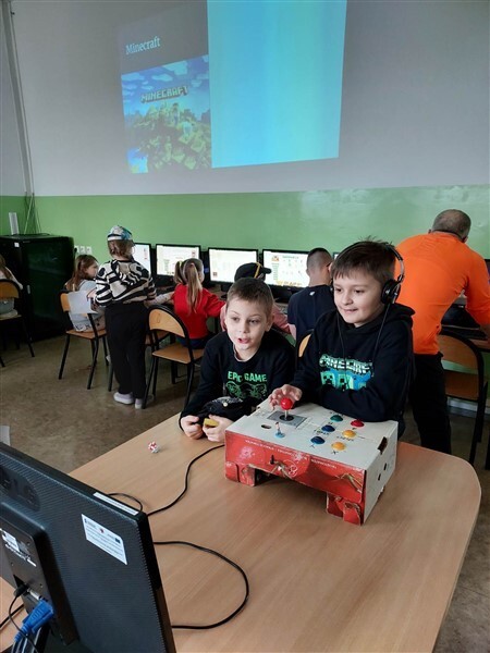 To nie wszystko! Dla najmłodszych roczników starsi uczniowie, działający w Samorządzie Uczniowskim, przygotowali gamingową zumbę, wspólnie tańczoną w małej sali gimnastycznej. Obok na maluchy czekały zajęcia biblioteczne w Bibliotece Szkolnej w Wicku o historii najpopularniejszych planszówek od zarania dziejów po czasy współczesne oraz film o popularności gier komputerowych w stylu retro. Wychowawczynie klas I-III czuwały nad przebiegiem całości i zadbały również o piękny wystrój graficzny obchodów. Na ścianach głównego korytarza szkolnego pojawiło się mnóstwo prac plastycznych naszych uczniów z bohaterami ich ulubionych gier. Nie zabrakło Minecrafta i Robloxa.