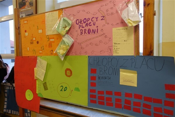 Piętro wyżej też nie próżnowano! Można było podziwiać wyeksponowane na korytarzu przykłady gier planszowych zrobionych samodzielnie przez starsze roczniki uczniów, zainspirowanych przeczytanymi lekturami.