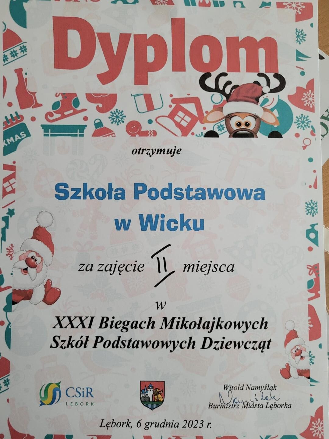 Udział naszej szkoły w Biegu Mikołajkowym to już trzydziestojednoletnia tradycja. Nie inaczej było w tym roku. 6 grudnia o godz. 11.00 dwie sztafety z Wicka (dziewczęta i chłopcy) zameldowały się na linii startu w Lęborku. W tym roku startowała rekordowa liczba 13 szkół, zarówno wśród dziewcząt, jak i chłopców. Sztafety składały się z 6 zawodników. Pierwszą zmianę rozpoczynali uczniowie klas pierwszych, natomiast na ostatniej zmianie biegli szóstoklasiści. Na szczególne wyróżnienie zasługują nasze dziewczęta, które zajęły rewelacyjne II miejsce, inkasując oprócz nagród rzeczowych i słodyczy, bon wartości 250 zł na zakup sprzętu sportowego dla szkoły. Sztafeta chłopców pobiegła również bardzo ambitnie, zajmując VII miejsce. Brawo dla wszystkich biegaczy!!!