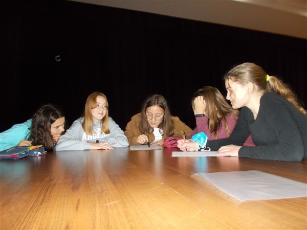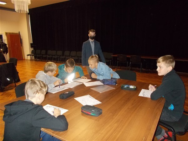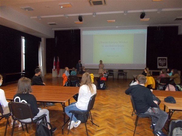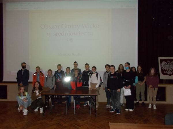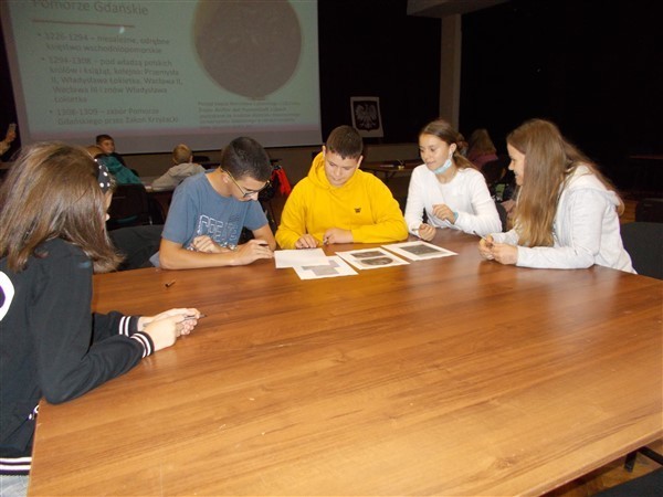 Po części teoretycznej spotkania z historykiem nastąpiły praktyczne ćwiczenia w kilkuosobowych grupach. Nasi uczniowie mieli za zadanie wykonać zadania dotyczące zarówno części starożytnych dziejów, jak i epoki średniowiecza w tym regionie. Potem wspólnie omawiali efekty swoich działań z wszystkimi grupami. Warsztaty zakończyły się wspólnym zdjęciem z młodym naukowcem pochodzącym z Wicka oraz z organizatorką całego przedsięwzięcia, Panią Iwoną Szymichowską, dyrektor Biblioteki Publicznej Gminy Wicko.