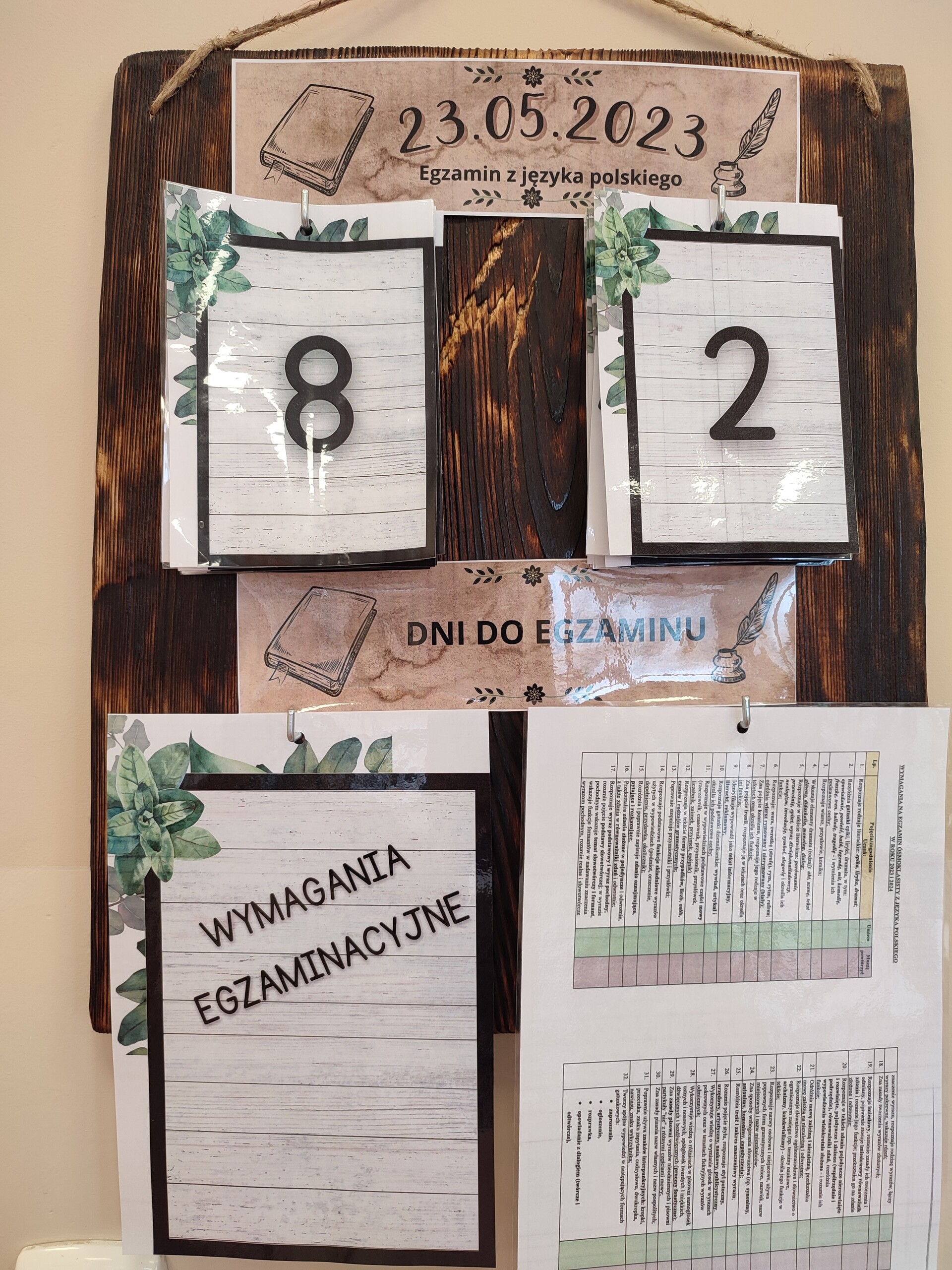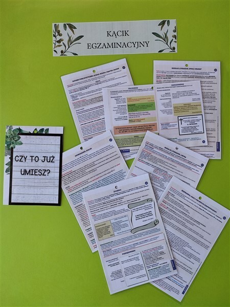 W gabinecie języka polskiego, w sali 24, zawisła specjalna tablica, na której odliczamy czas do 23 maja 2023 – Egzaminu ósmoklasisty z języka polskiego. Oprócz swoistego kalendarza, umieszczane na niej będą istotne zagadnienia dotyczące tego ważnego dla młodzieży wydarzenia. Zaczęłam od wymagań egzaminacyjnych – uczniowie otrzymali także ich wydrukowaną wersję. Opracowałam je na podstawie „WYMAGAŃ EGZAMINACYJNYCH DLA EGZAMINU ÓSMOKLASISTY PRZEPROWADZANEGO W ROKU SZKOLNYM 2022/2023 I 2023/2024 (https://cke.gov.pl/images/_EGZAMIN_OSMOKLASISTY/2023/komunikaty/D20221591.pdf). Aby treść była bardziej przejrzysta i miała praktyczne zastosowanie, umieściłam ją w formie tabeli, dodając rubryki „Umiem” oraz „Muszę powtórzyć”. Jako następne na tablicy pojawią się lektury, najważniejsze treści z gramatyki, nauki o języku, teorii literatury, formy wypowiedzi pisemnej… Krótko mówiąc: to, co każdy ósmoklasista wiedzieć z języka polskiego powinien.