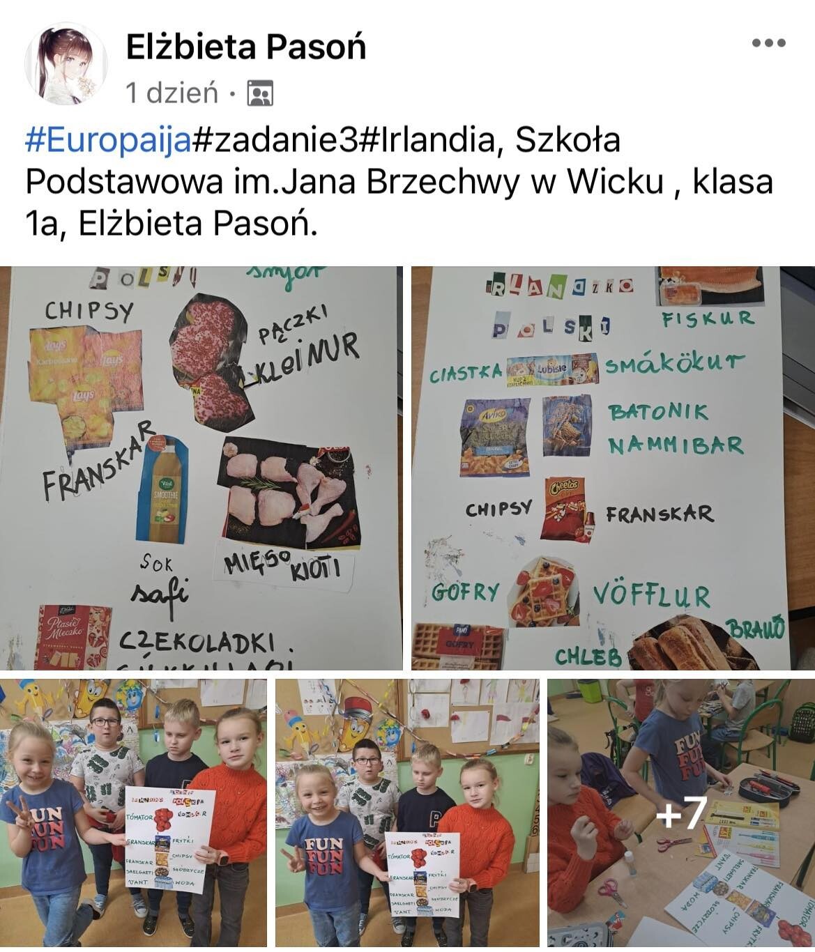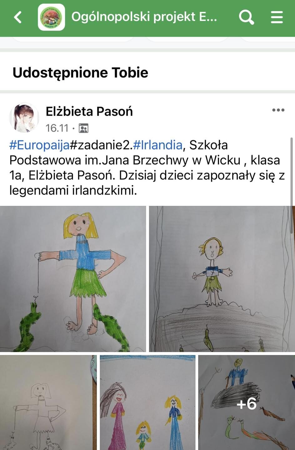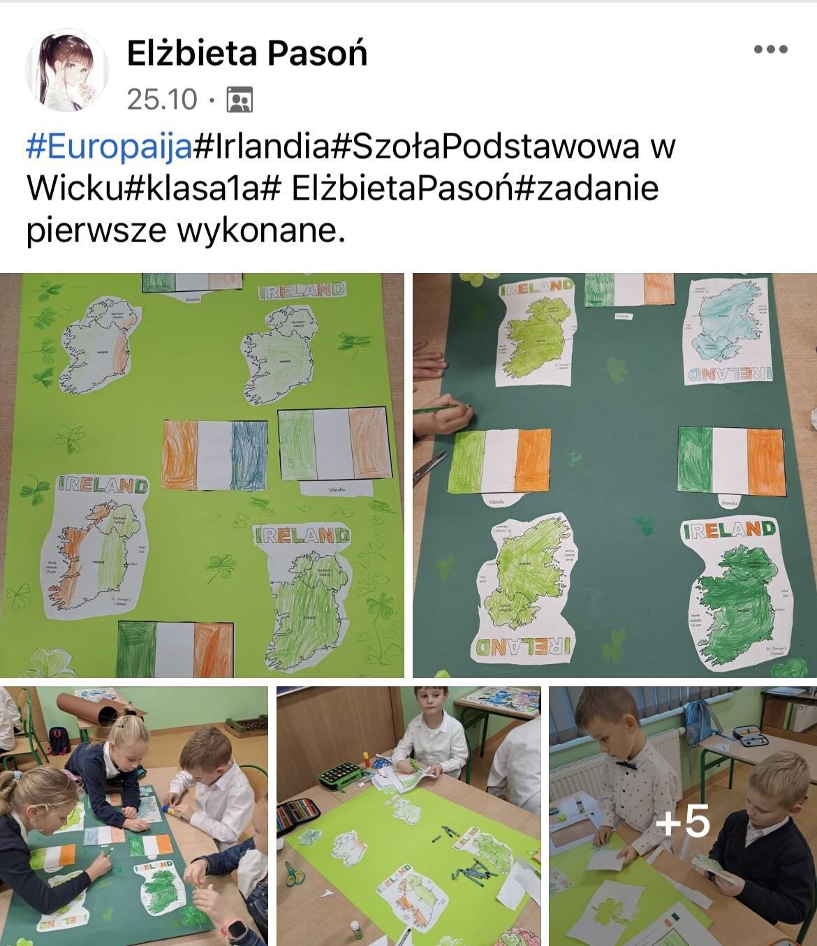 Klasa Ia bierze udział w Ogólnopolskim Projekcie "Europa i Ja". Celem projektu jest poznanie krajów Unii Europejskiej, ich symboli narodowych, zwyczajów, języka, kuchni oraz najciekawszych miejsc w państwach UE. Pierwszaki wybrały Irlandię. Wykonały już trzy zadania z trzynastu.