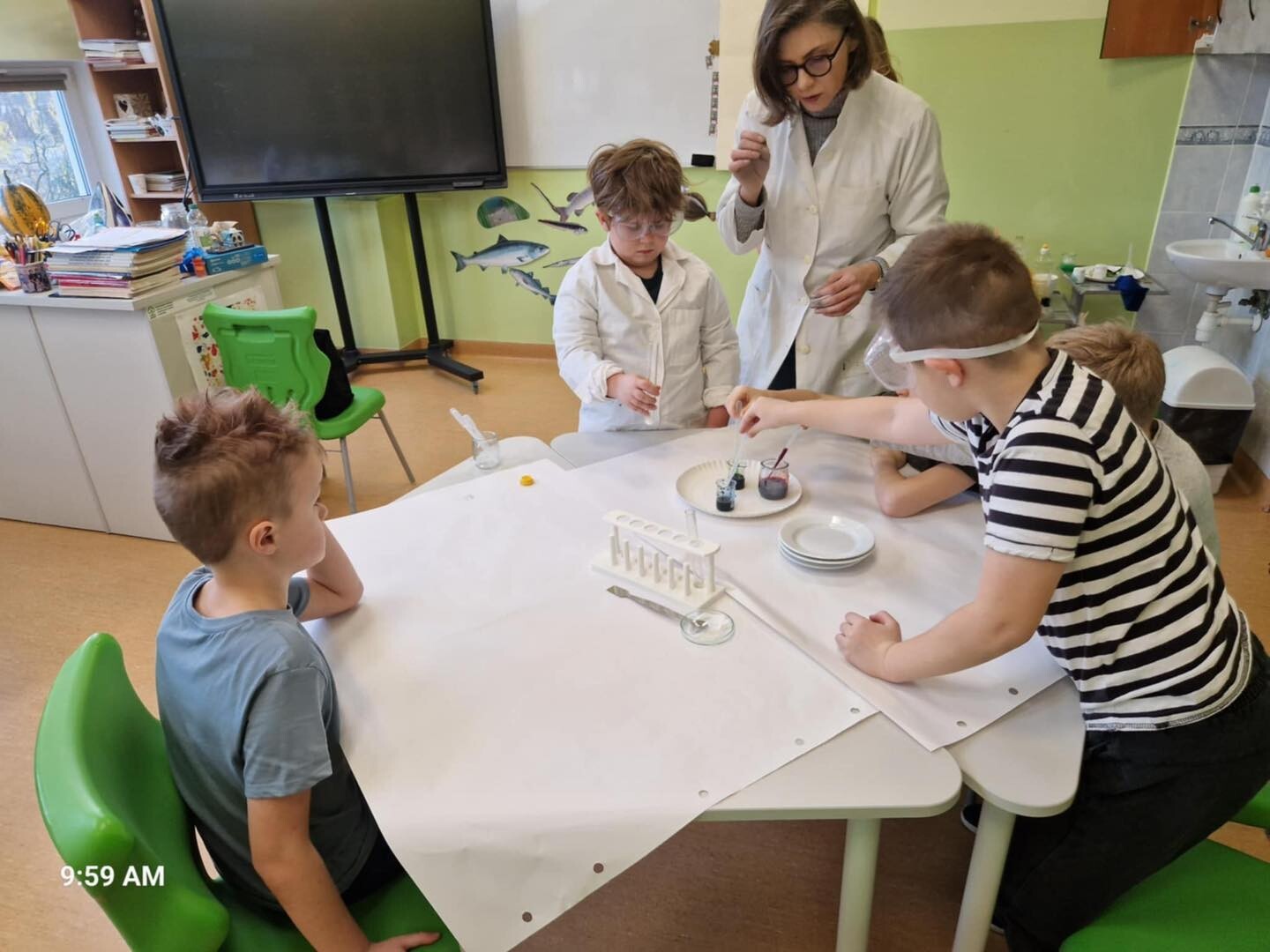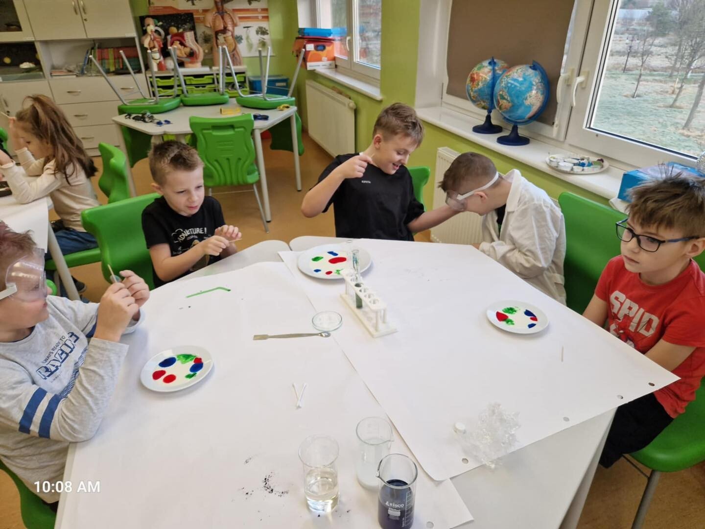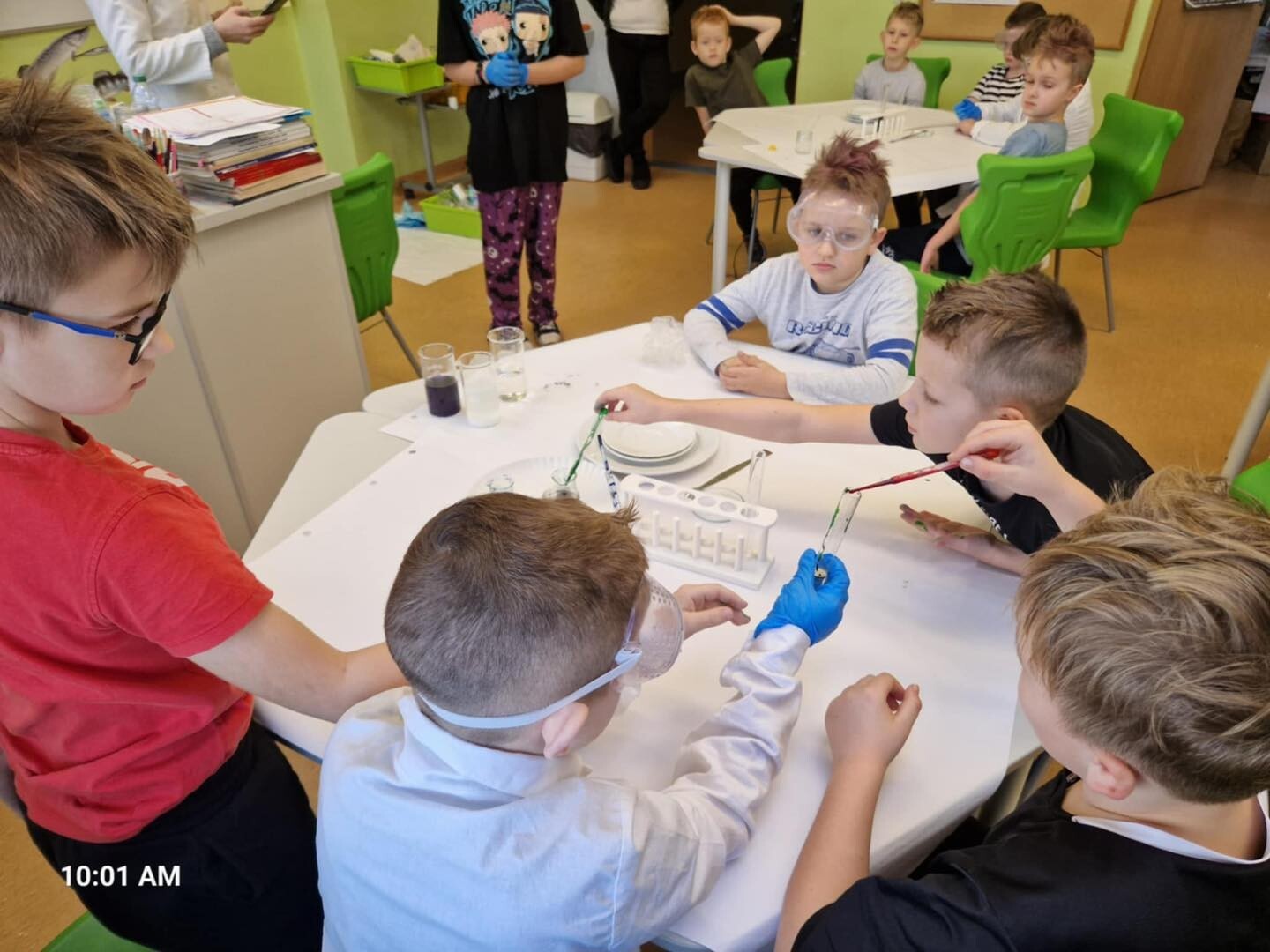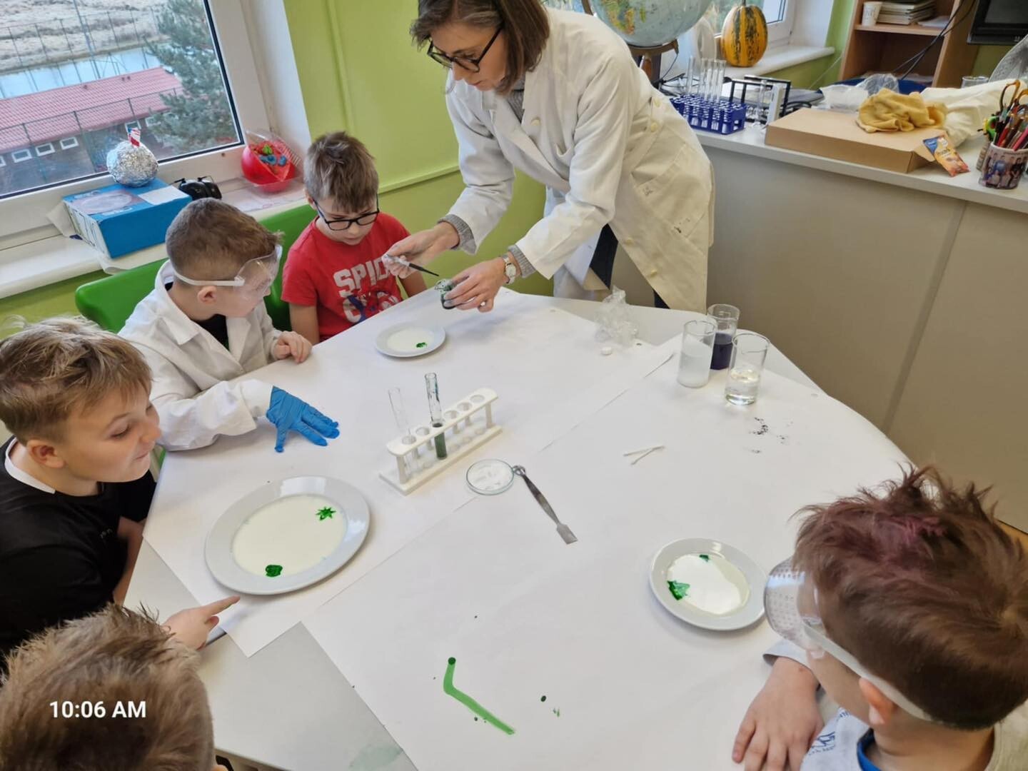 Uczniowie klasy IIB poważnie podeszli do tematu doświadczeń i zabawili się w małych chemików. Pani Mirka Krzyżanowska pomogła nam doświadczyć świetnej zabawy i zrozumieć niektóre chemiczne zasady. Odczytaliśmy na koniec list pisany tajemniczym atramentem. Zajęcia bardzo nam się podobały. Czekamy na więcej - mali chemicy z IIB.