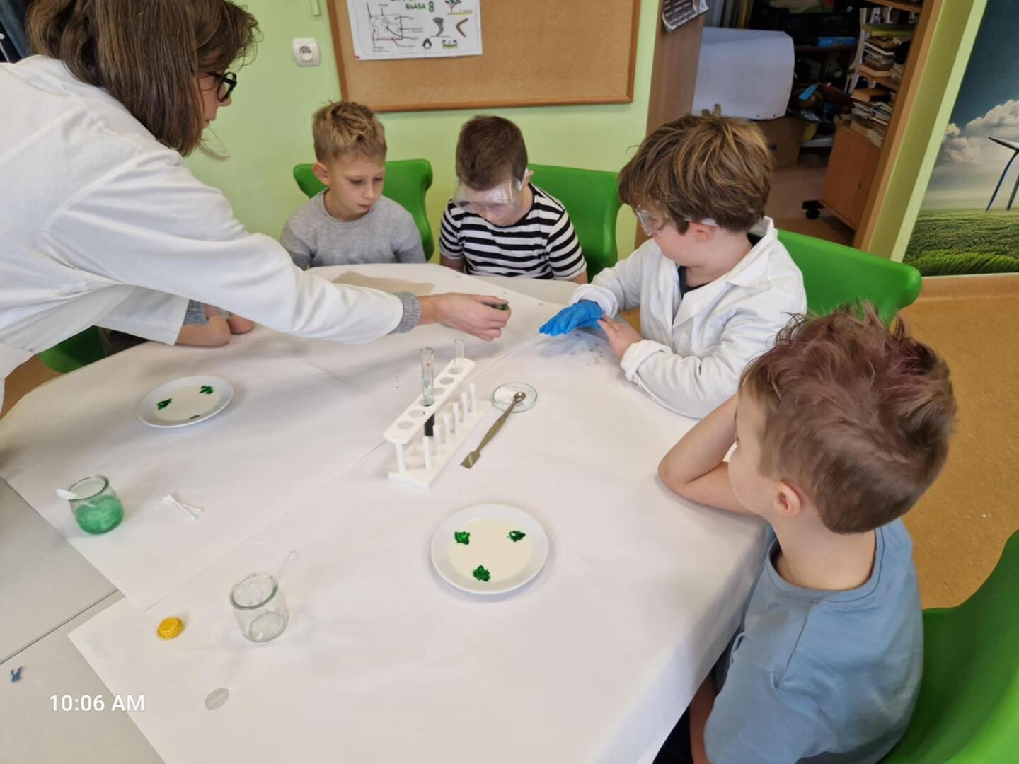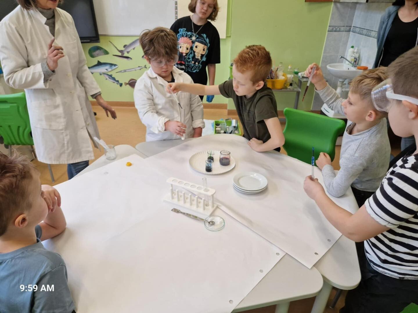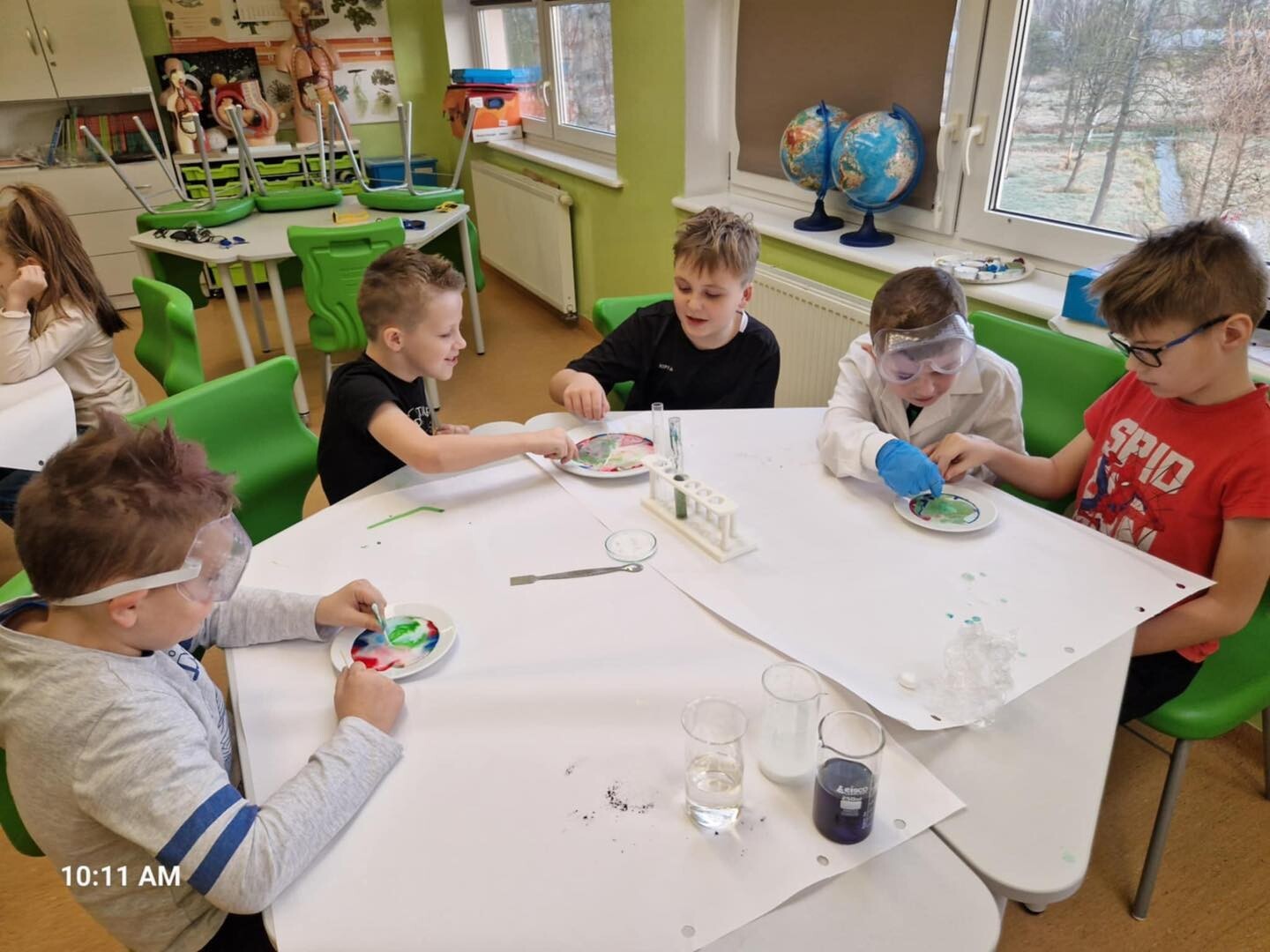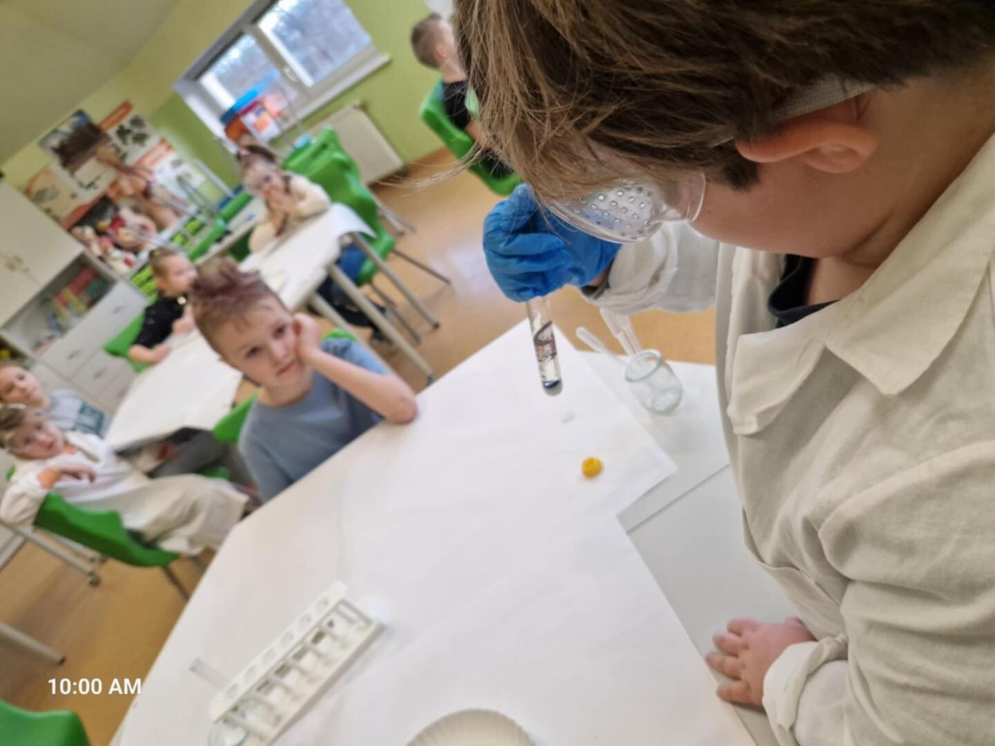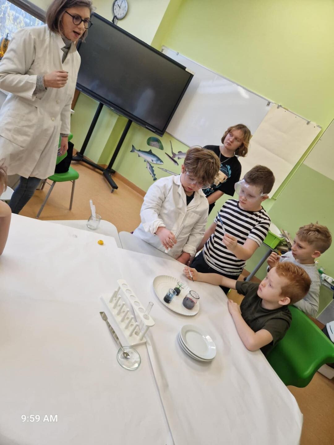 Uczniowie klasy IIB poważnie podeszli do tematu doświadczeń i zabawili się w małych chemików. Pani Mirka Krzyżanowska pomogła nam doświadczyć świetnej zabawy i zrozumieć niektóre chemiczne zasady. Odczytaliśmy na koniec list pisany tajemniczym atramentem. Zajęcia bardzo nam się podobały. Czekamy na więcej - mali chemicy z IIB.