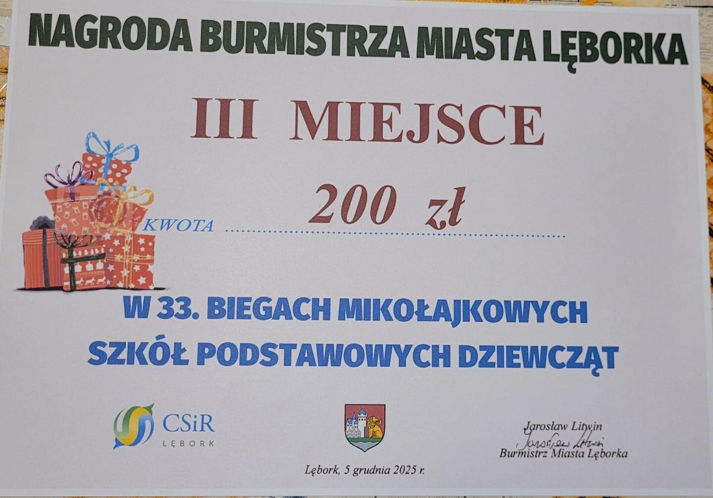 Indywidualne każdy uczestnik otrzymał prezent od Mikołaja, a szkoła otrzymała nagrodę Burmistrza Miasta Lęborka w kwocie 200 zł na zakup sprzętu sportowego. BRAWO!