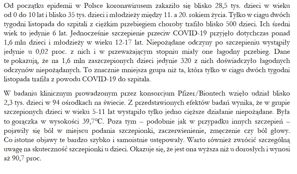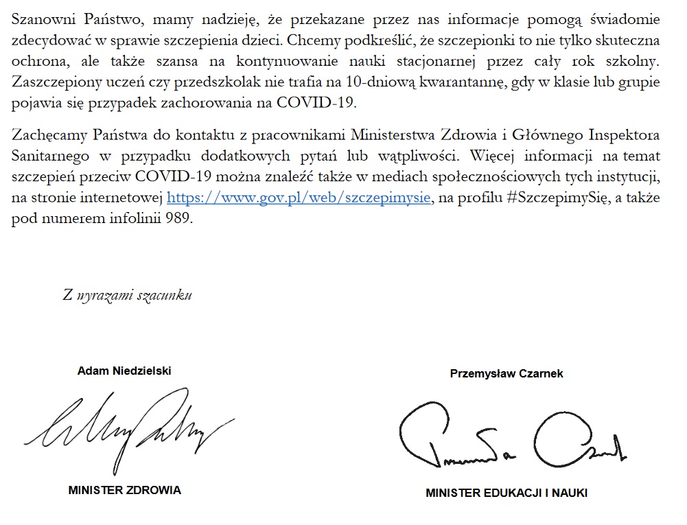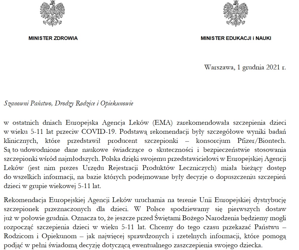 List Ministra Edukacji i Nauki oraz Ministra Zdrowia w sprawie szczepień dzieci w wieku 5-11 lat
