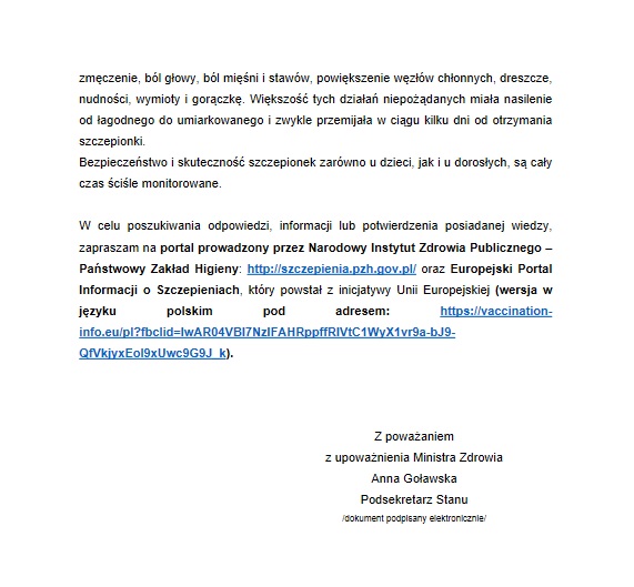 List Ministra Zdrowia do dyrektorów szkół, pedagogów, rodziców w sprawie wykonywania szczepienia przeciwko SARS-CoV-2 wśród nieletnich uczniów w wieku od 12 do 15 roku życia