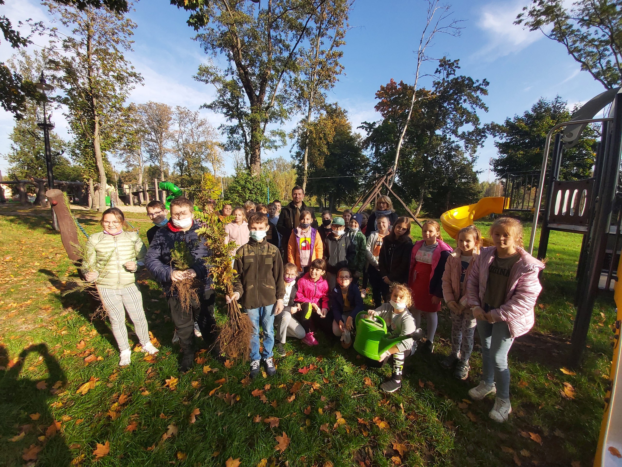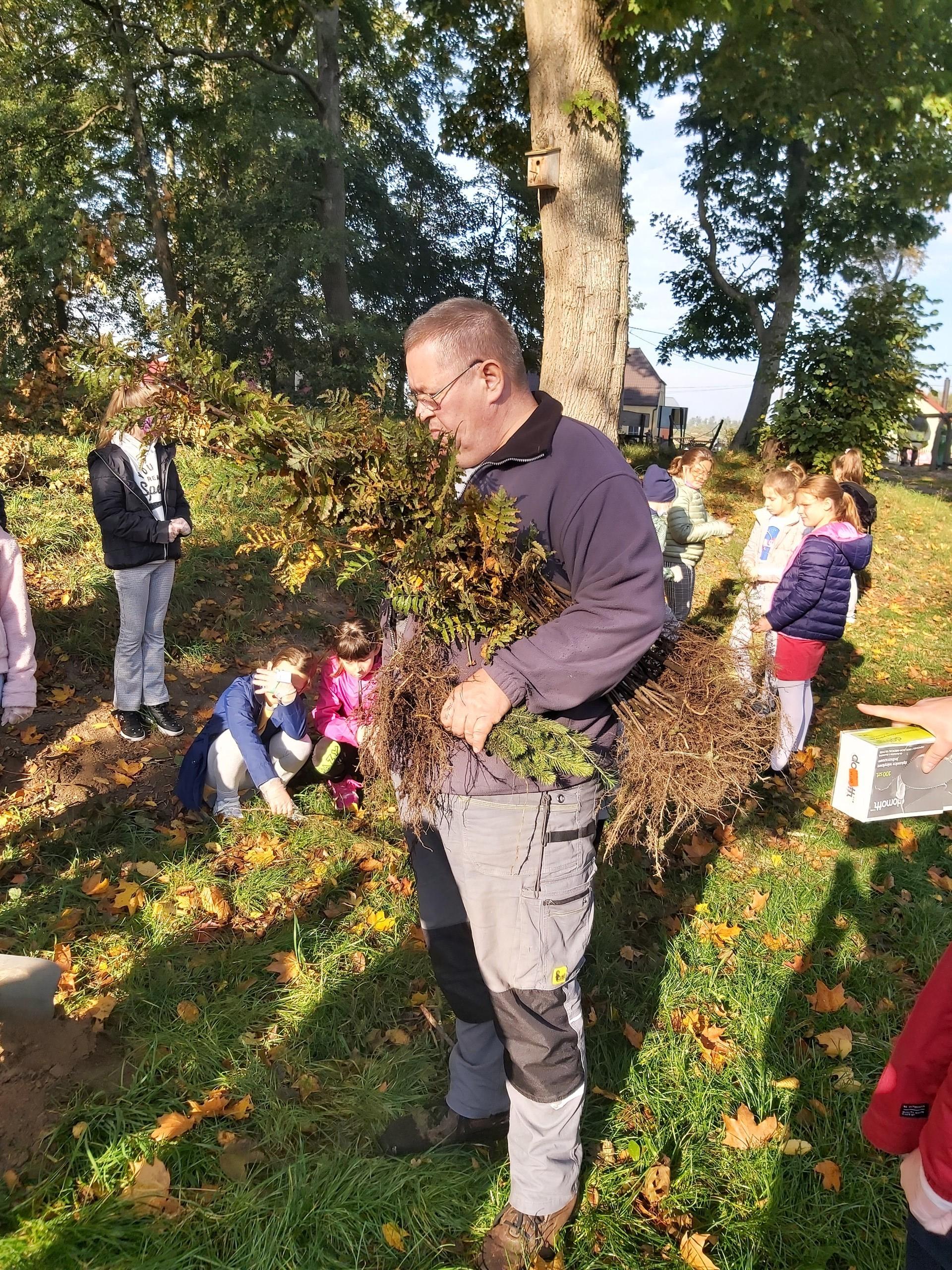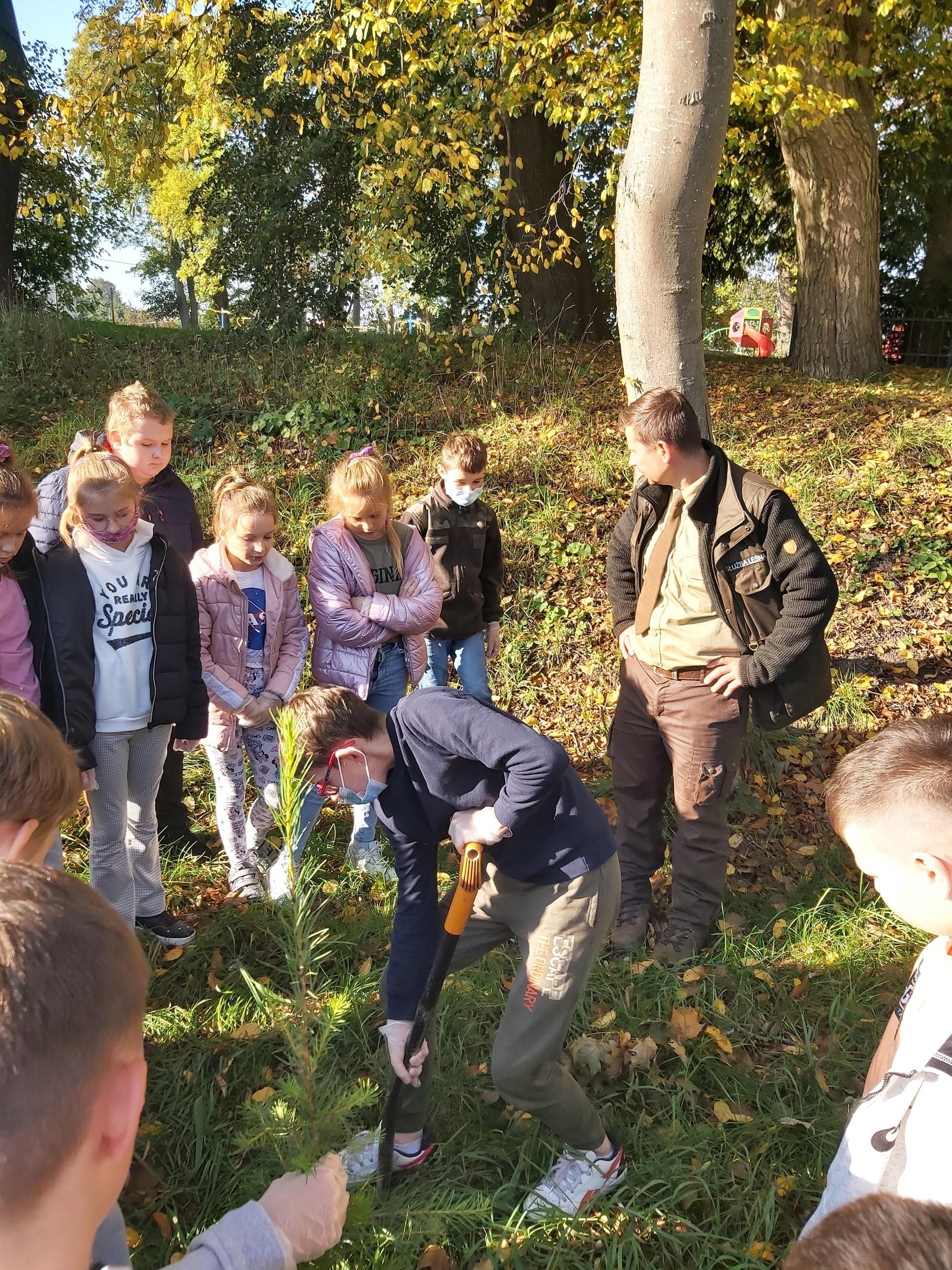 8 października 2021 roku w naszej szkole obchodziliśmy Międzynarodowy Dzień Drzewa, który wypada kalendarzowo - 10 października. Uczniowie naszej szkoły dokonali nasadzeń 40 sadzonek drzew iglastych i liściastych za Placem Zabaw w Wicku, czyli tzw. "Bagnem Shreka". Sadzonki otrzymaliśmy w prezencie od szkółki leśnej "Okalica", należącej do Nadleśnictwa Cewice. Głównie były to gatunki jarzębiny, modrzewia i świerku. Pan Paweł Grzenkowicz z Nadleśnictwa Lębork wyjaśnił sposób prawidłowego nasadzenia drzewek oraz ich prawidłowej pielęgnacji. Wcześniej na małej sali gimnastycznej z klasami czwartymi przeprowadził prelekcję na temat szeroko pojętej zrównoważonej gospodarki leśnej. Dzieci miały więc wyjątkową możliwość "od podstaw" wykopania dołka i zasadzenia drzewka. Dziękujemy z całego serca Nadleśnictwu Cewice za sadzonki oraz Nadleśnictwu Lębork za prelekcję, a Pani Iwonie Mielewczyk, naszej nauczycielce świetlicy, za organizację spotkania z leśnikiem.