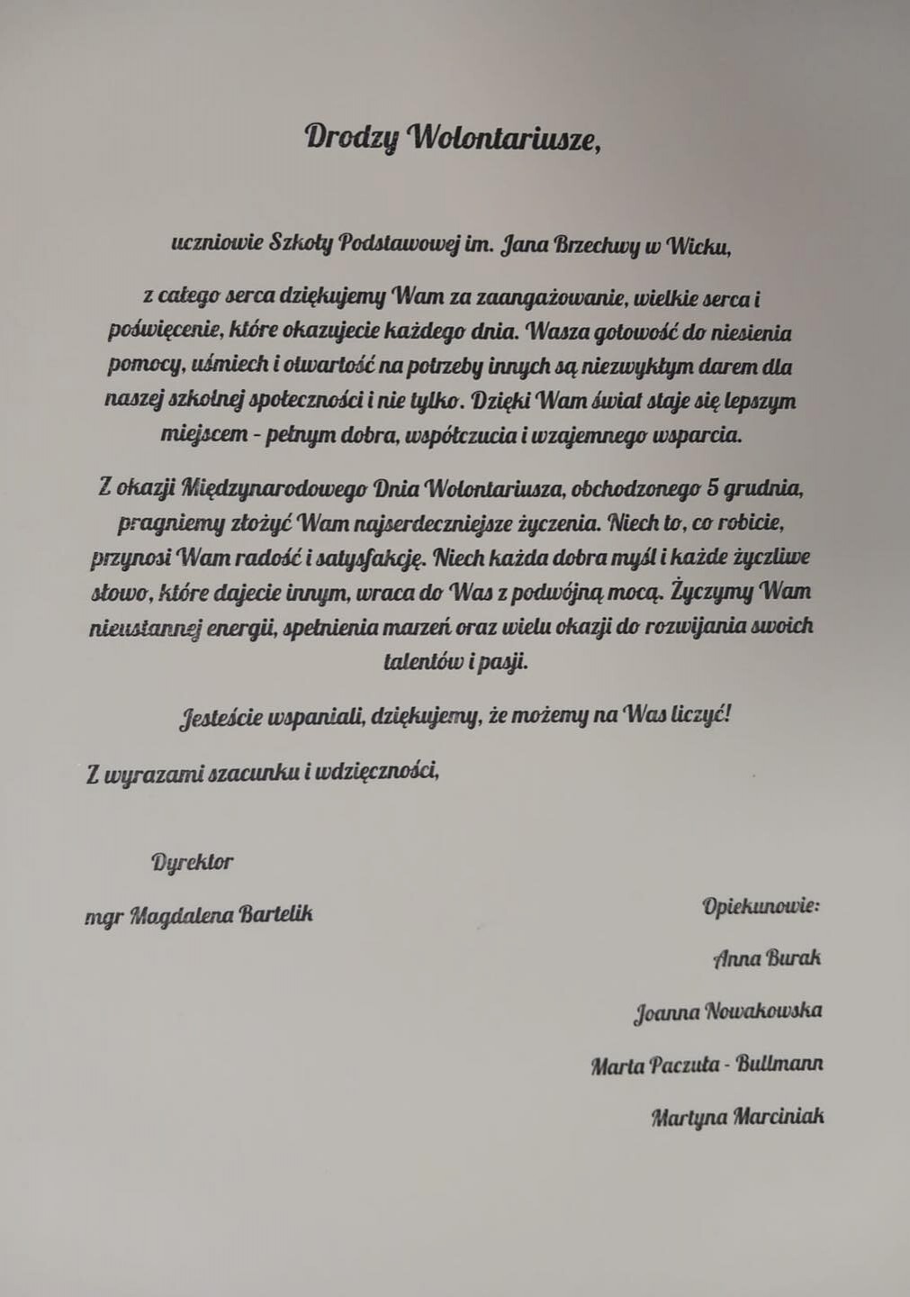 Z okazji Międzynarodowego Dnia Wolontariusza Pani Dyrektor Magdalena Bartelik podziękowała Wolontariuszom z naszej szkoły za Ich bezinteresowną pomoc, poświęcony czas i niezastąpione wsparcie.