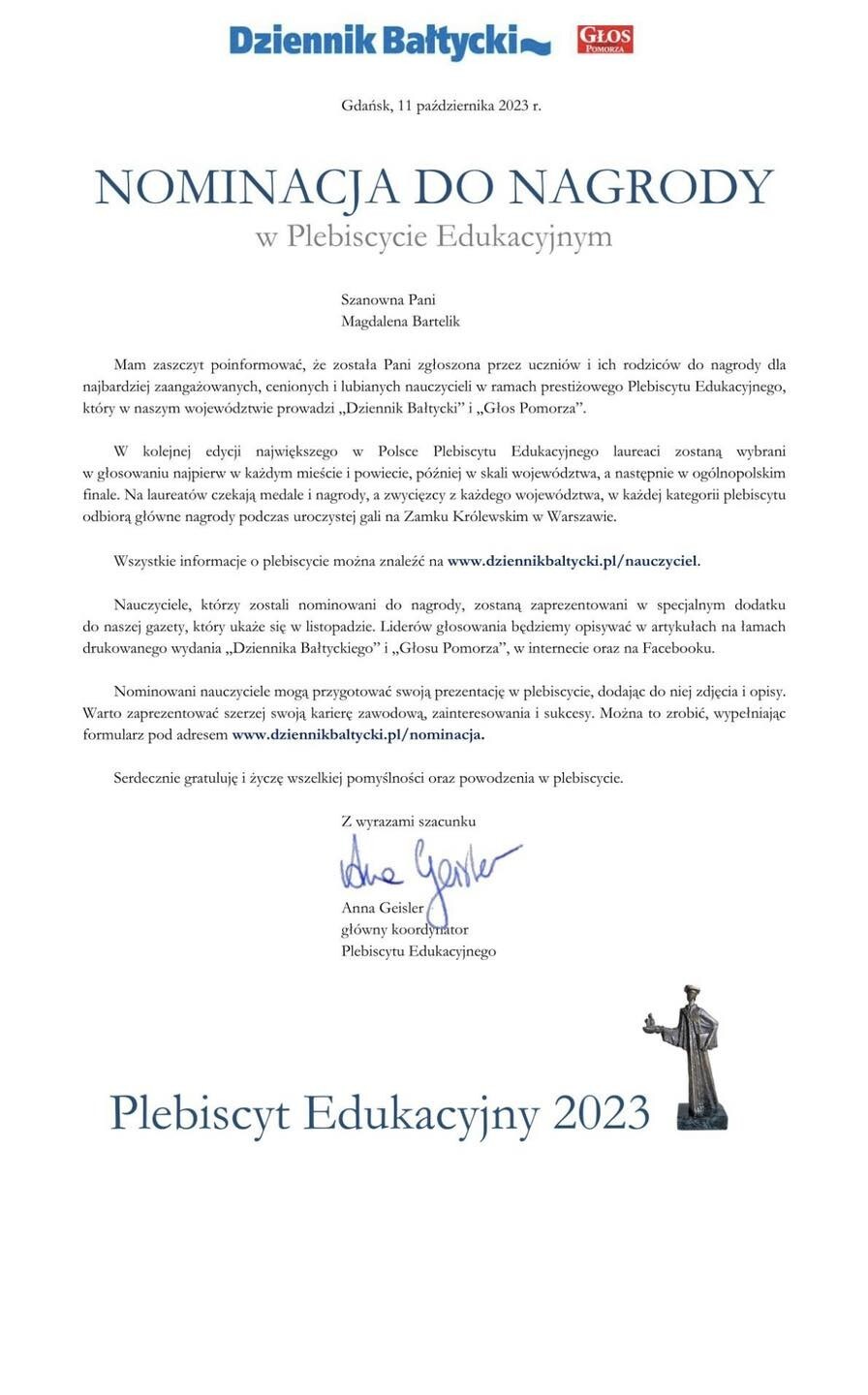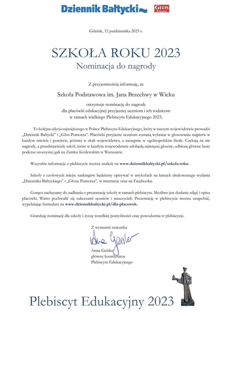 Zostaliśmy poinformowani przez redakcję „Dziennika Bałtyckiego" i „Głosu Pomorza", że Nasza Szkoła została zgłoszona przez uczniów i ich rodziców do nagrody w tegorocznej edycji Plebiscytu Edukacyjnego 2023.