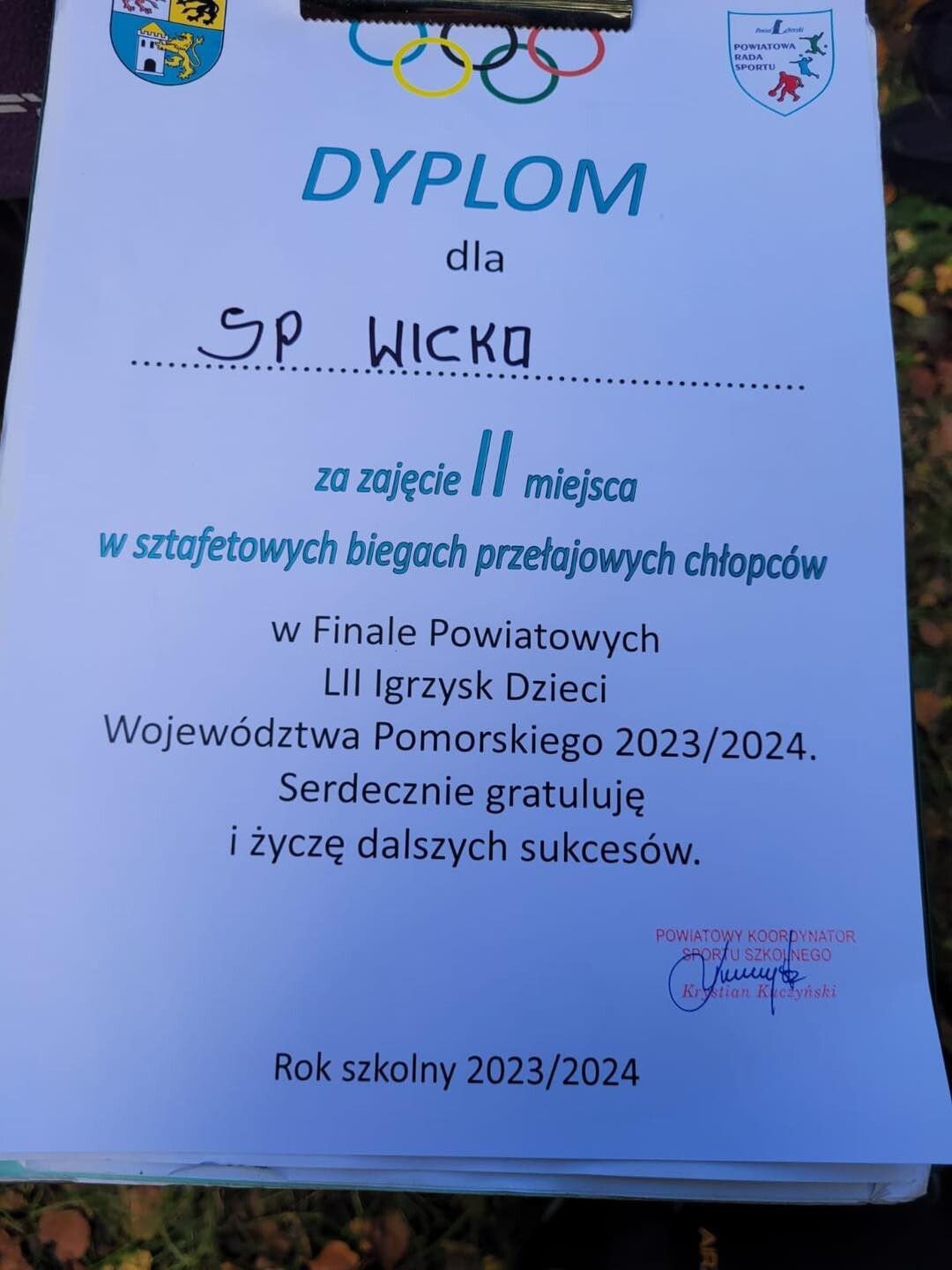 Duży sukces naszej drużyny w sztafetowych biegach przełajowych! Chłopcy młodsi w ramach Igrzysk Dzieci zajęli II miejsce w zawodach na szczeblu powiatowym. Sztafeta składała się z 6 zawodników, każdy z nich miał do przebiegnięcia dystans 800 m. Trasa była dość wymagająca, wyznaczona duktami leśnymi. Nasi uczniowie walczyli do samego końca, co się opłaciło, ponieważ na ostatniej zmianie wyprzedzili drużynę z Lęborka. Zwycięzcami zawodów została szkoła z Nowej Wsi Lęborskiej. Brawo!!!