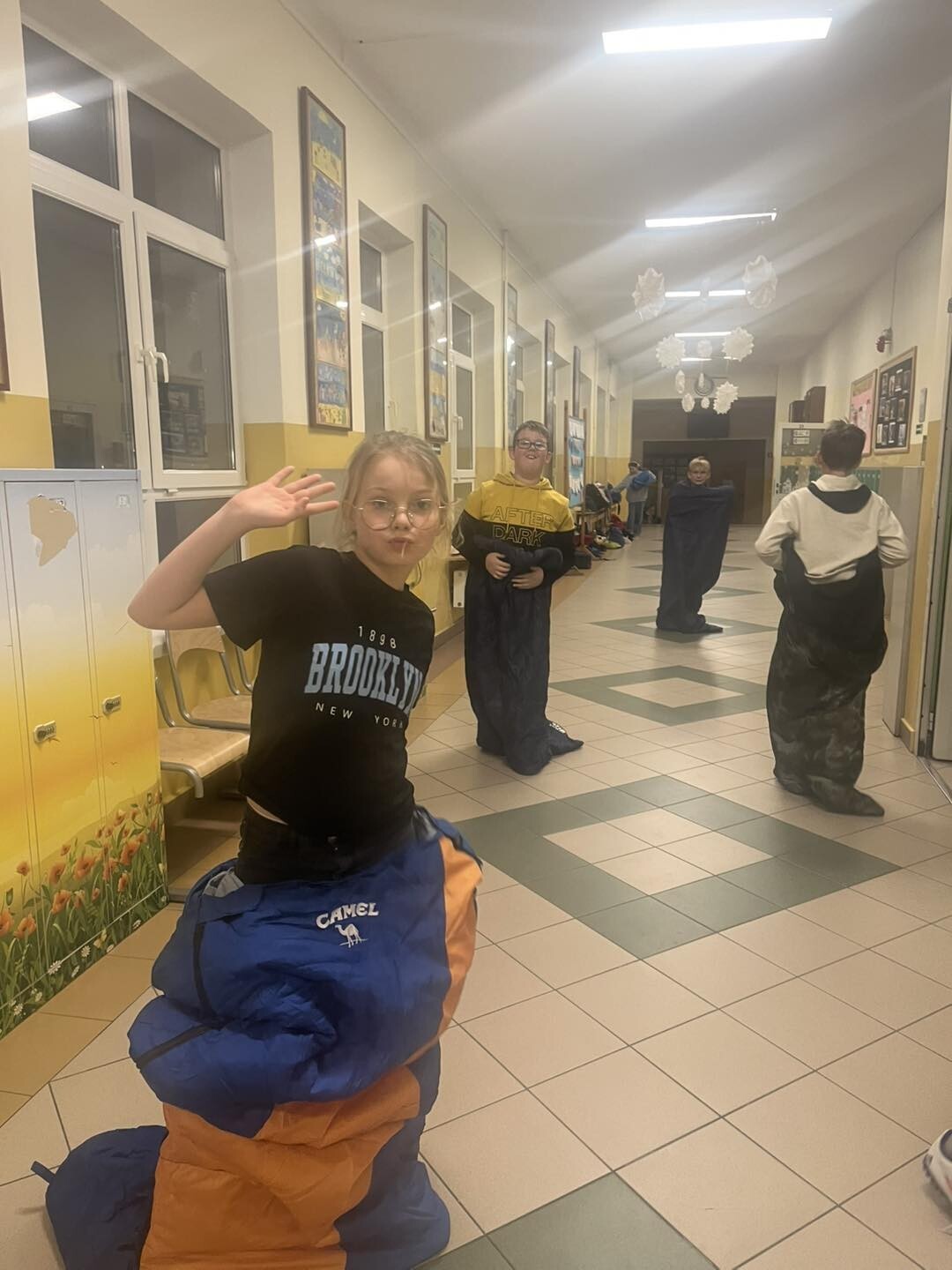 Tradycyjnie w programie były zabawy ruchowe. Tym razem był to wyścig w śpiworach i zajęcia na sali gimnastycznej. Nie mogło oczywiście zabraknąć zabawy w chowanego, pizzy z okazji Światowego Dnia Pizzy i seansu filmowego.