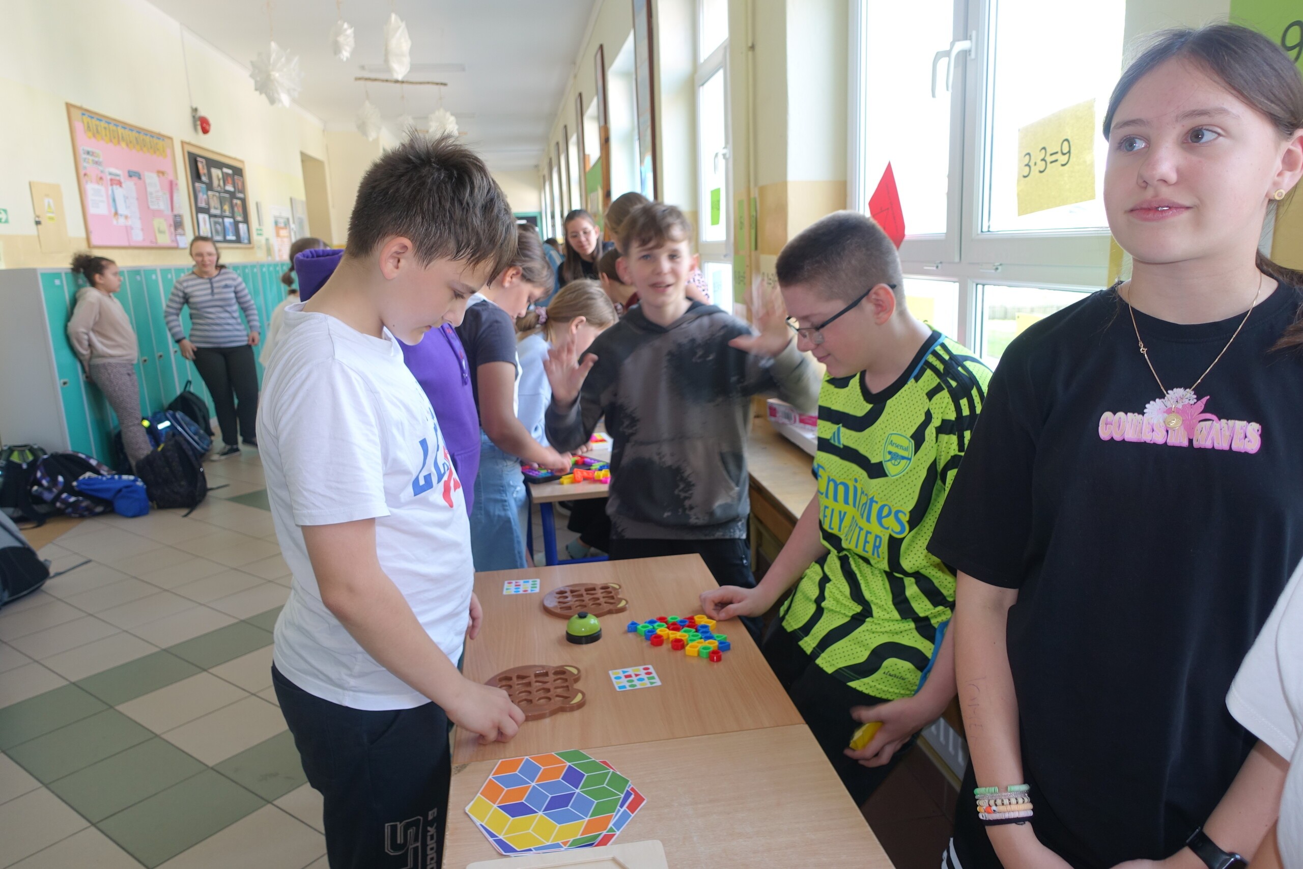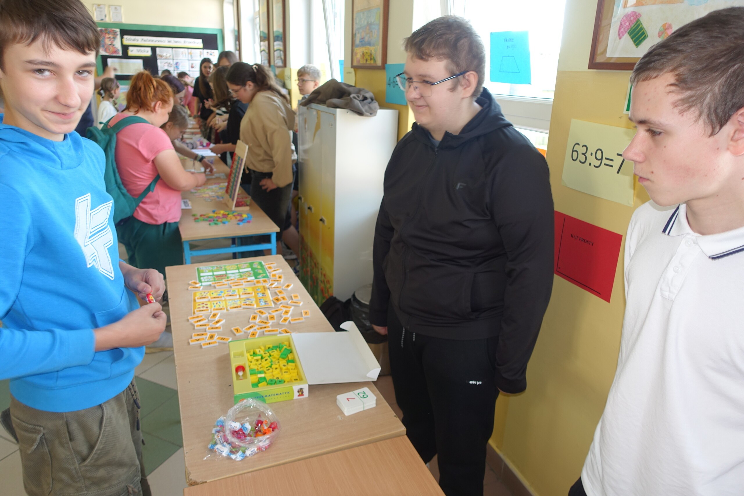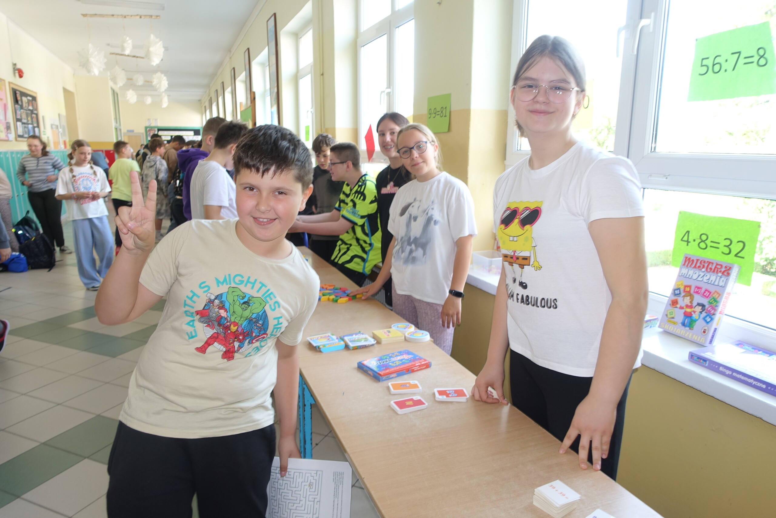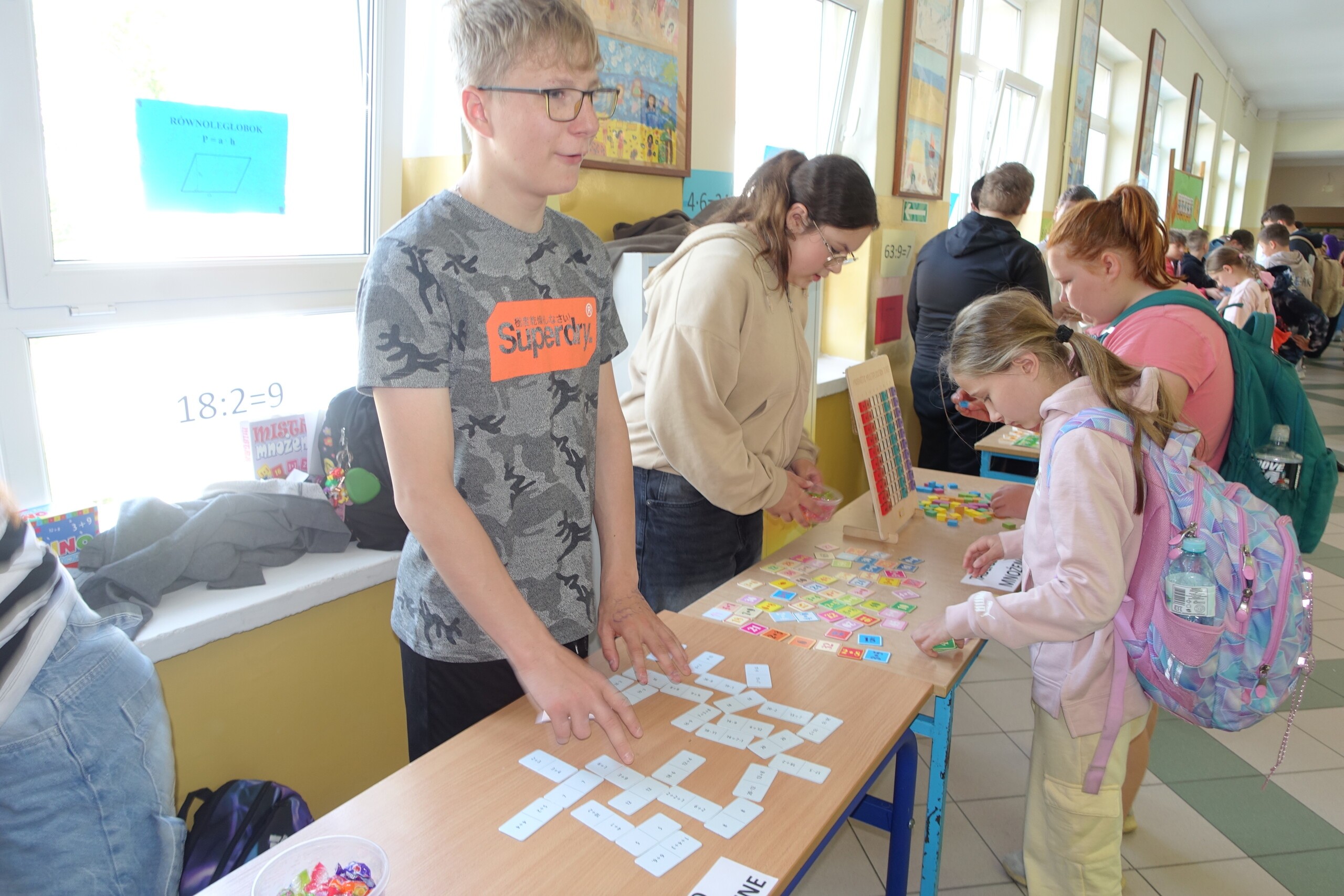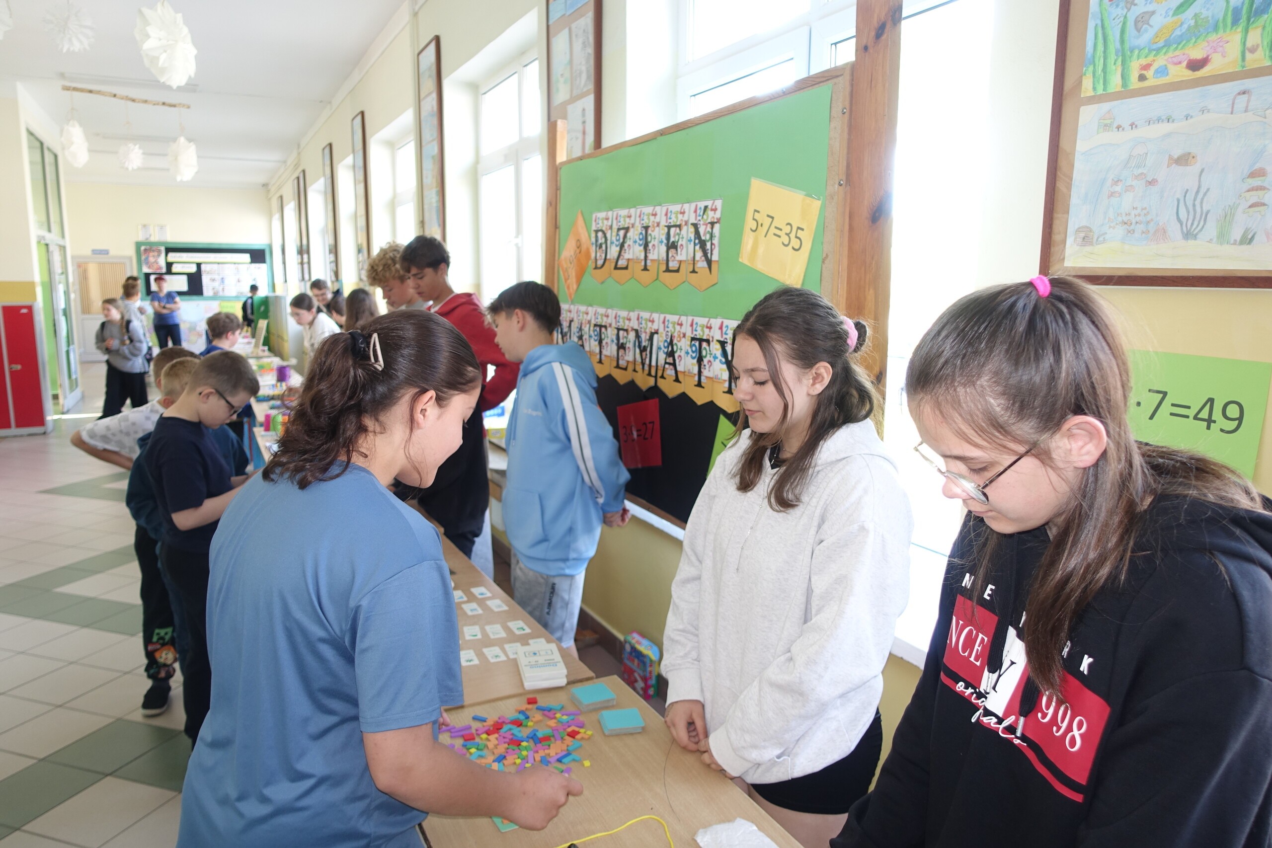 Dziś (12.06.2025) w naszej szkole odbyły się huczne obchody Dnia Matematyki, zorganizowane przez nauczycielki: Ewę Jańczuk, Renatę Maculewicz i Mirosławę Mordaszewską. Tego dnia, podczas przerw i pierwszych lekcji, na holu głównym działo się wiele matematycznie dobrego dla naszych uczniów. Cały korytarz był przepełniony stanowiskami, obsługiwanymi przez uczniów kl. VI-VII. Prezentowali oni młodszym uczniom różnorodne łamigłówki, gry logiczne, planszówki matematyczne, układanki liczbowe i całe bogactwo zabaw, które miały za zadanie stymulować ich umysły i zachęcać do mądrej zabawy.