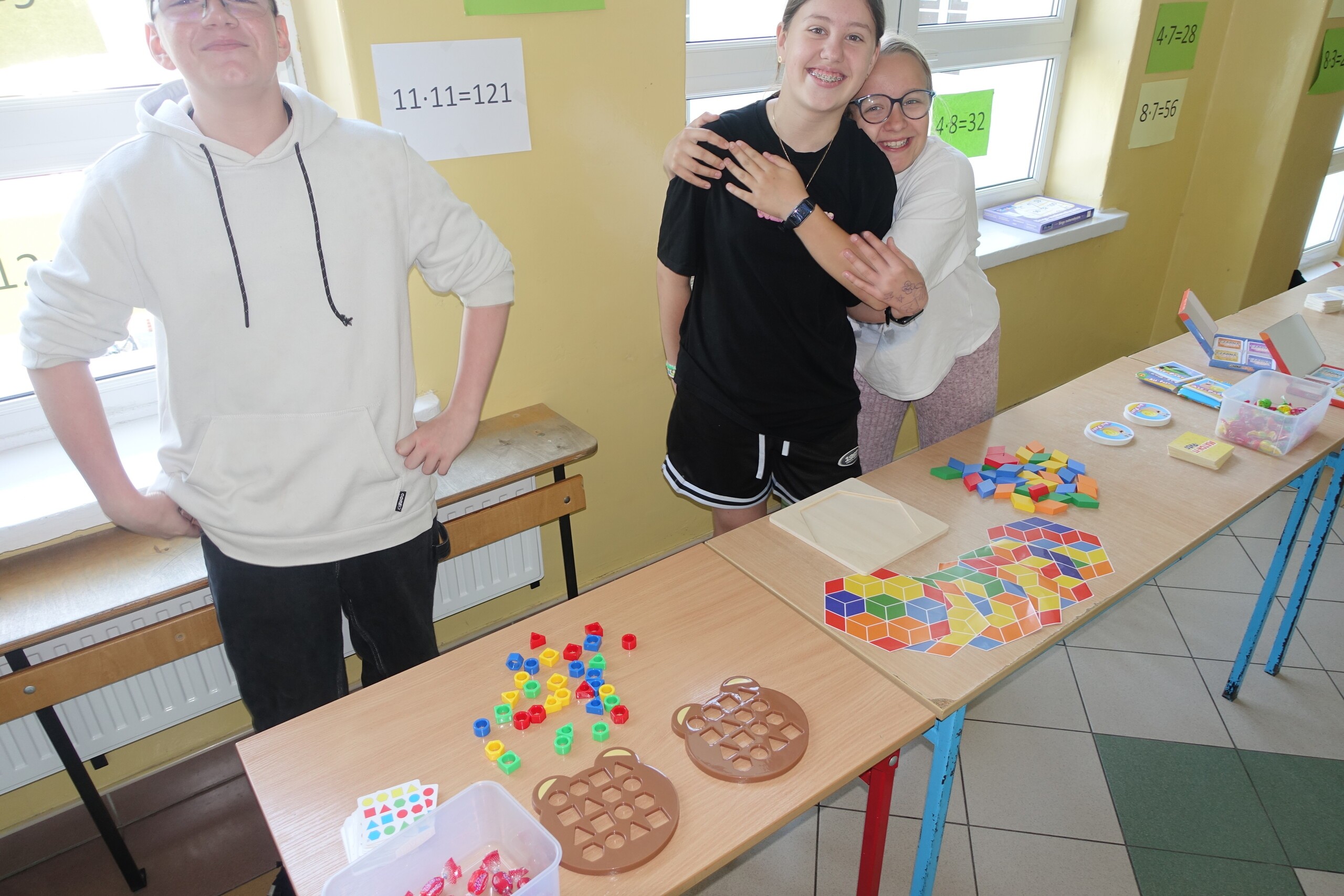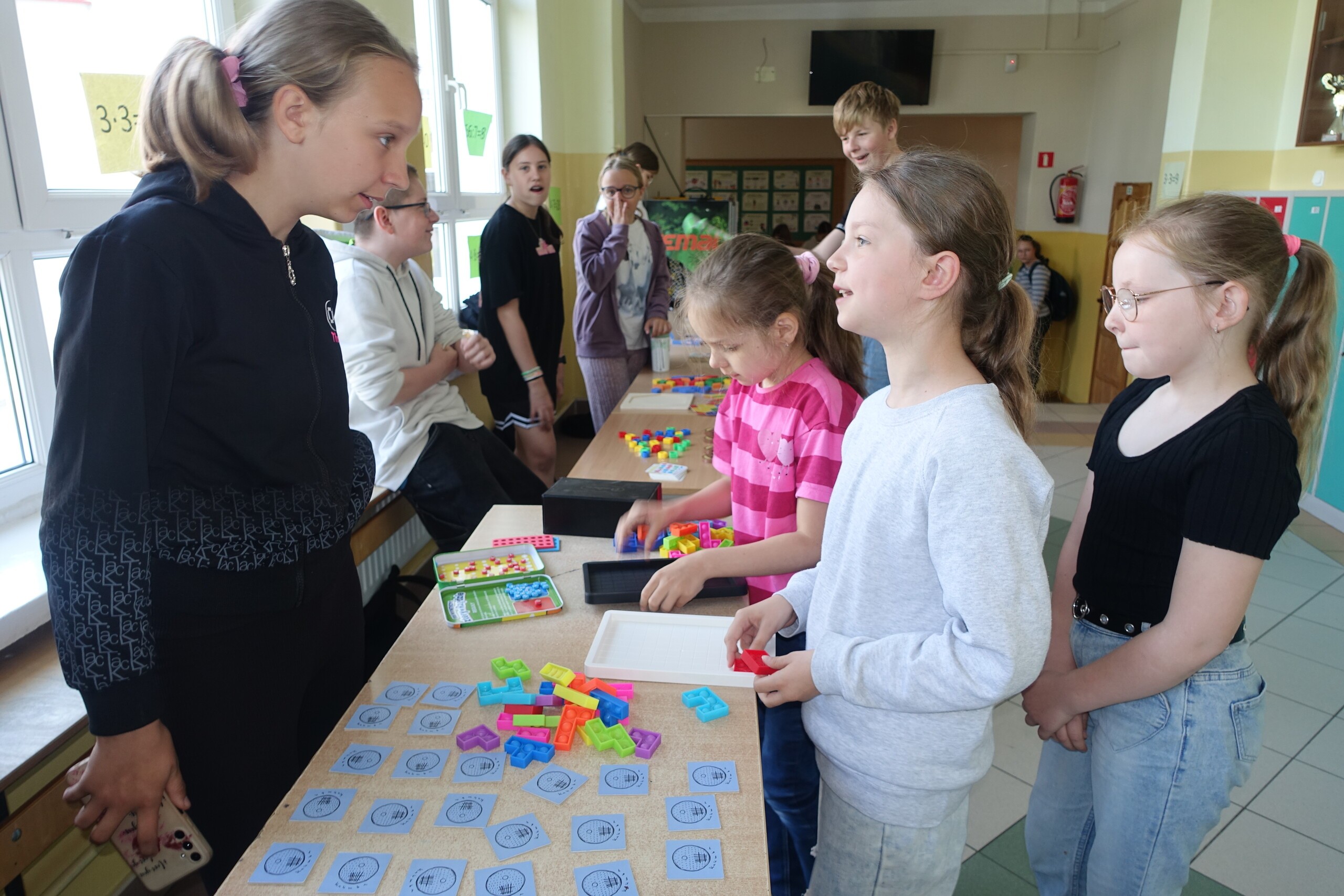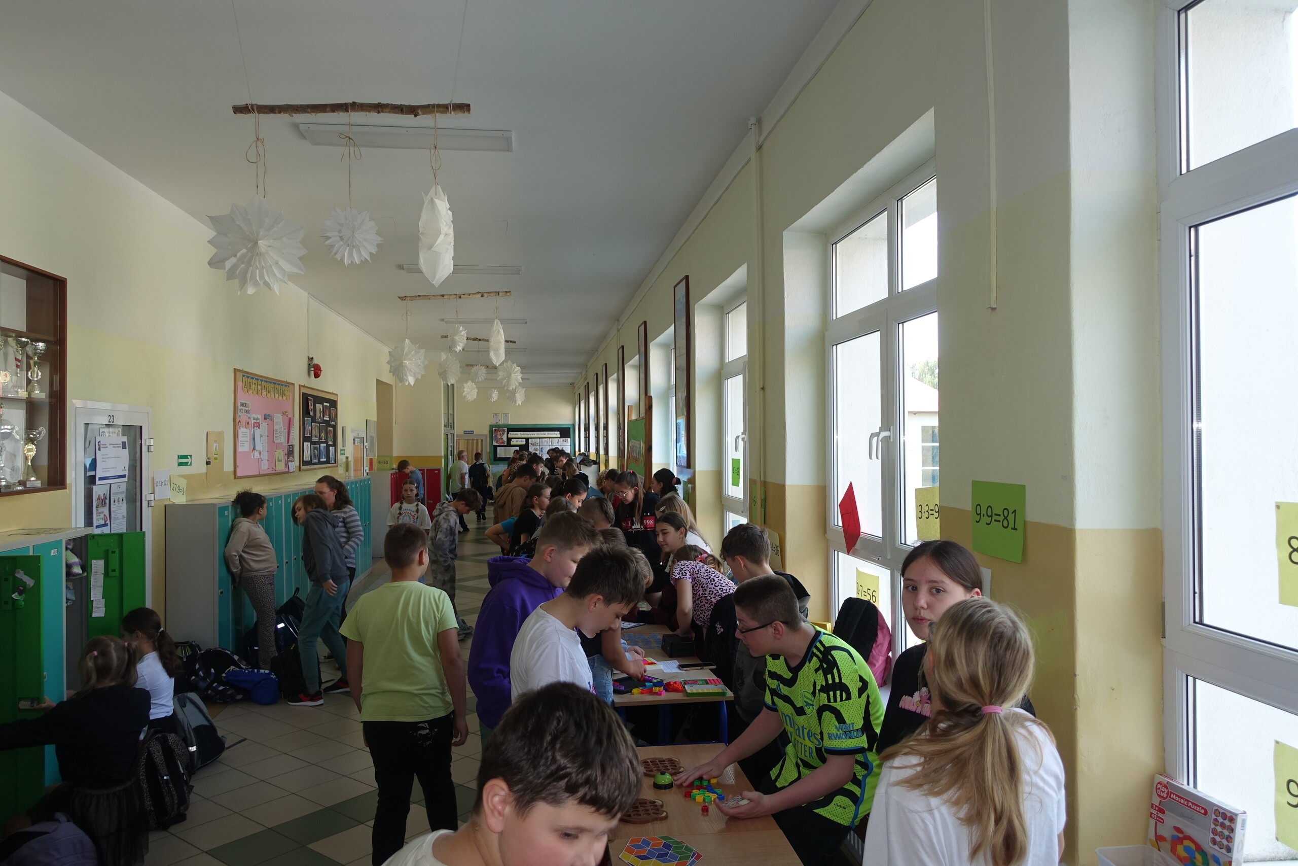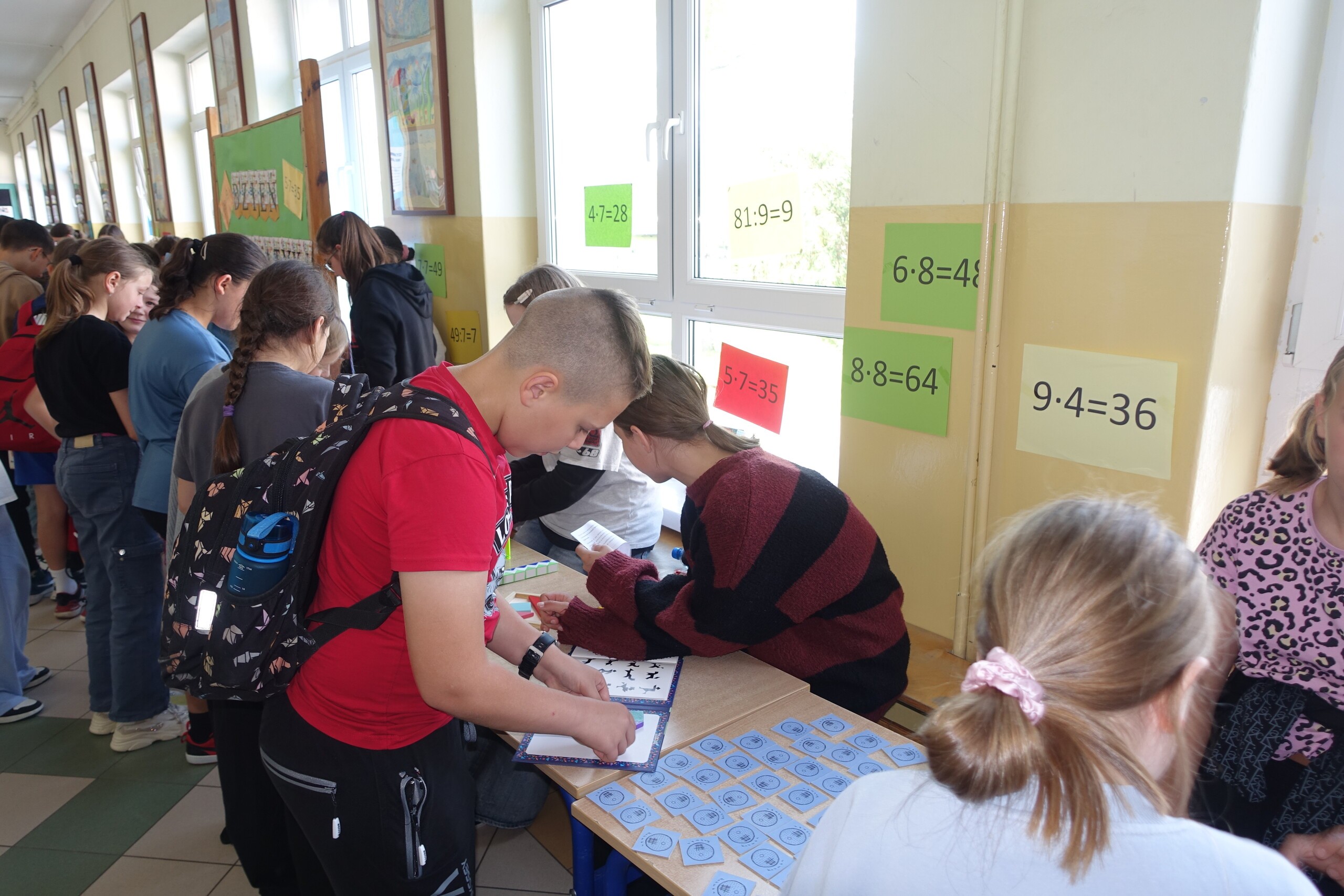 Dziś (12.06.2025) w naszej szkole odbyły się huczne obchody Dnia Matematyki, zorganizowane przez nauczycielki: Ewę Jańczuk, Renatę Maculewicz i Mirosławę Mordaszewską. Tego dnia, podczas przerw i pierwszych lekcji, na holu głównym działo się wiele matematycznie dobrego dla naszych uczniów. Cały korytarz był przepełniony stanowiskami, obsługiwanymi przez uczniów kl. VI-VII. Prezentowali oni młodszym uczniom różnorodne łamigłówki, gry logiczne, planszówki matematyczne, układanki liczbowe i całe bogactwo zabaw, które miały za zadanie stymulować ich umysły i zachęcać do mądrej zabawy.