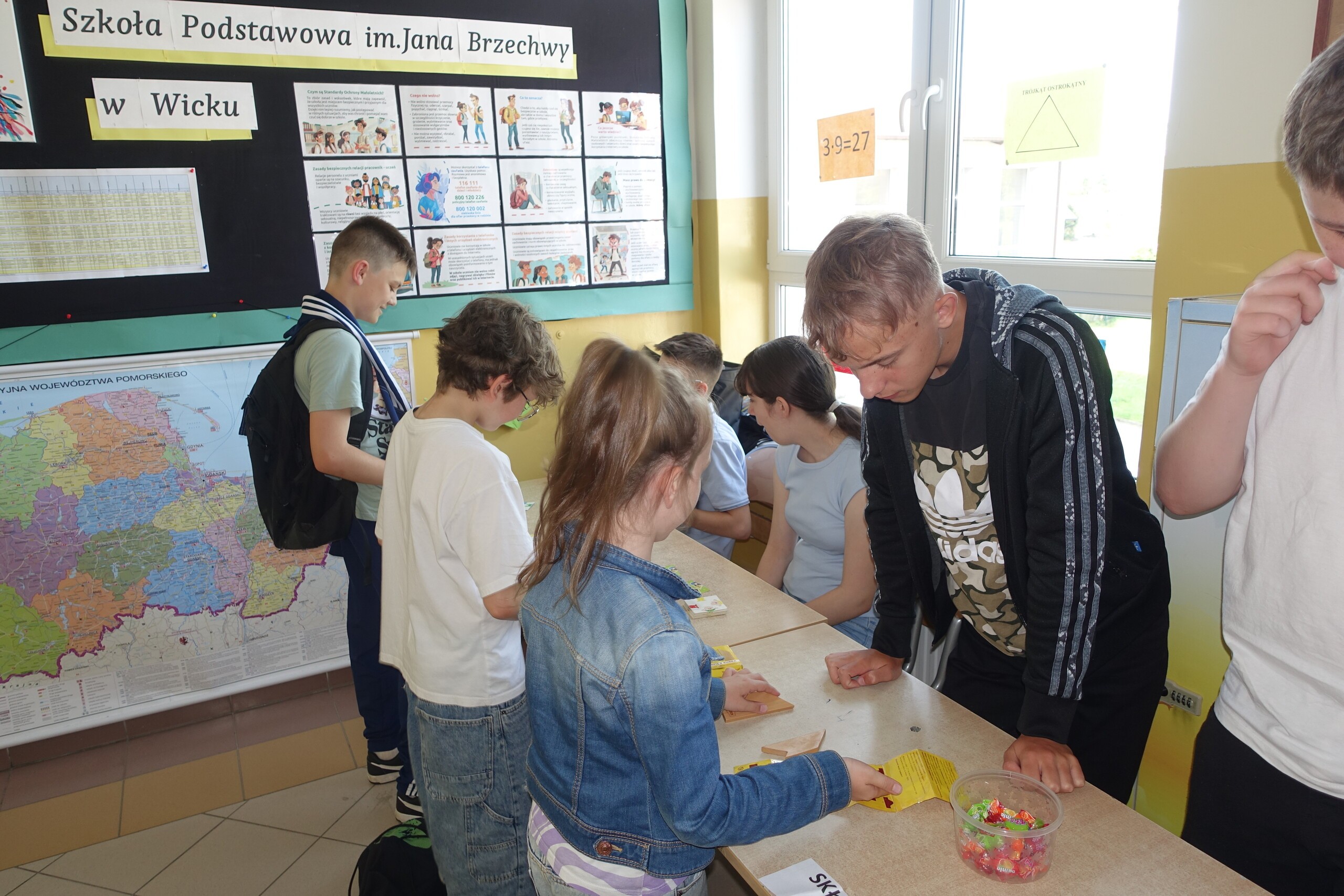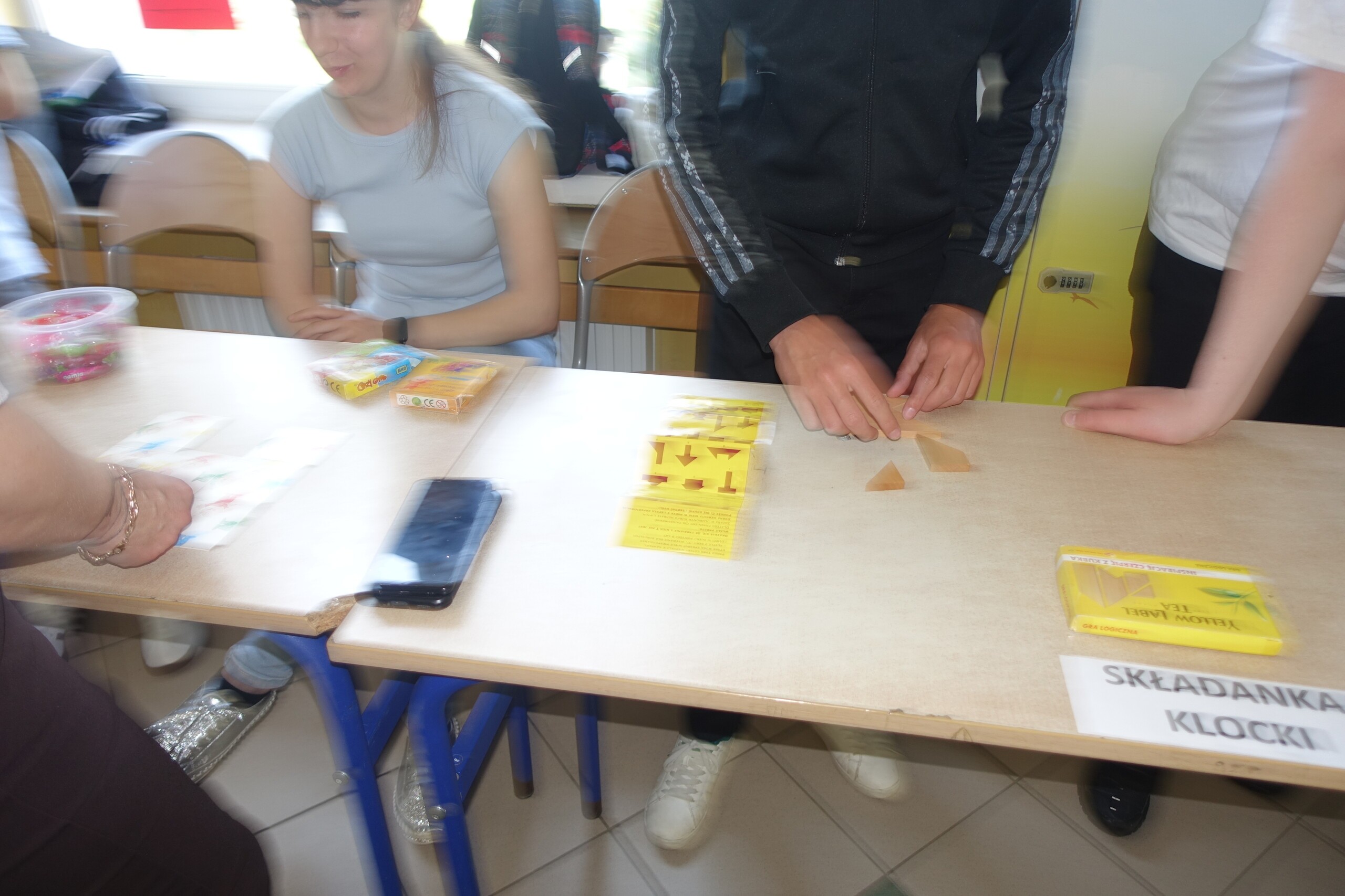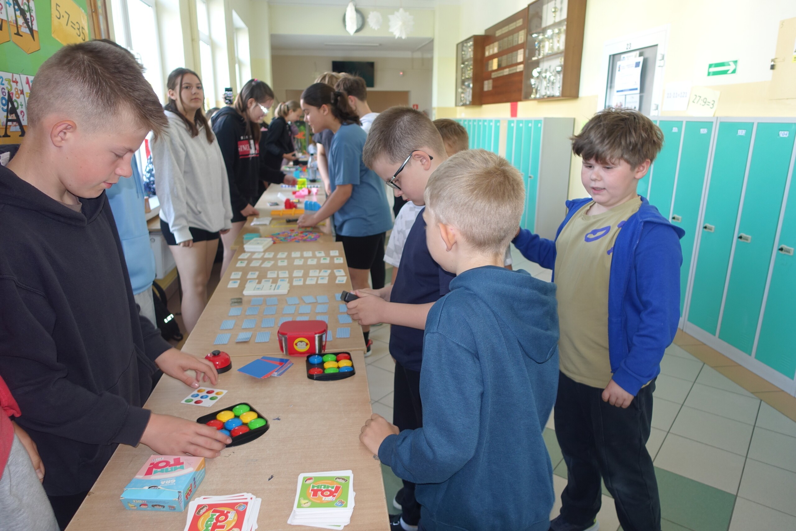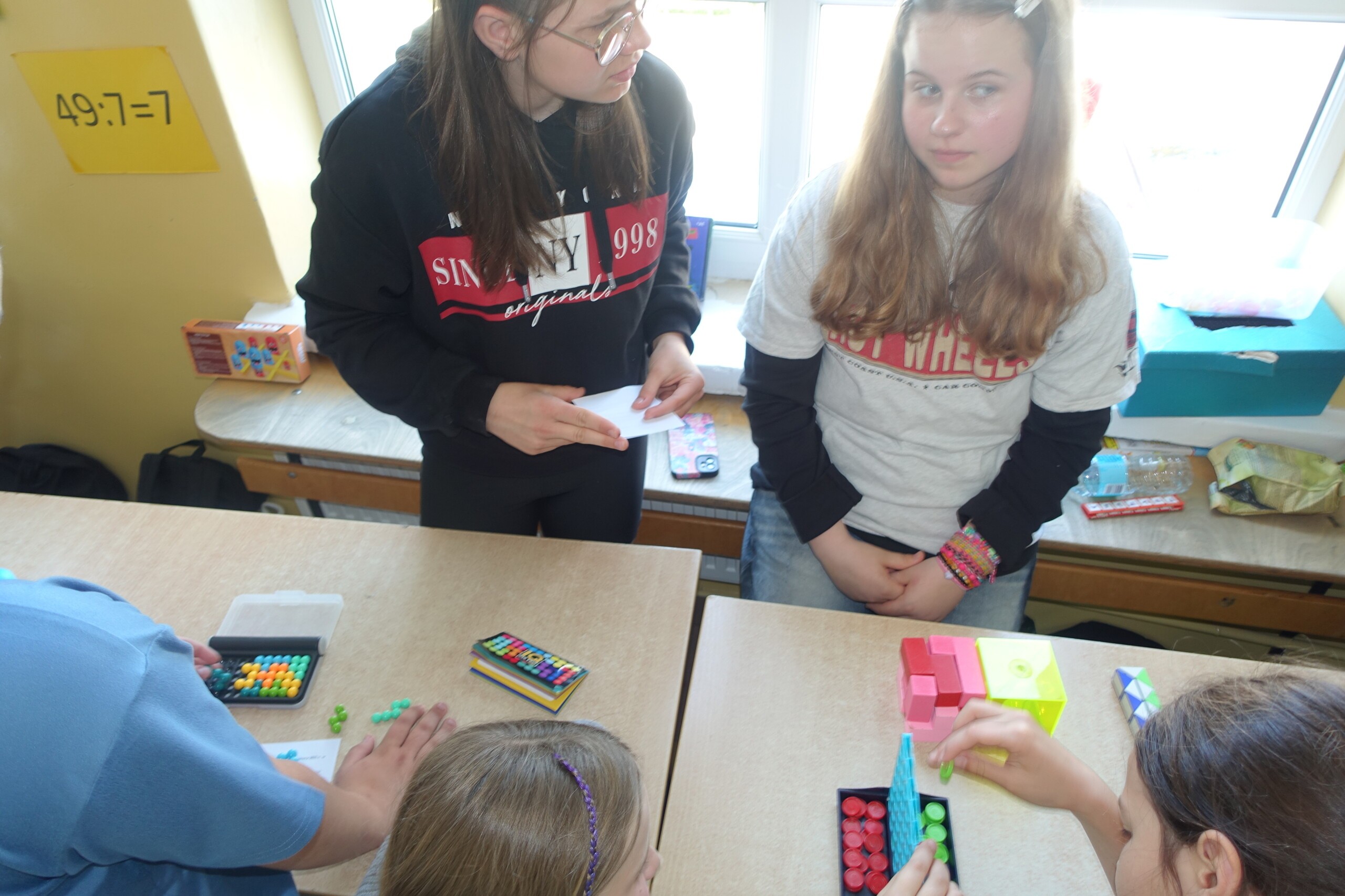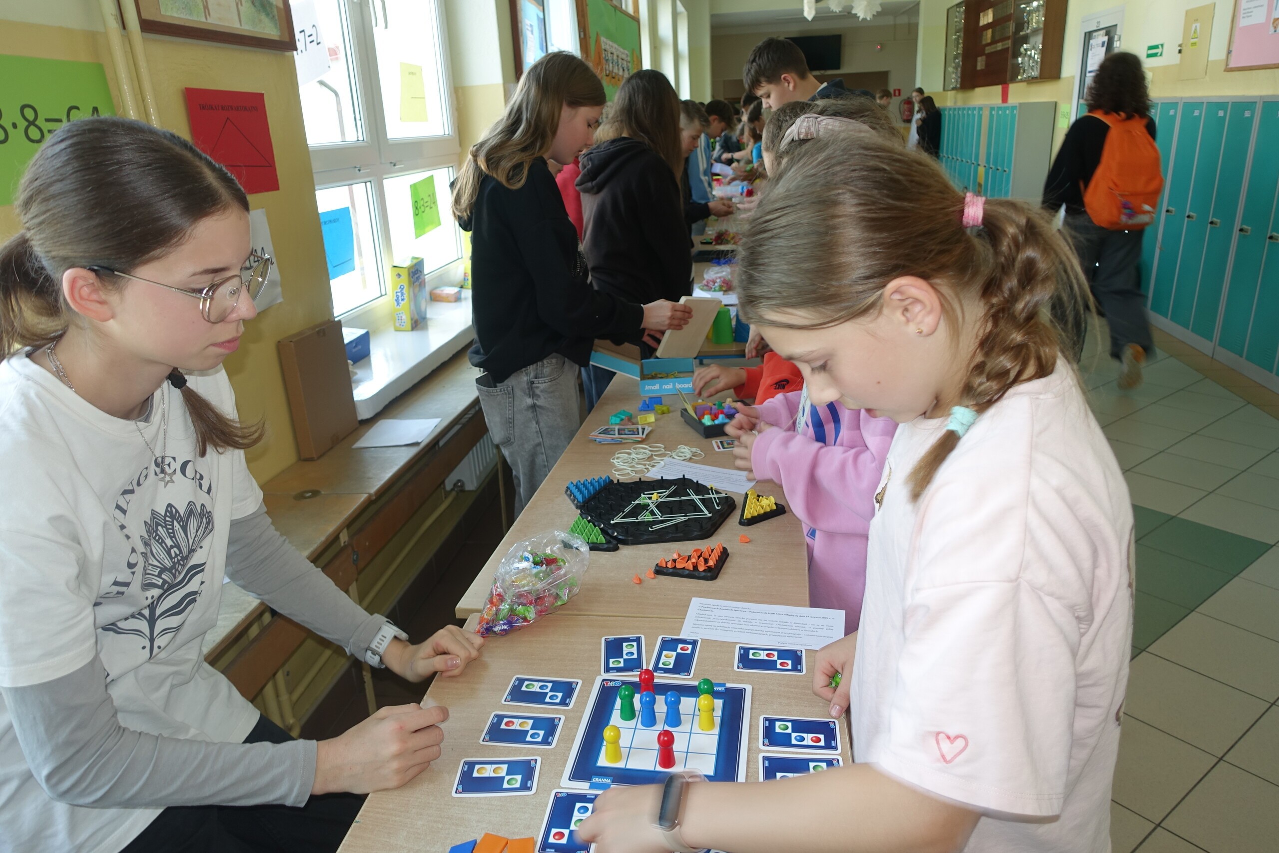 Dziś (12.06.2025) w naszej szkole odbyły się huczne obchody Dnia Matematyki, zorganizowane przez nauczycielki: Ewę Jańczuk, Renatę Maculewicz i Mirosławę Mordaszewską. Tego dnia, podczas przerw i pierwszych lekcji, na holu głównym działo się wiele matematycznie dobrego dla naszych uczniów. Cały korytarz był przepełniony stanowiskami, obsługiwanymi przez uczniów kl. VI-VII. Prezentowali oni młodszym uczniom różnorodne łamigłówki, gry logiczne, planszówki matematyczne, układanki liczbowe i całe bogactwo zabaw, które miały za zadanie stymulować ich umysły i zachęcać do mądrej zabawy.