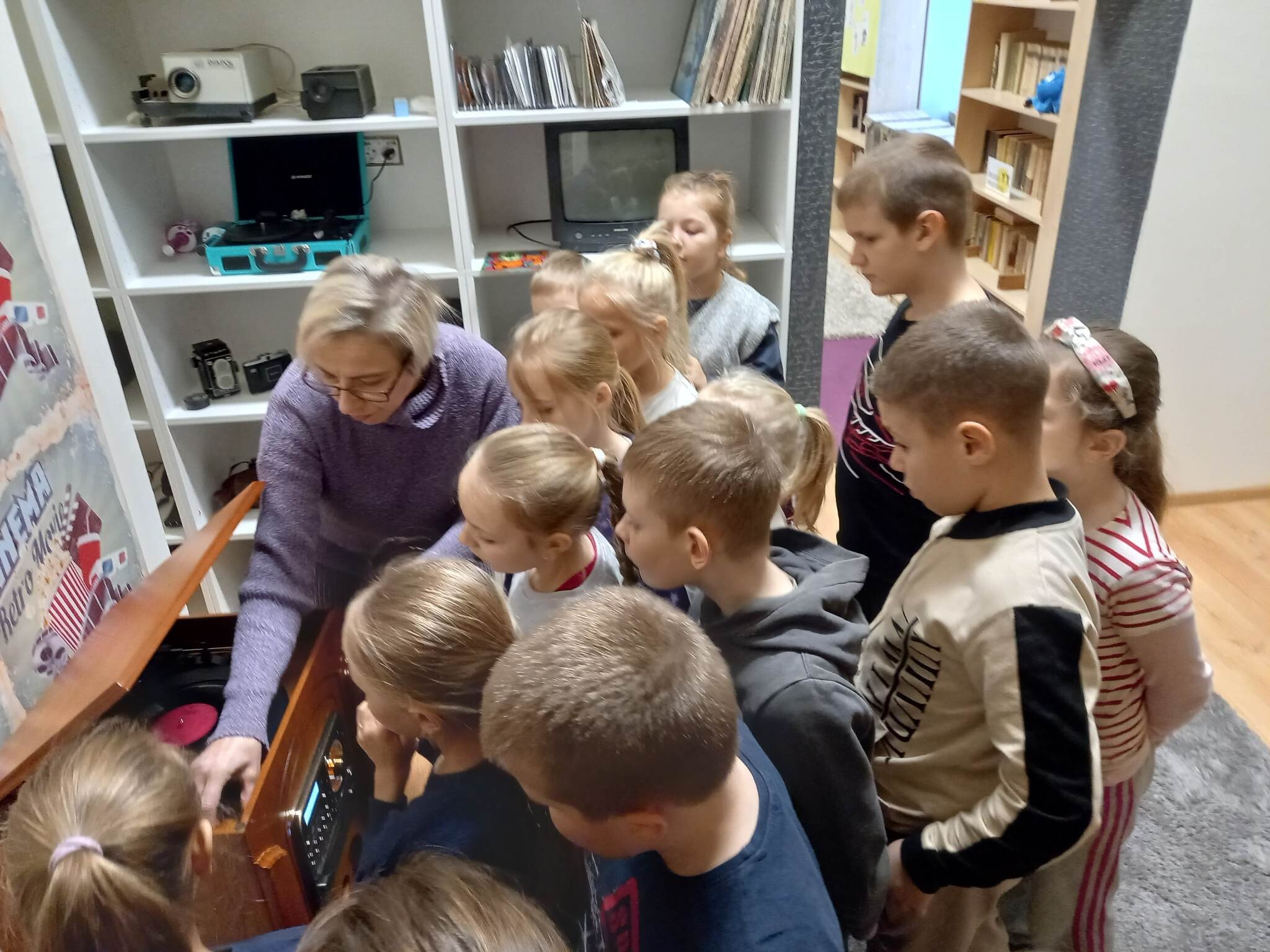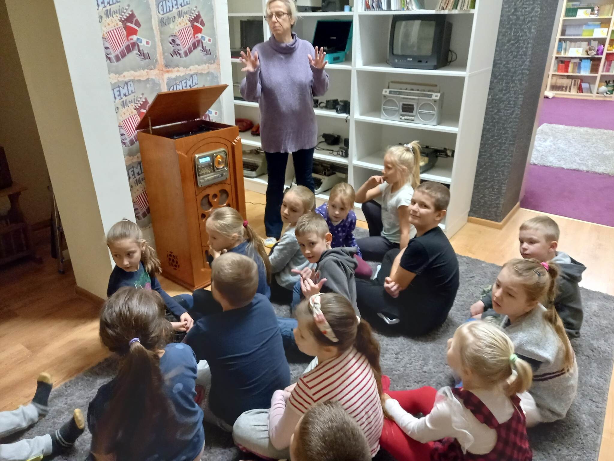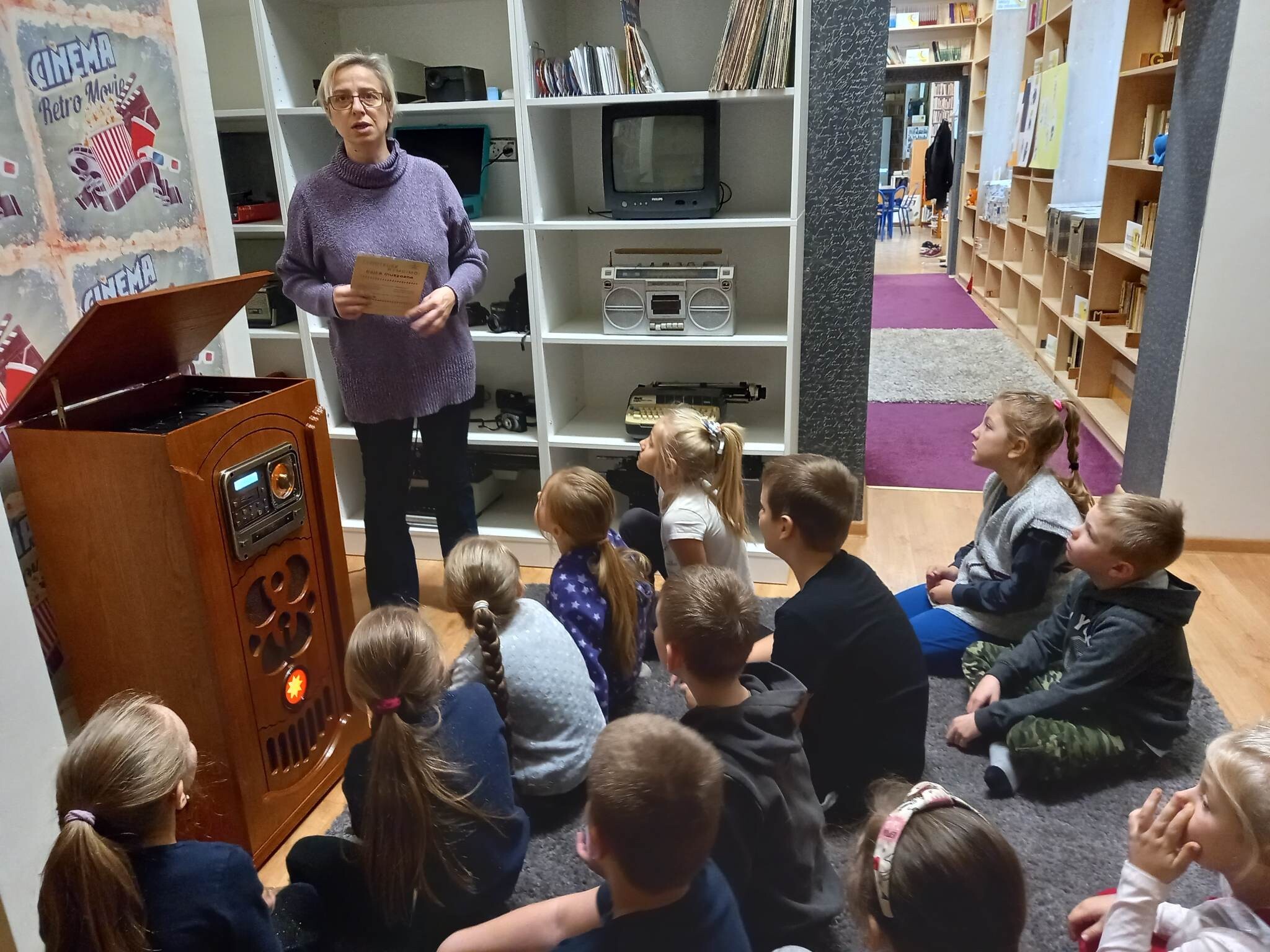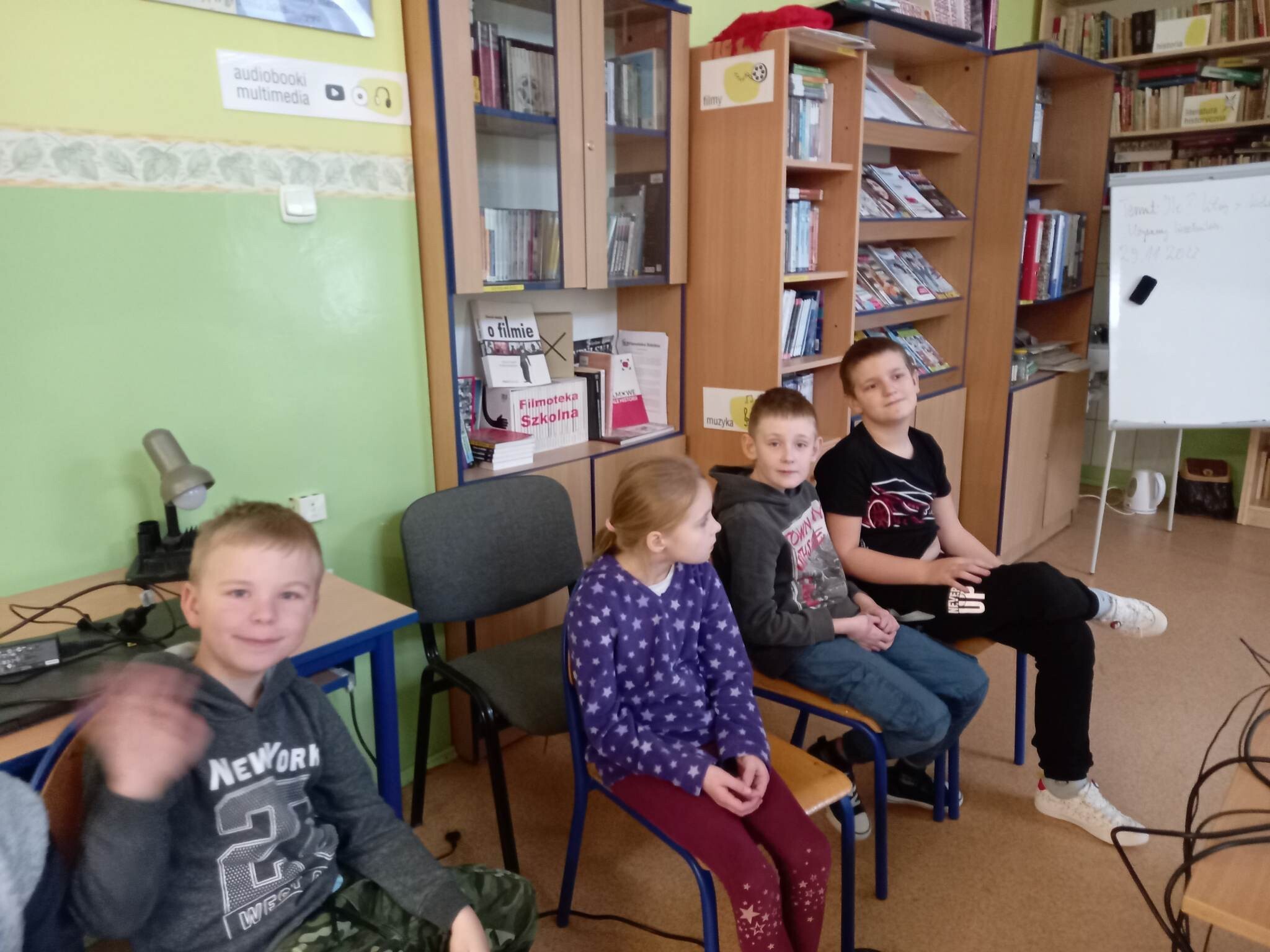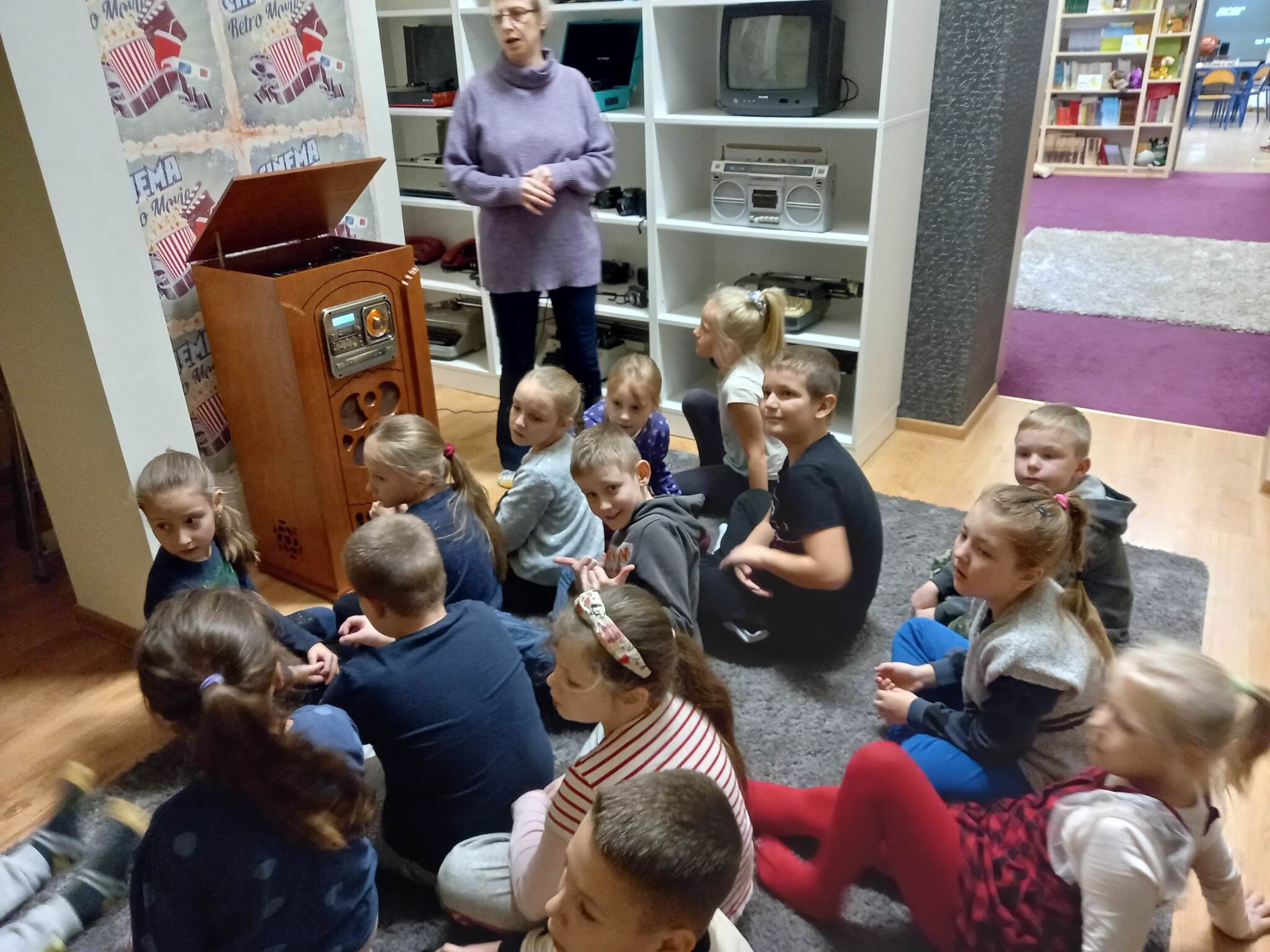 Równie ciekawie było w szkolnej bibliotece. Uczniowie kl. II zostali zaproszeni na zajęcia o misiach w literaturze, czyli o niedźwiedzich bohaterach bajek,baśni, legend i dobranocek. Na początku drugoklasiści zostali zaproszeni do nowej Mediateki, gdzie wysłuchali fragmentu bajki muzycznej na płycie winylowej o przygodach misia Rymcimci i psiuńcia autorstwa Jana Wilkowskiego.