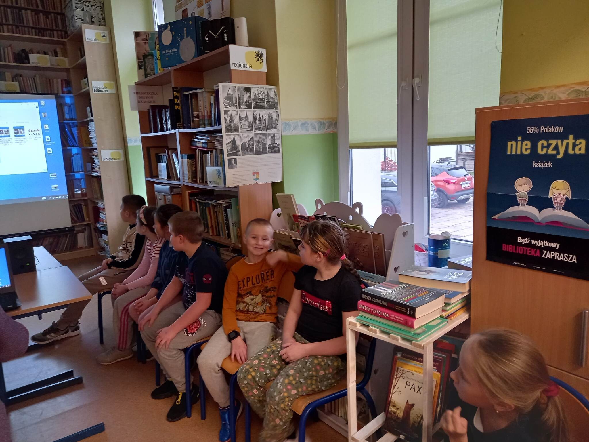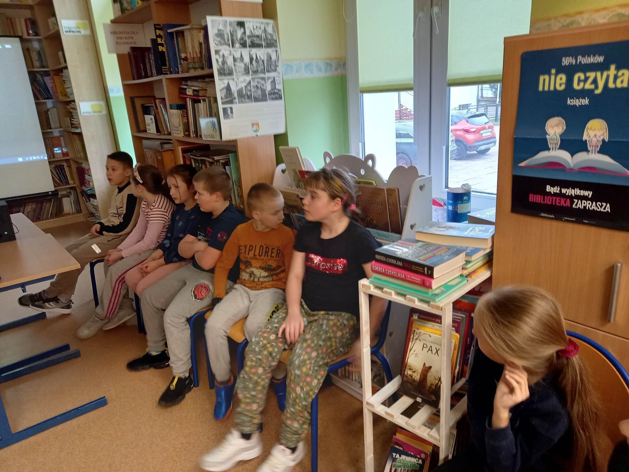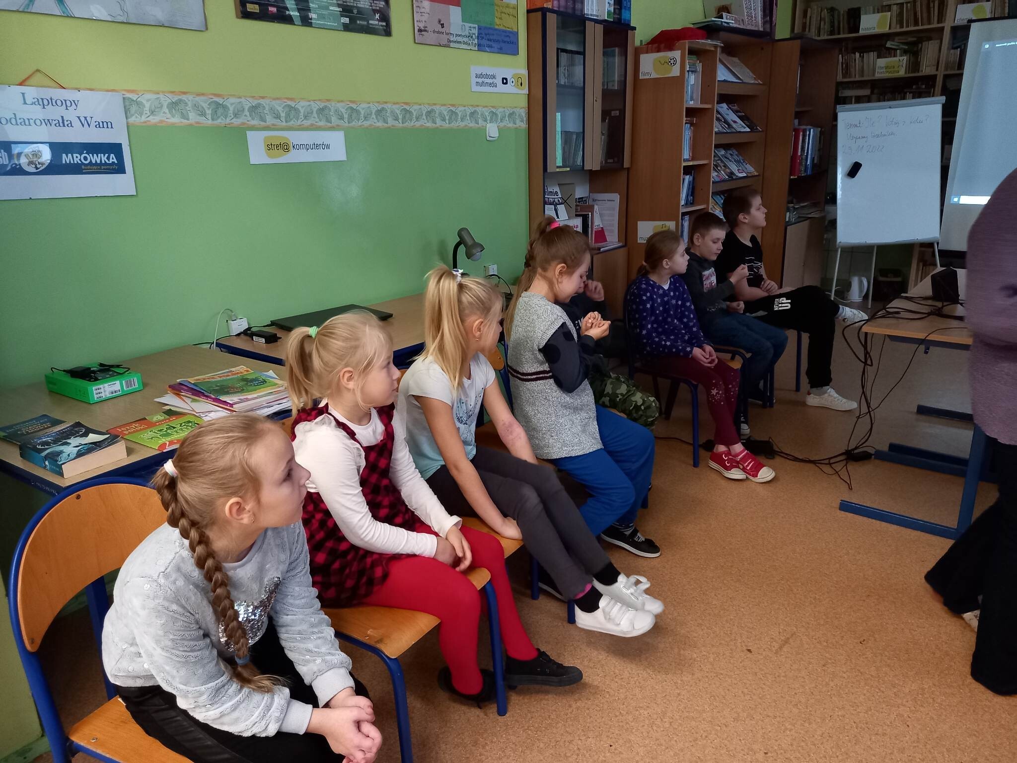 Następnie w "Narnii" - wypożyczalni dzieci omówiły z bibliotekarką dostępne w Bibliotece SP Wicko książki o misiach, a potem już w części medialnej obejrzały cykl krótkich filmów, z których dowiedziały się o popularnych polskich oraz zagranicznych "misowych" dobranockach, a także o prawdziwym bohaterze z czasów II wojny światowej, Misiu Wojtku, który pomagał polskim żołnierzom podczas działań wojennych, a potem trafił do ogrodu zoologicznego w Edynburgu.