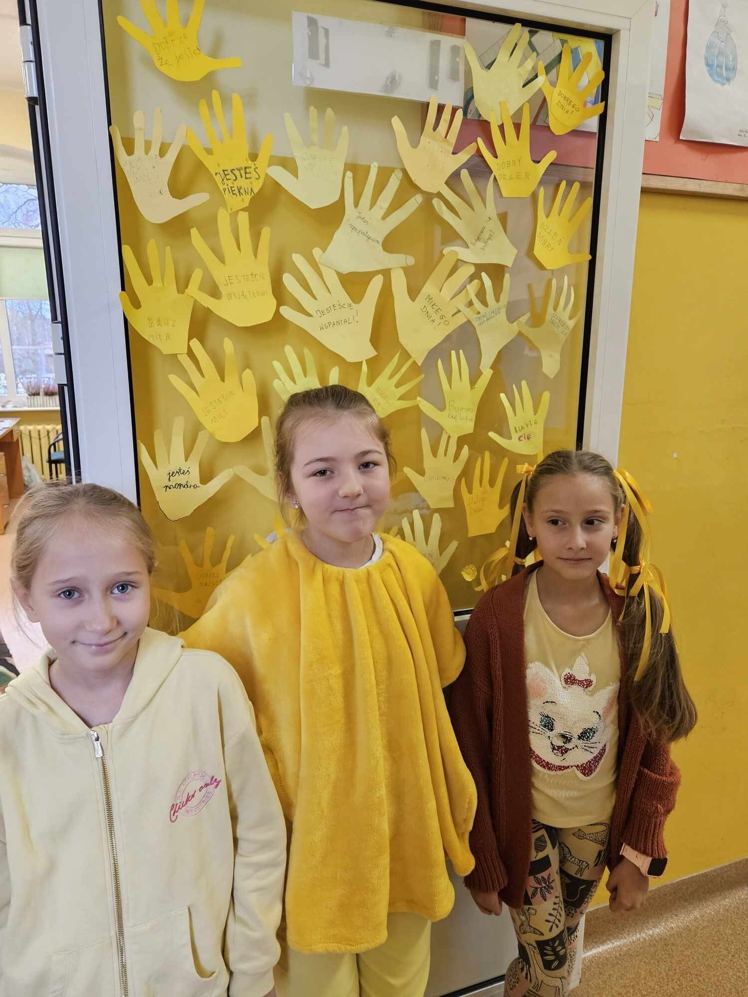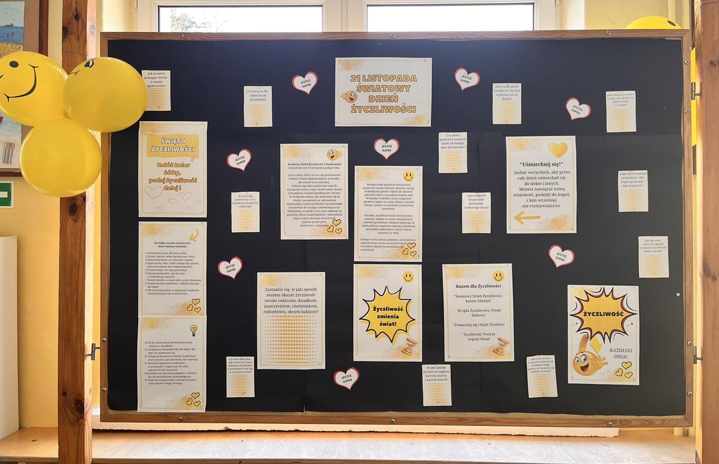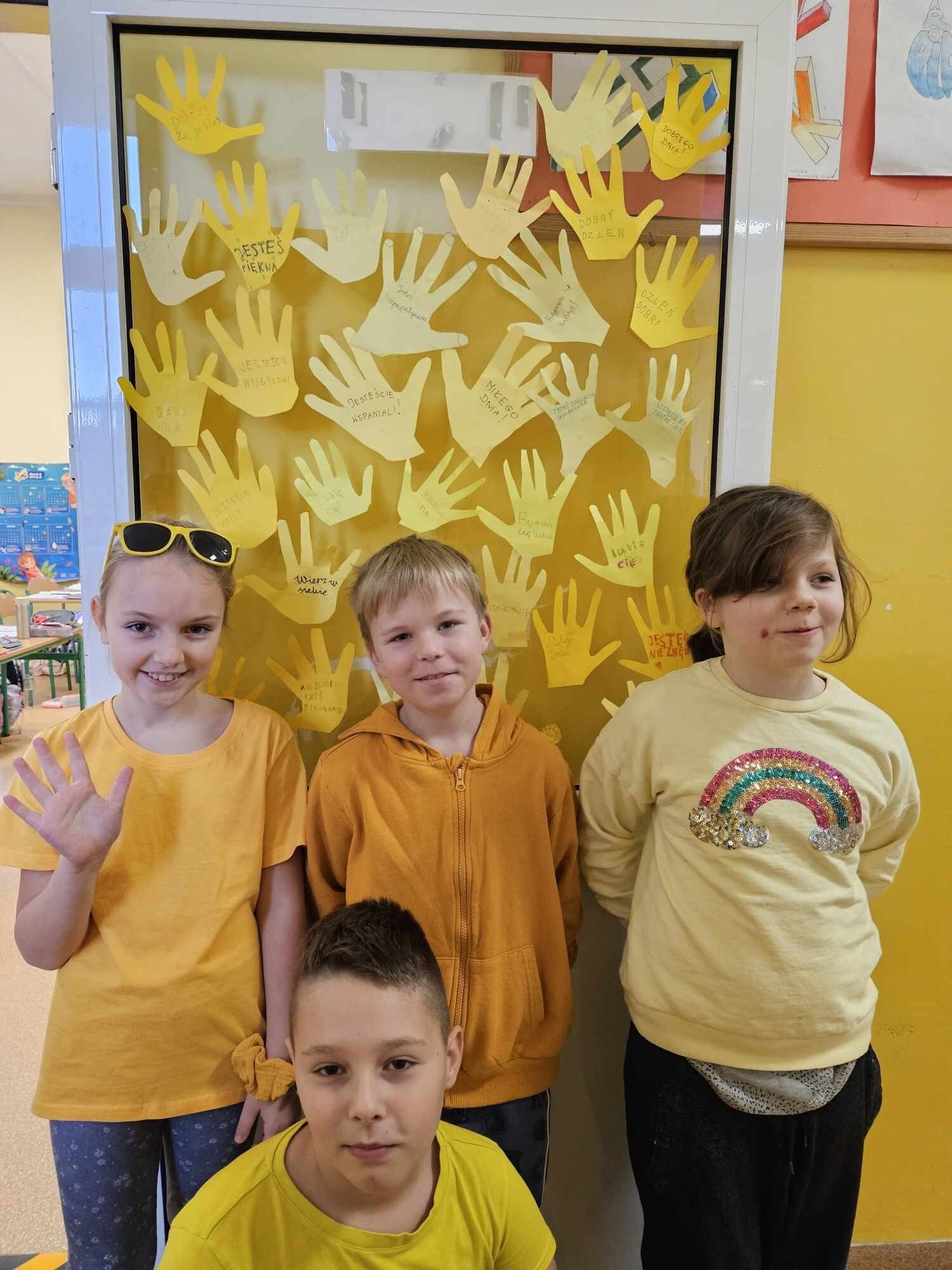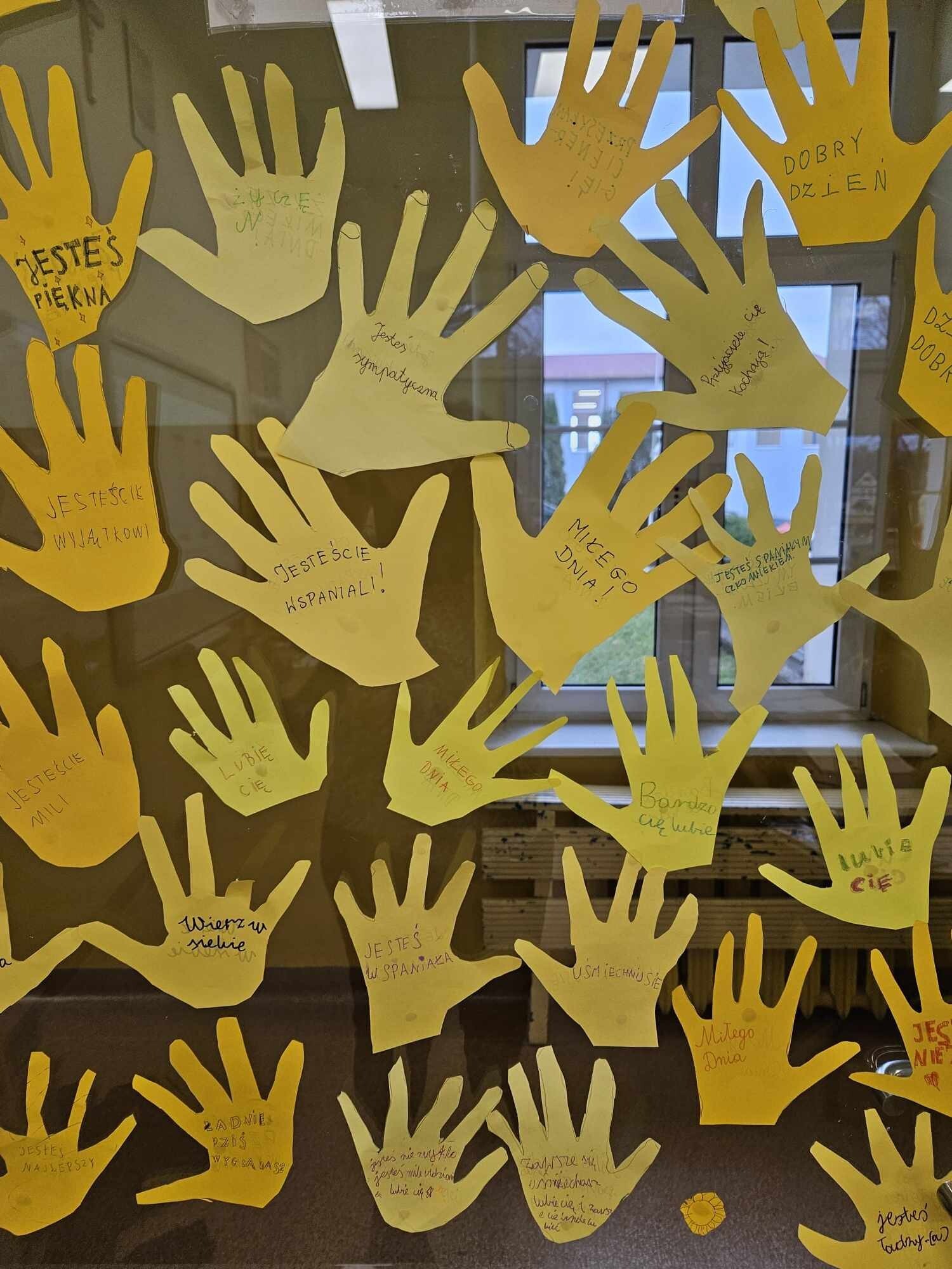 We wtorek, 21 listopada 2023, w naszej szkole obchodzono Dzień Życzliwości i Pozdrowień. Na korytarzach dominował kolor żółty - symbol tego dnia. Uśmiechnięte twarze, miłe słowa sprawiły, że wtorek był jednym z najmilszych dni w ostatnim czasie. Uczniowie klas VI podjęli się pięknej inicjatywy, tzn. przygotowali bransoletki, którymi obdarowywali pracowników szkoły, oraz cukierki dla uczniów. Nagrali również filmik z okazji tego szczególnego dnia. Uczniowie klas VII i VIII przygotowali fotobudkę, w której można było wykonać wesołe zdjęcia. Nie zawiodły klasy IV, odpowiedzialne za wykonanie plakatów o życzliwości, dobroci, przyjaźni. Uczniowie klas I-III wykonały piękne drzewo życzliwości. Czas przerw umilała muzyka wybrana przez Pana Piotra Ernesta. Ten dzień to również dzień Pracownika Socjalnego. Młodzież ze szkolnego wolontariatu nie zapomniała o Paniach pracujących w OPS-ie. 21 listopada był na tyle udany, że postanowiliśmy celebrować go częściej, a właściwie każdego dnia, mówiąc do siebie: lubię Cię, możesz na mnie liczyć, uśmiechnij się.