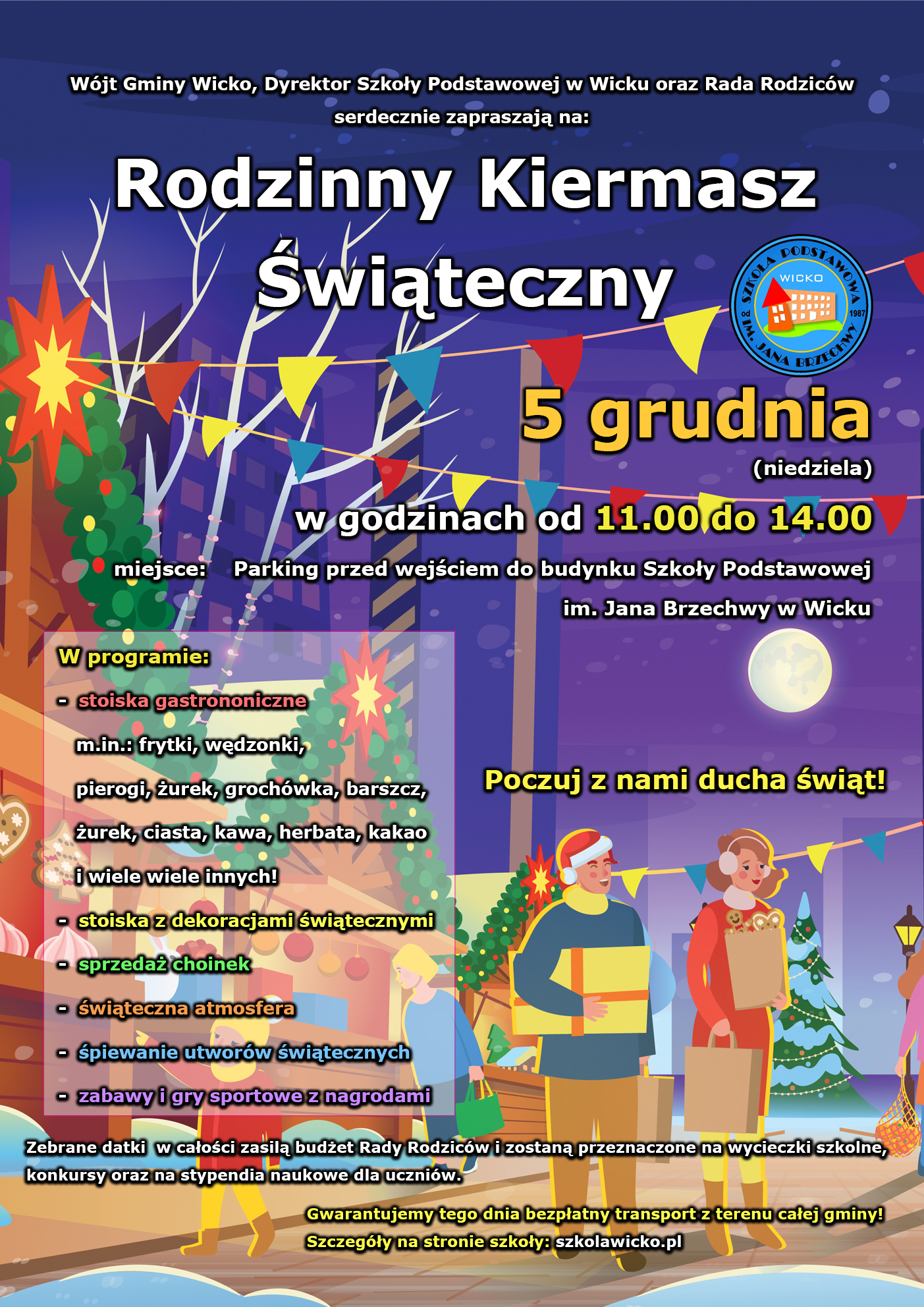 W imieniu Wójta Gminy Wicko, Rady Rodziców Szkoły Podstawowej w Wicku oraz własnym mam zaszczyt zaprosić Państwa na "Rodzinny Kiermasz Świąteczny". Wydarzenie odbędzie się 5 grudnia (niedziela) w godzinach od 11.00 do 14.00 na parkingu bezpośrednio przed wejściem do szkoły w Wicku. Zachęcam mieszkańców z terenu całej gminy do odwiedzenia naszych stoisk gastronomicznych, na których będzie można znaleźć m.in.: pierogi, wędzonki świąteczne, żurek, grochówkę, barszcz, frytki, pyszne ciasta, ciepłą kawę, herbatę oraz kakao. Ponadto nie zabraknie stoisk z pięknymi dekoracjami świątecznymi oraz gier i zabaw sportowych z nagrodami. Tego dnia będzie można także zakupić żywą choinkę do domu na święta. Całość z pozyskanych datków tego dnia będzie przeznaczona na cele statutowe Rady Rodziców z myślą o naszych uczniach. Zależy nam bardzo aby był wyczuwalny "świąteczny klimat" podczas całego wydarzenia. Dlatego też zapewnimy świąteczną oprawę muzyczną i będziemy śpiewać liczne piosenki świąteczne oraz pastorałki. Jeśli Państwo chcą pomóc nam w przebiegu i organizacji tego wydarzenia proszę o zgłoszenie się do "trójek klasowych" celem ustalenia formy pomocy. Liczymy na Państwa.