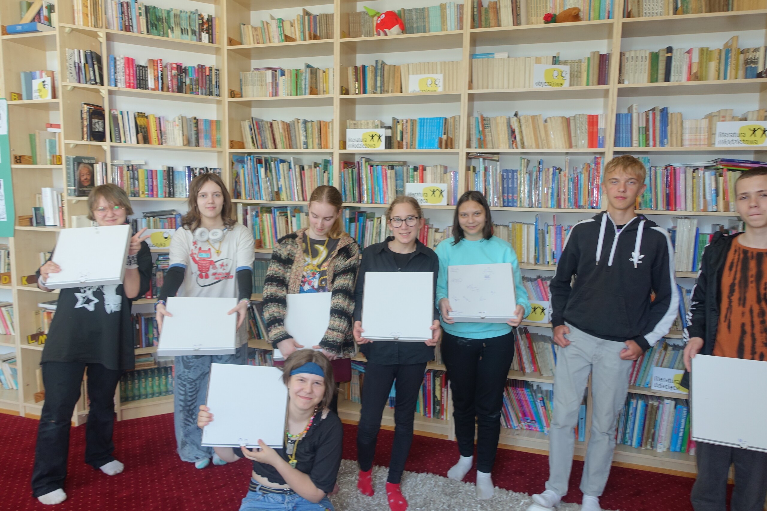 We wtorek, 20 maja 2025, już po raz ostatni w tym roku nasi członkowie Dyskusyjnego Klubu Książki spotkali się w bibliotece szkolnej, by podyskutować nie tylko o książkach, ale o czekających ich planach wakacyjnych, a także o wyborze przyszłych szkół średnich, które od września staną się dla tegorocznych absolwentów SP Wicko nowymi szkołami. Młodsza grupa interesowała się również postacią Tomka Sawyera, żywo komentując jego przygody i zastanawiając się, jak to możliwe, że ich rówieśnik bawił się w zupełnie inne zabawy i miał inne obowiązki do wykonania, całkowicie różne od dzisiejszych dzieci w jego wieku. Nie wszyscy byli zadowoleni z lektury książki Marka Twaina. Wśród starszej grupy członków Dyskusyjnego Klubu Książki Lila zarekomendowała nowości wydawnicze z Polski i z zagranicy, w tym współczesną literaturę japońską dla młodzieży. Pokazała również swoją nową książkę, którą właśnie zaczęła pisać. Trzymamy mocno kciuki za doprowadzenie fabuły do końca. Był też moment na urodzinowy prezent dla Oli i na wspólny przedwakacyjny poczęstunek w postaci pizzy. Do zobaczenia w następnym roku szkolnym!