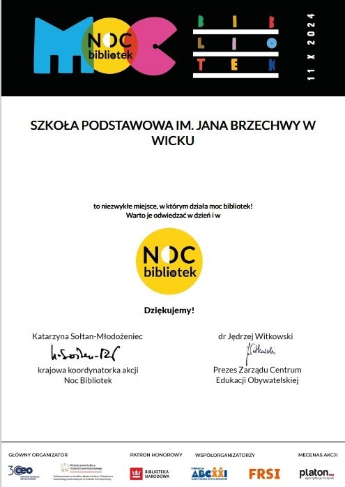 Szkoła Podstawowa im. Jana Brzechwy w Wicku to niezwykłe miejsce, w którym działa moc bibliotek! Warto je odwiedzać w dzień i w Noc Bibliotek. Dziękujemy!
