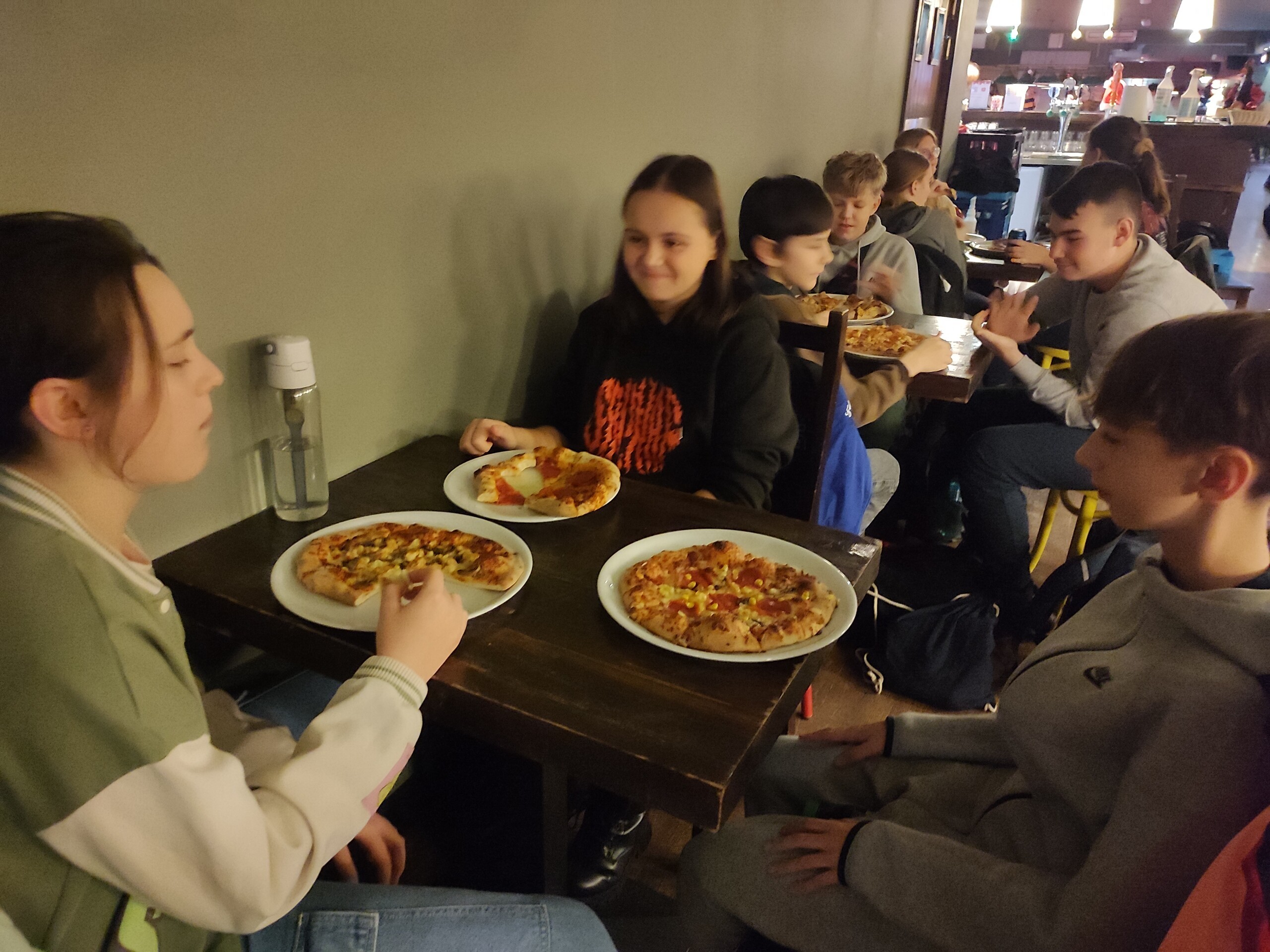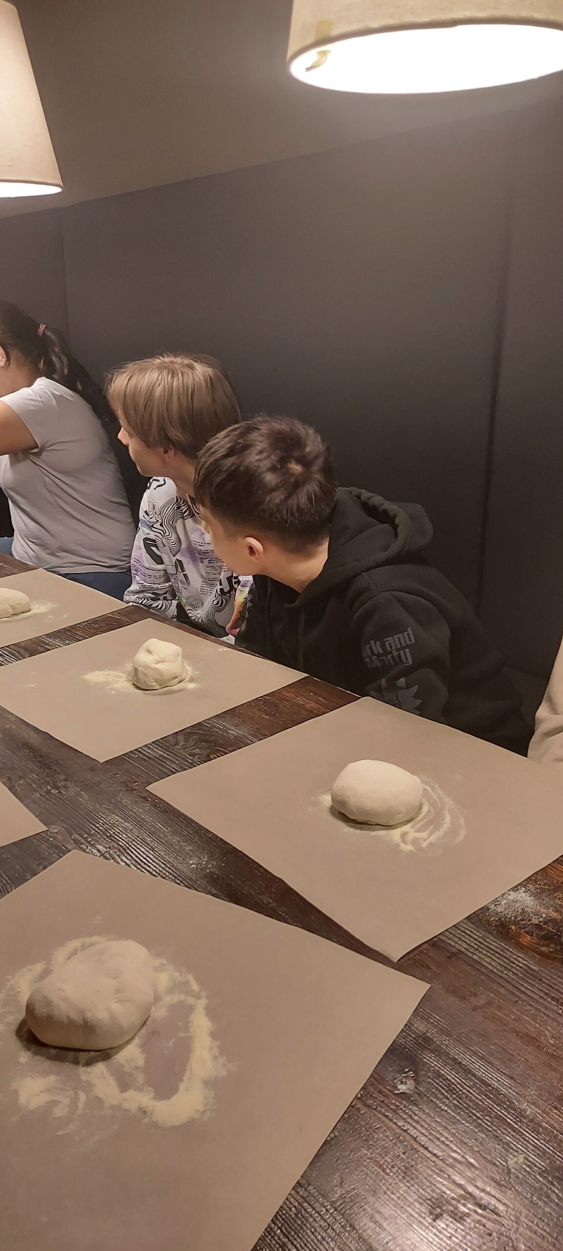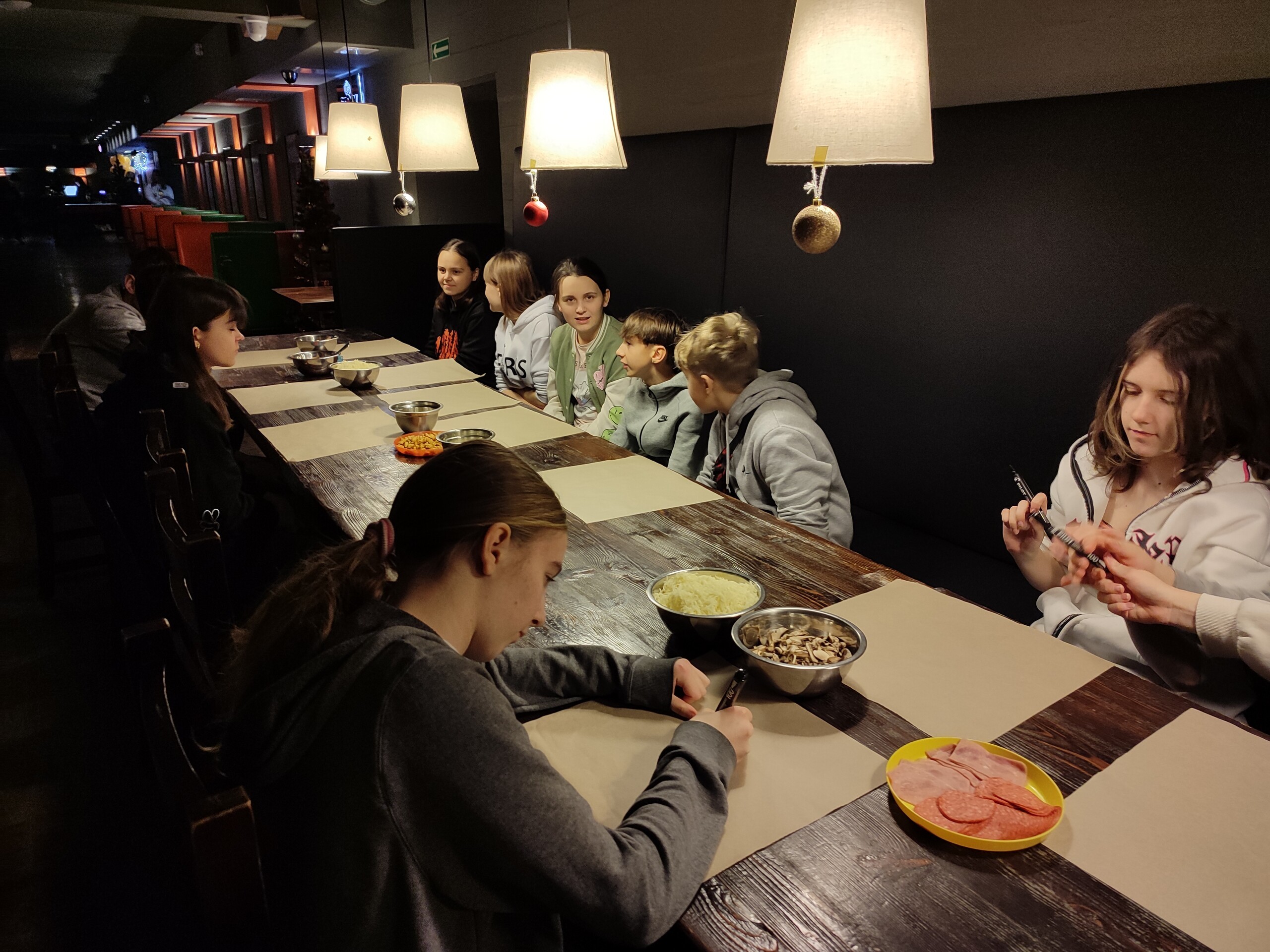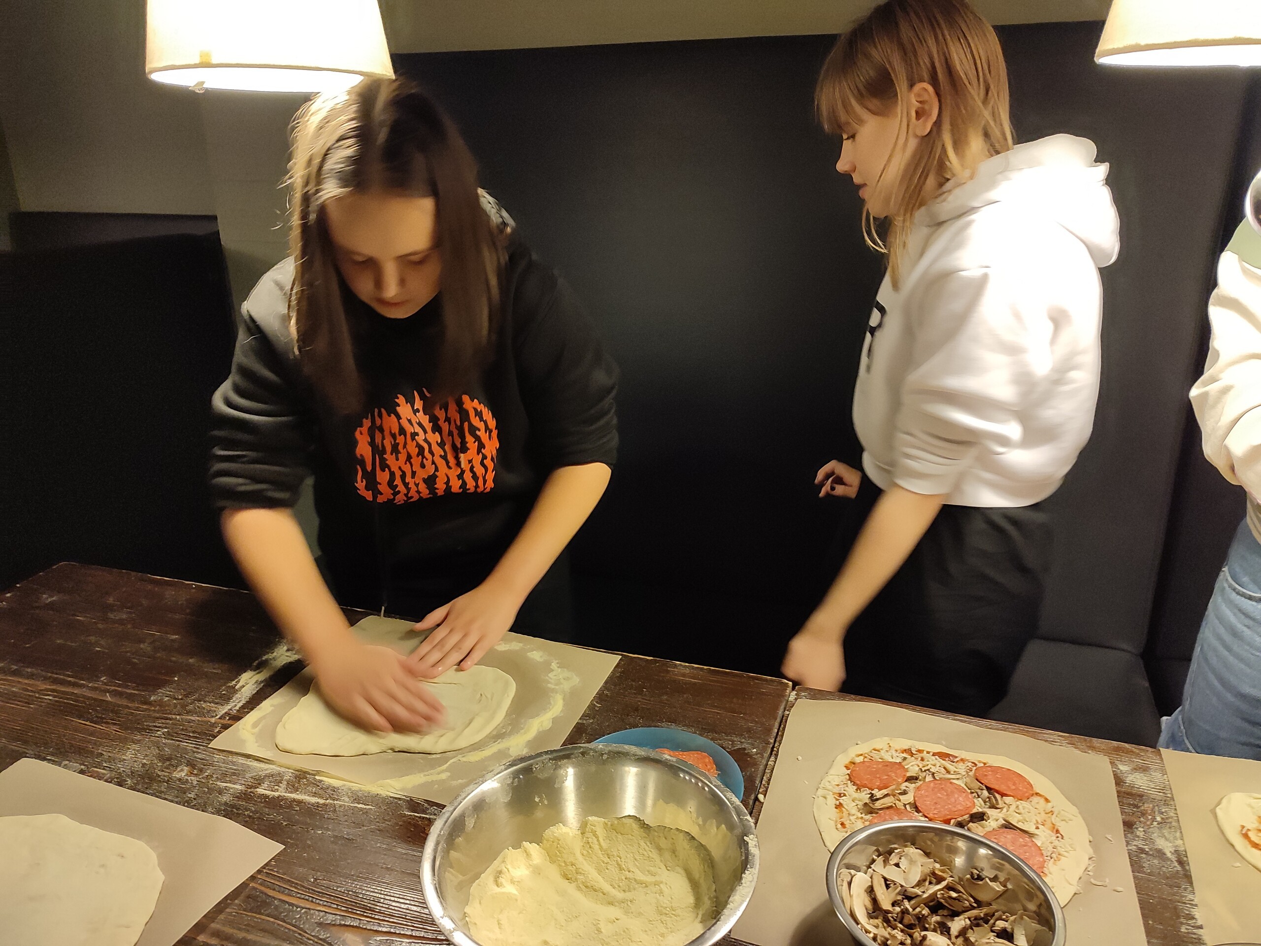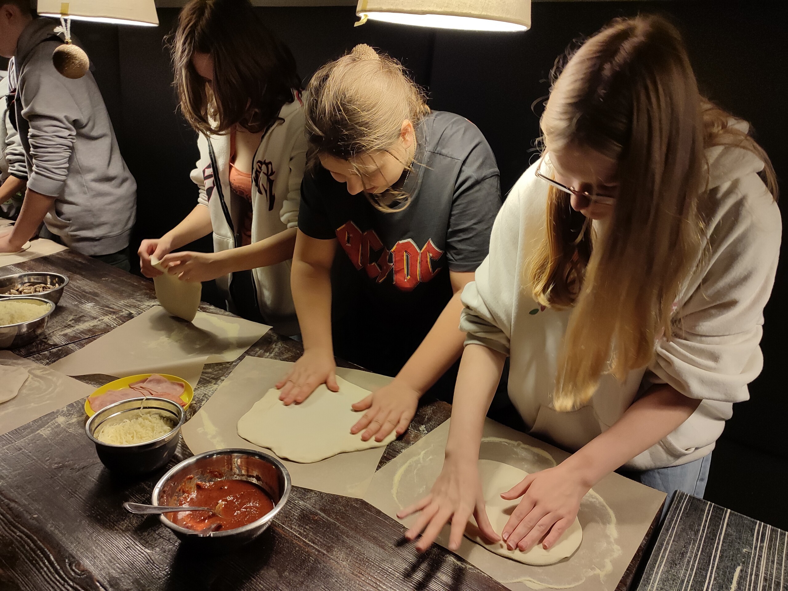 W tym czasie ósmoklasiści brali udział w warsztatach robienia pizzy. Po określonym czasie nastąpiła zamiana. „Pizzermenka” pracująca w restauracji wprowadziła nas w świat gotowania, zdradziła tajniki przygotowania i wyrabiania ciasta do pizzy oraz dobrania odpowiednich składników. Nasi uczniowie wyjątkowo zaangażowali się w przygotowanie włoskiego przysmaku według instrukcji profesjonalistki i własnych upodobań. Już po kilku minutach zapachniało pieczonym ciastem, a po kilkunastu… można było jeść. Nawet najbardziej wybredni smakosze wyrazili zadowolenie po spróbowaniu wykwintnego, bo własnoręcznie przygotowanego, dania.