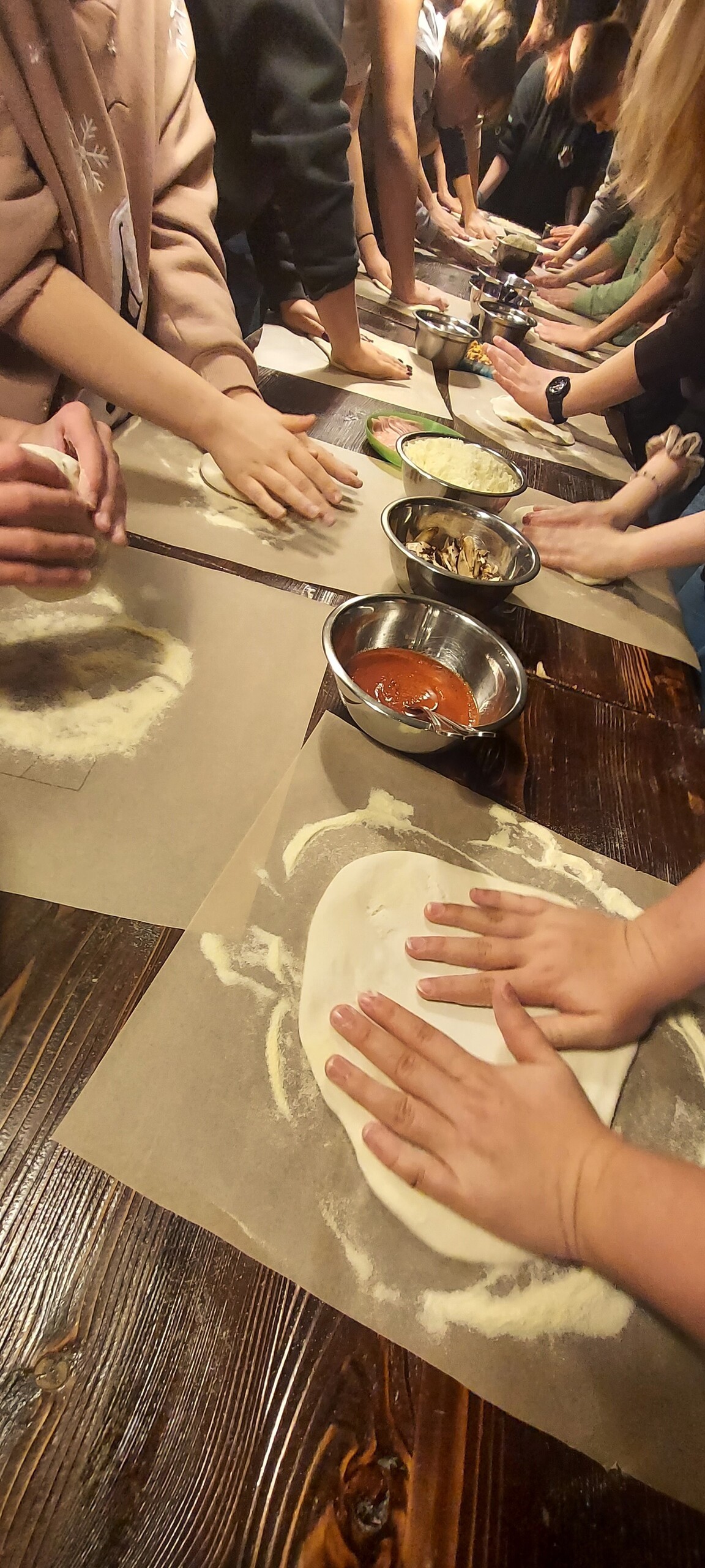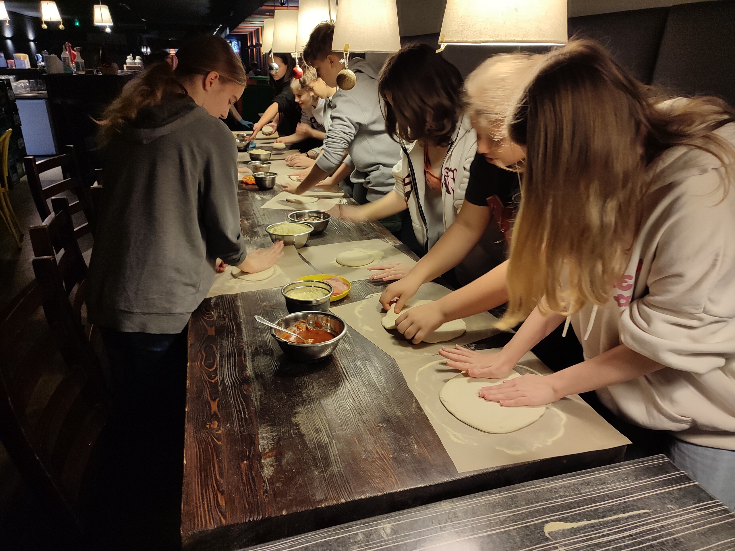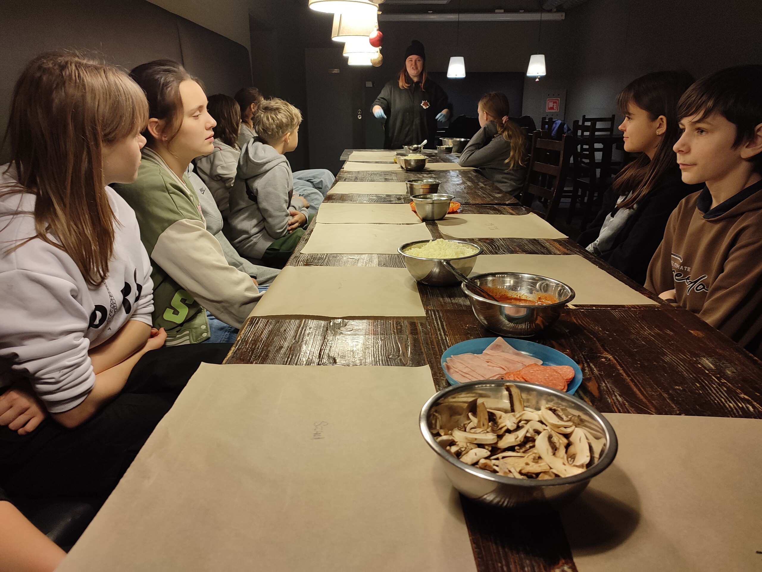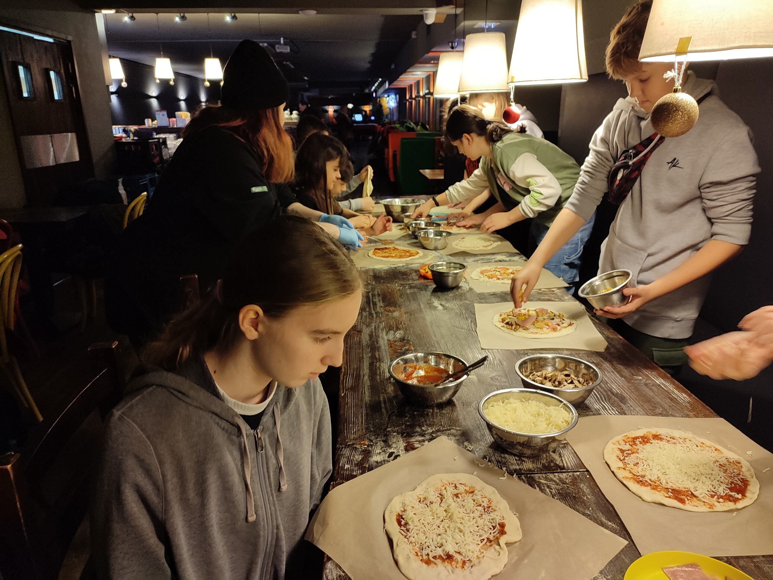 W tym czasie ósmoklasiści brali udział w warsztatach robienia pizzy. Po określonym czasie nastąpiła zamiana. „Pizzermenka” pracująca w restauracji wprowadziła nas w świat gotowania, zdradziła tajniki przygotowania i wyrabiania ciasta do pizzy oraz dobrania odpowiednich składników. Nasi uczniowie wyjątkowo zaangażowali się w przygotowanie włoskiego przysmaku według instrukcji profesjonalistki i własnych upodobań. Już po kilku minutach zapachniało pieczonym ciastem, a po kilkunastu… można było jeść. Nawet najbardziej wybredni smakosze wyrazili zadowolenie po spróbowaniu wykwintnego, bo własnoręcznie przygotowanego, dania.