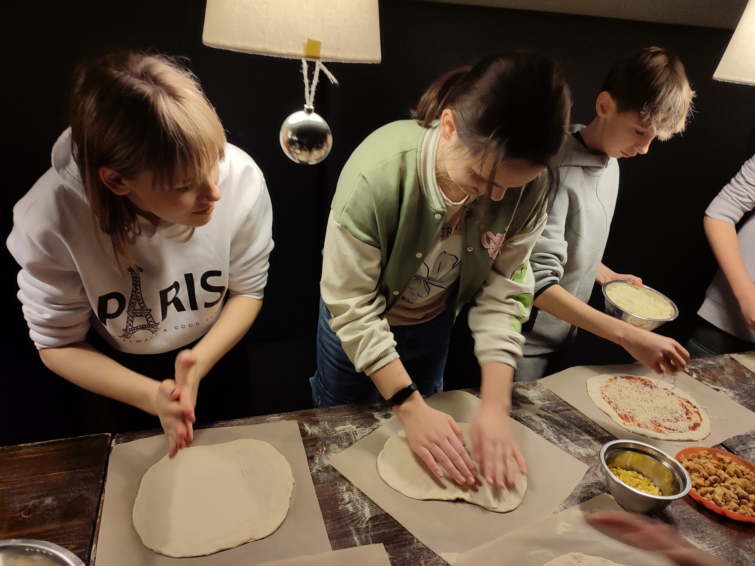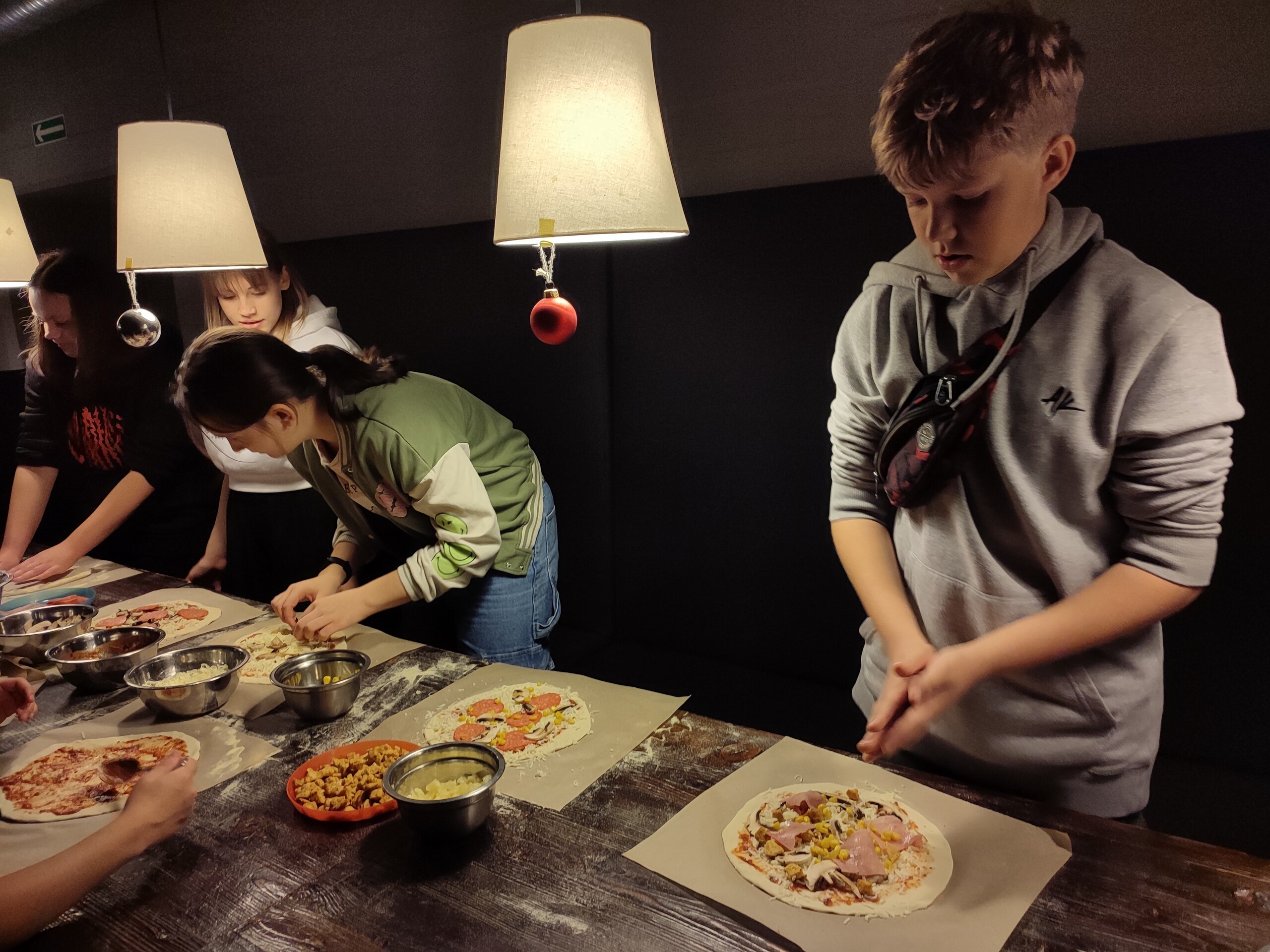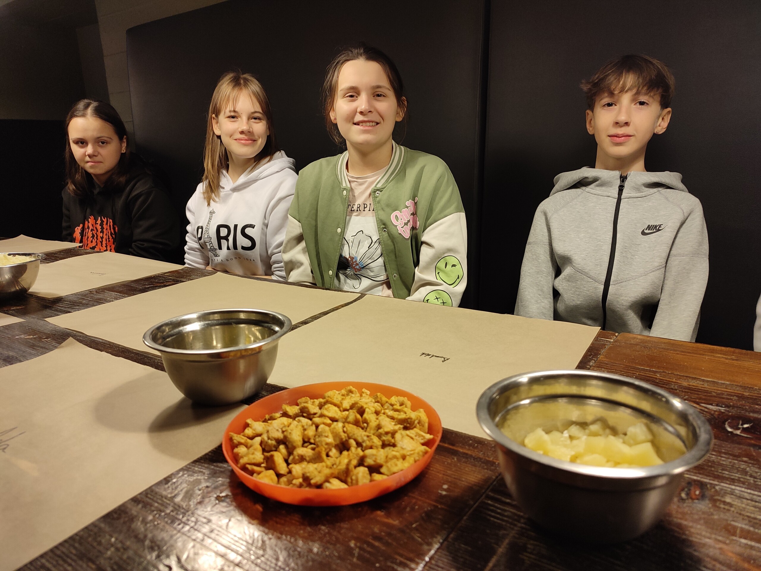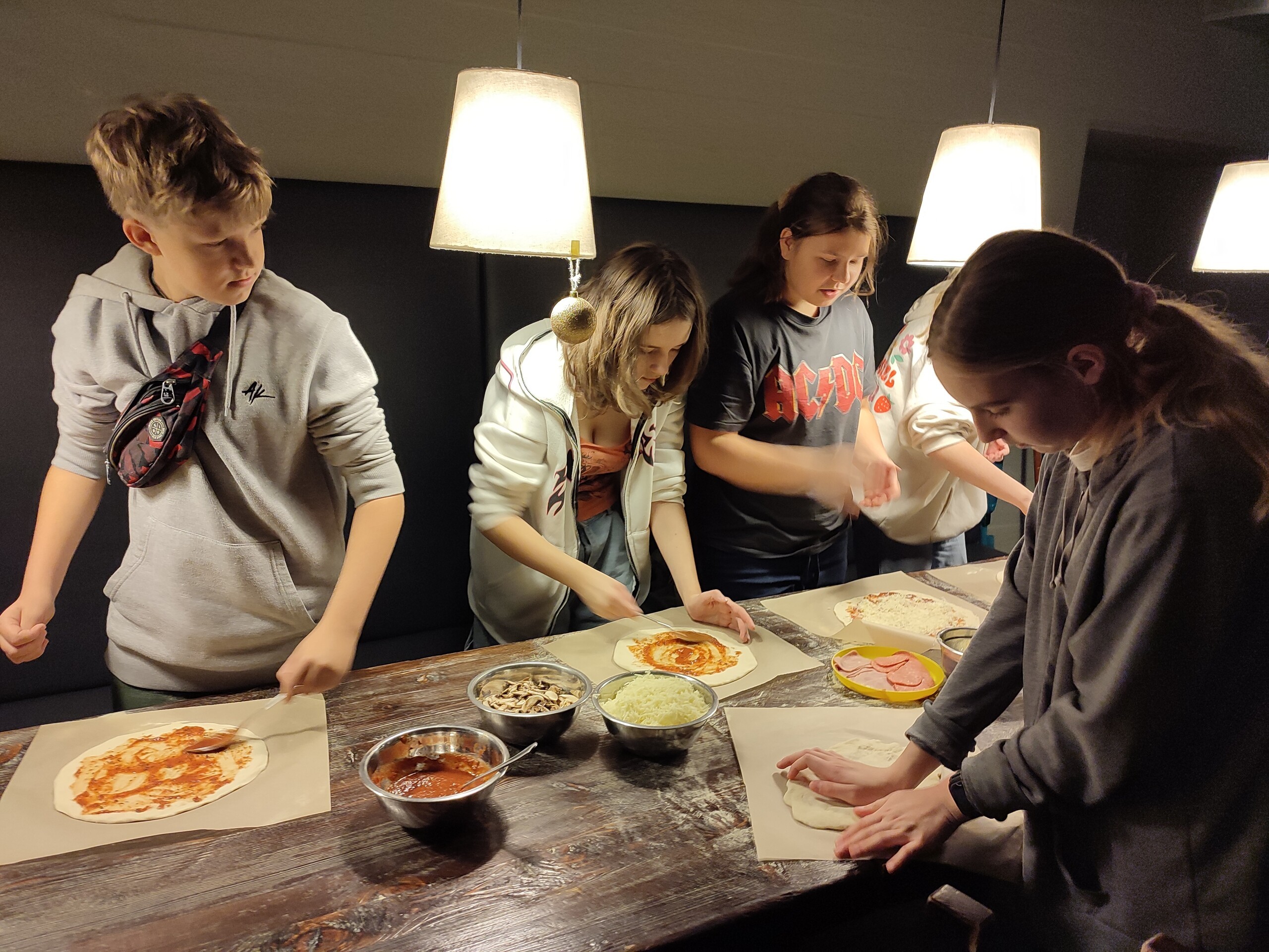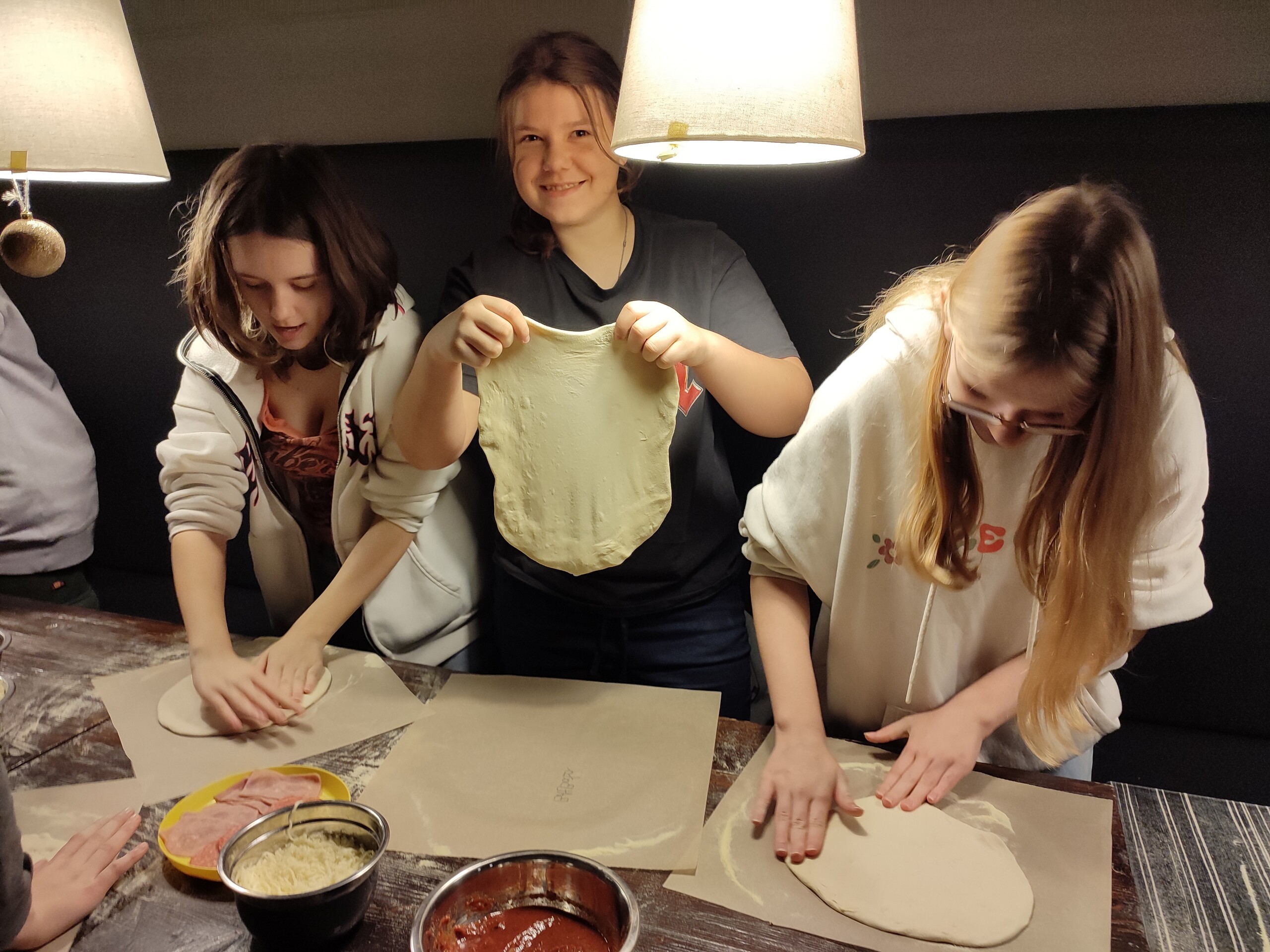 W tym czasie ósmoklasiści brali udział w warsztatach robienia pizzy. Po określonym czasie nastąpiła zamiana. „Pizzermenka” pracująca w restauracji wprowadziła nas w świat gotowania, zdradziła tajniki przygotowania i wyrabiania ciasta do pizzy oraz dobrania odpowiednich składników. Nasi uczniowie wyjątkowo zaangażowali się w przygotowanie włoskiego przysmaku według instrukcji profesjonalistki i własnych upodobań. Już po kilku minutach zapachniało pieczonym ciastem, a po kilkunastu… można było jeść. Nawet najbardziej wybredni smakosze wyrazili zadowolenie po spróbowaniu wykwintnego, bo własnoręcznie przygotowanego, dania.