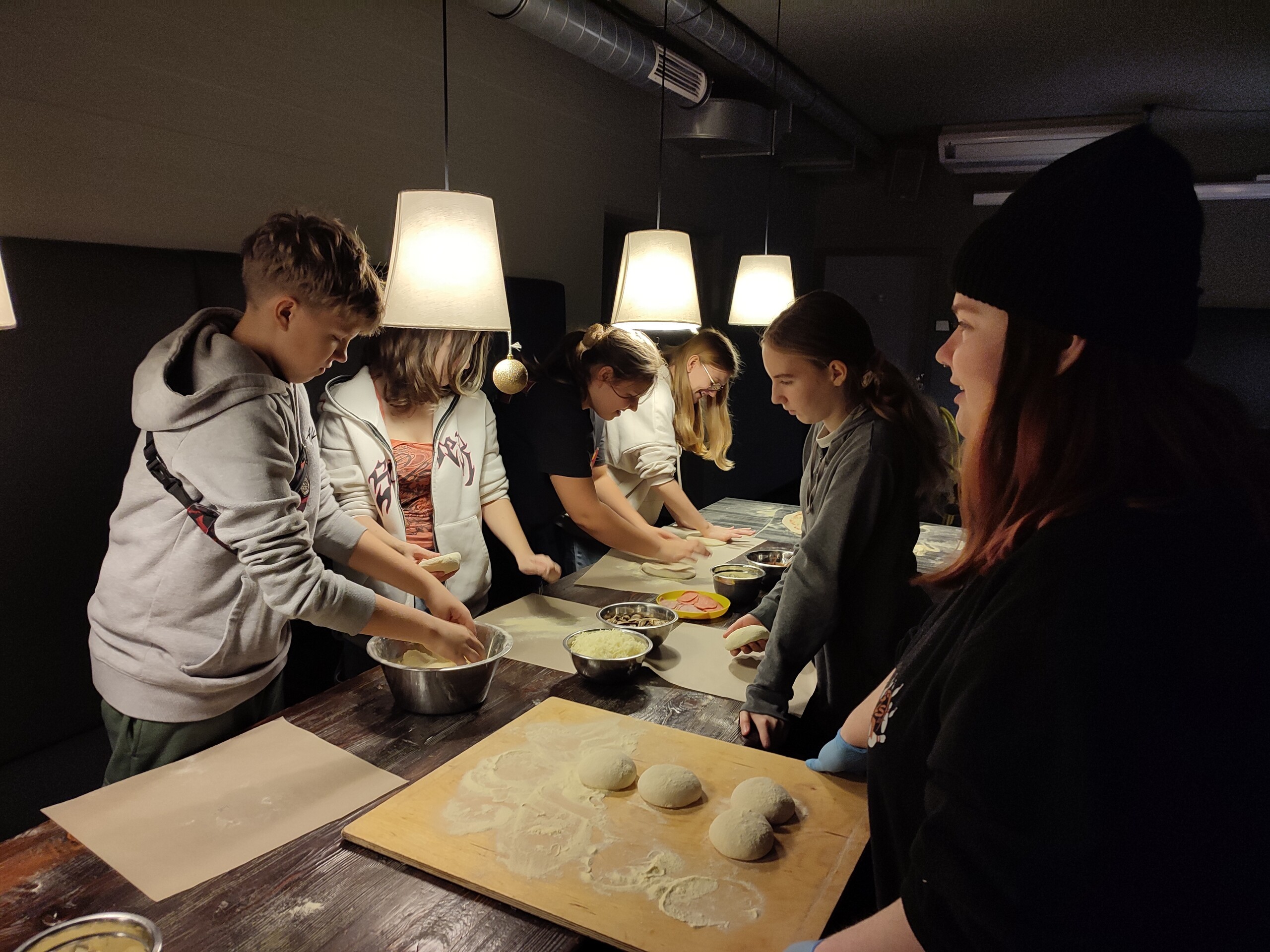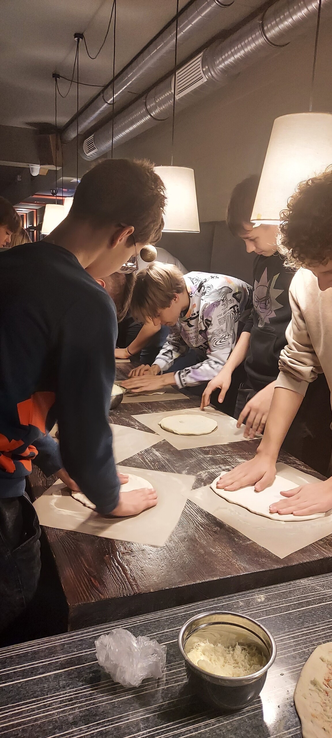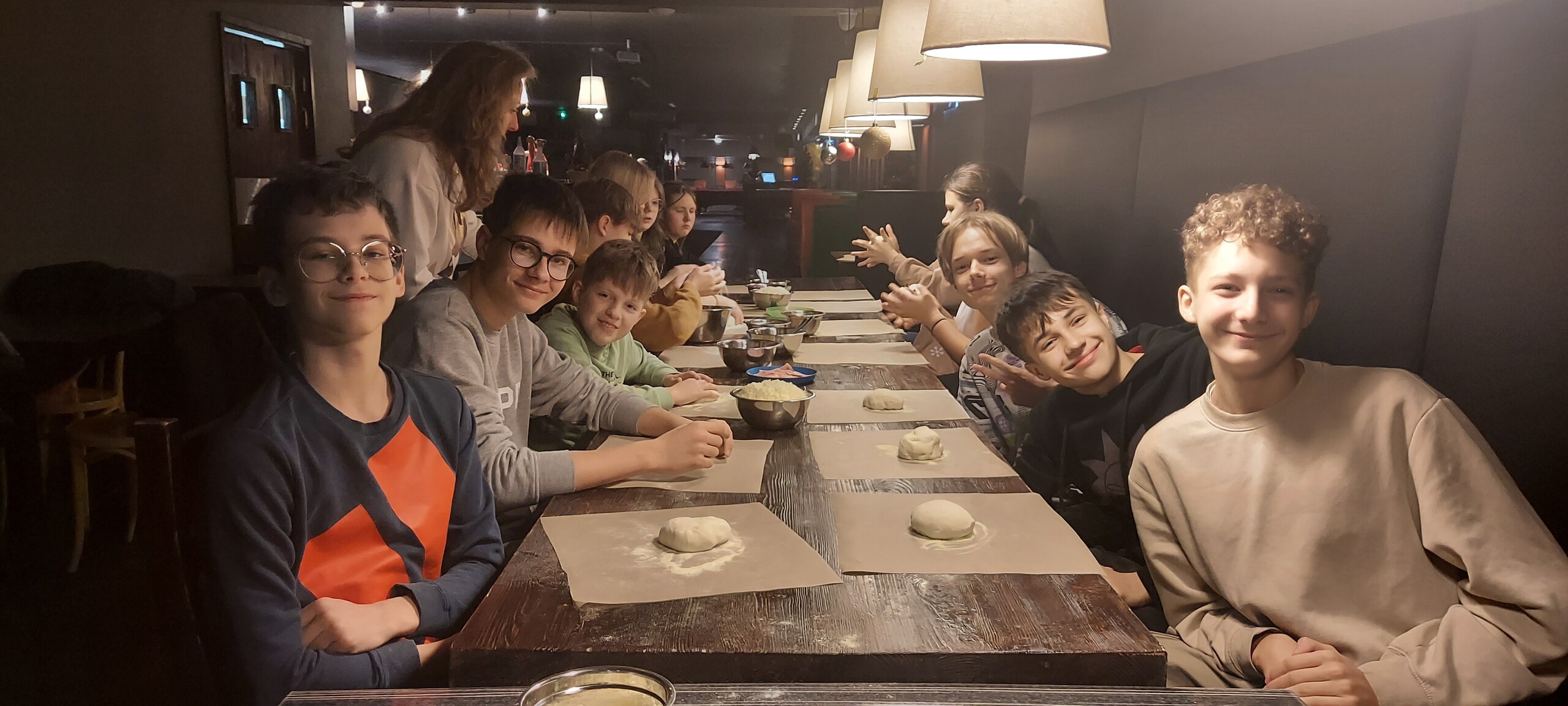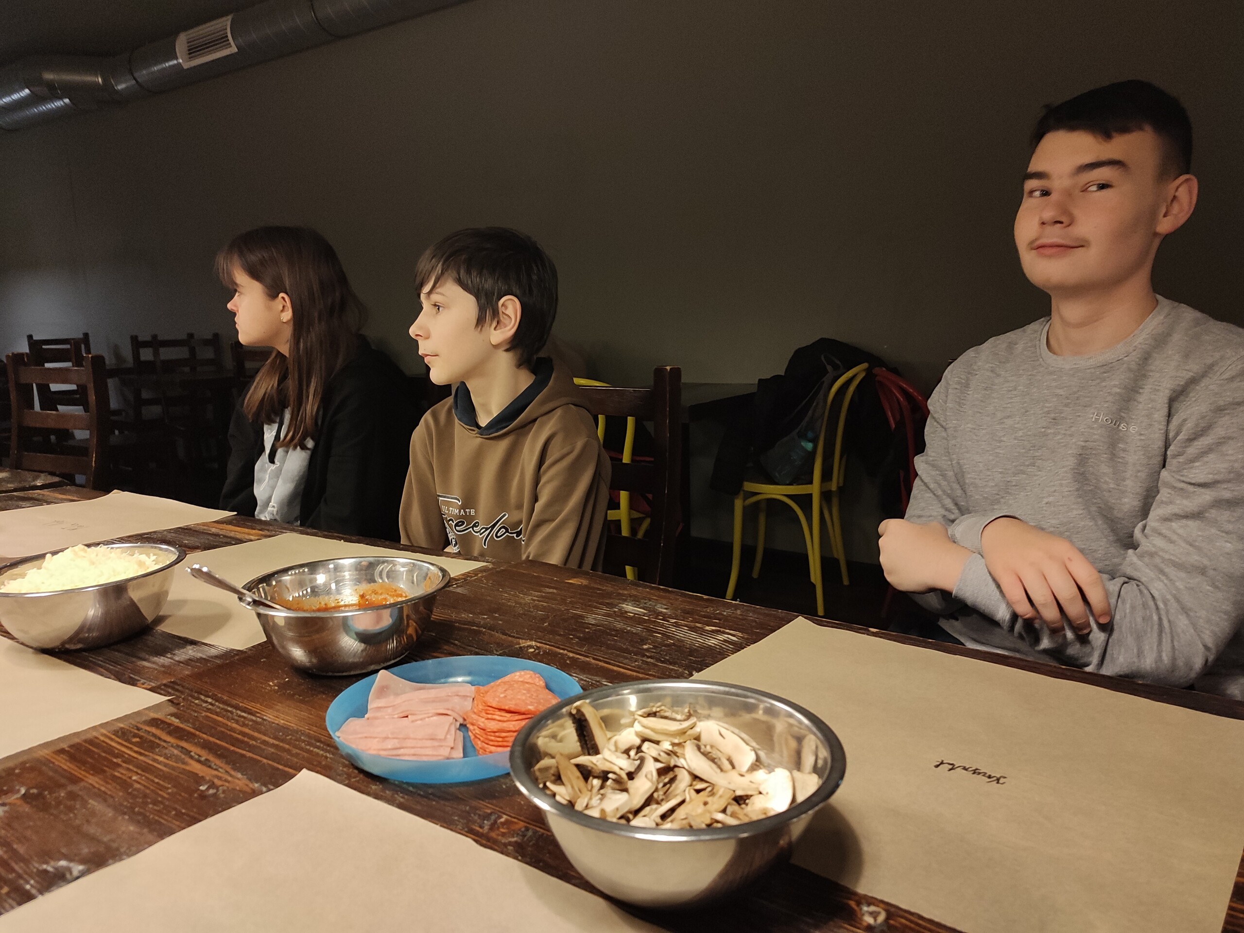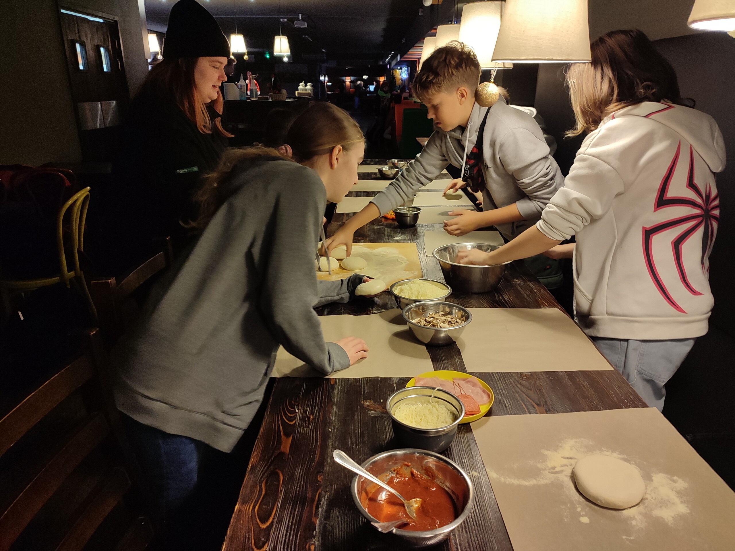 W tym czasie ósmoklasiści brali udział w warsztatach robienia pizzy. Po określonym czasie nastąpiła zamiana. „Pizzermenka” pracująca w restauracji wprowadziła nas w świat gotowania, zdradziła tajniki przygotowania i wyrabiania ciasta do pizzy oraz dobrania odpowiednich składników. Nasi uczniowie wyjątkowo zaangażowali się w przygotowanie włoskiego przysmaku według instrukcji profesjonalistki i własnych upodobań. Już po kilku minutach zapachniało pieczonym ciastem, a po kilkunastu… można było jeść. Nawet najbardziej wybredni smakosze wyrazili zadowolenie po spróbowaniu wykwintnego, bo własnoręcznie przygotowanego, dania.