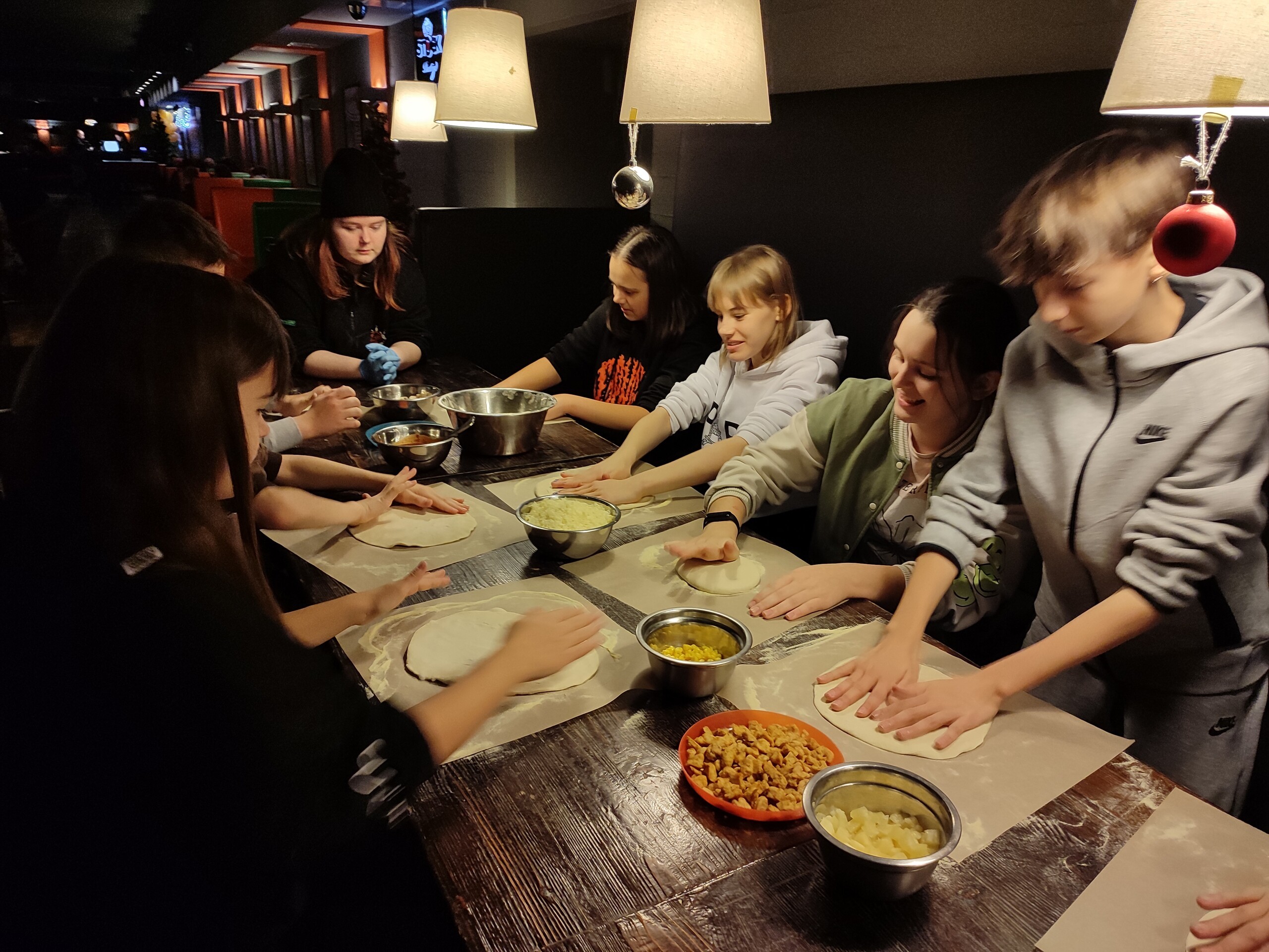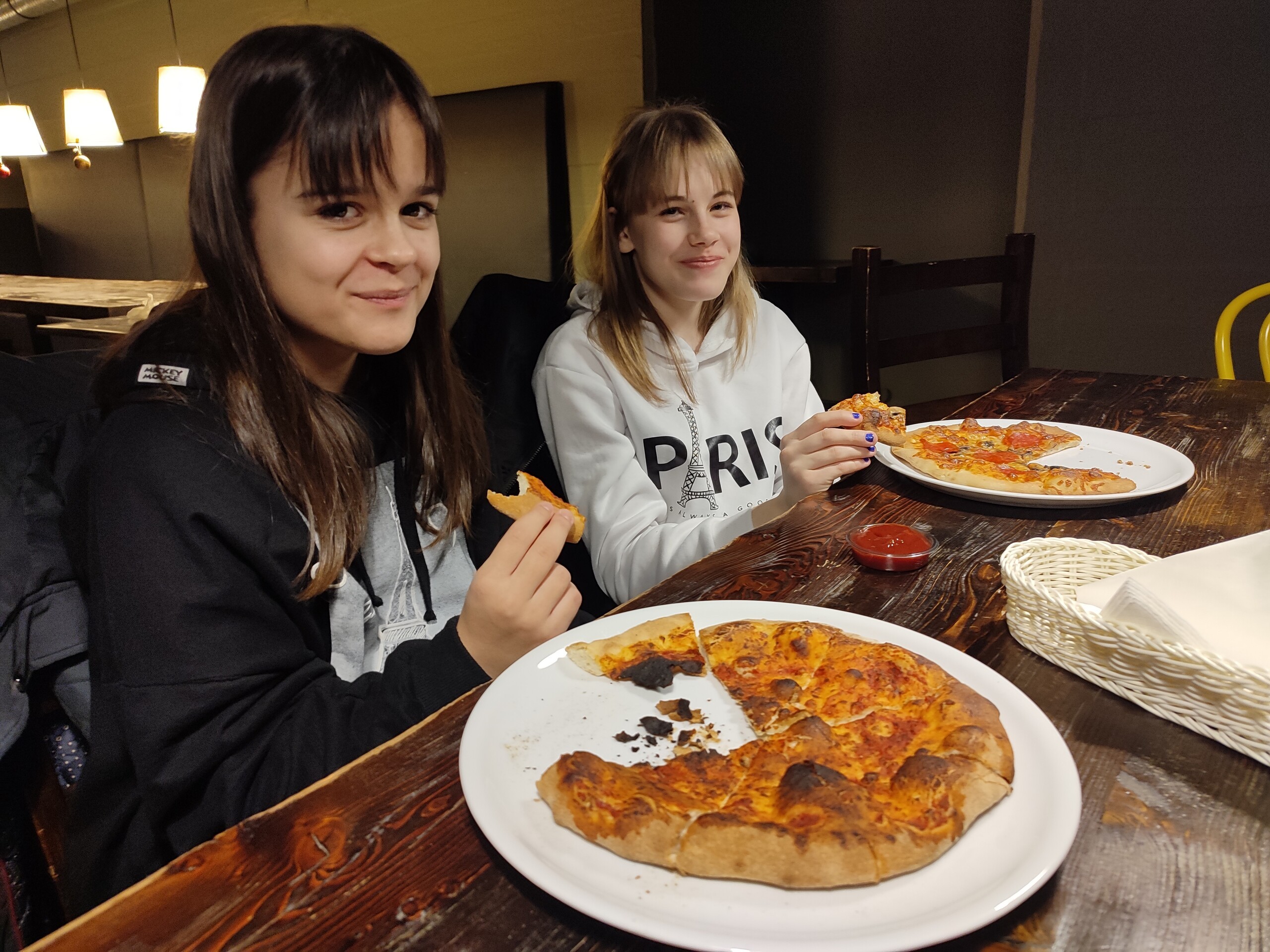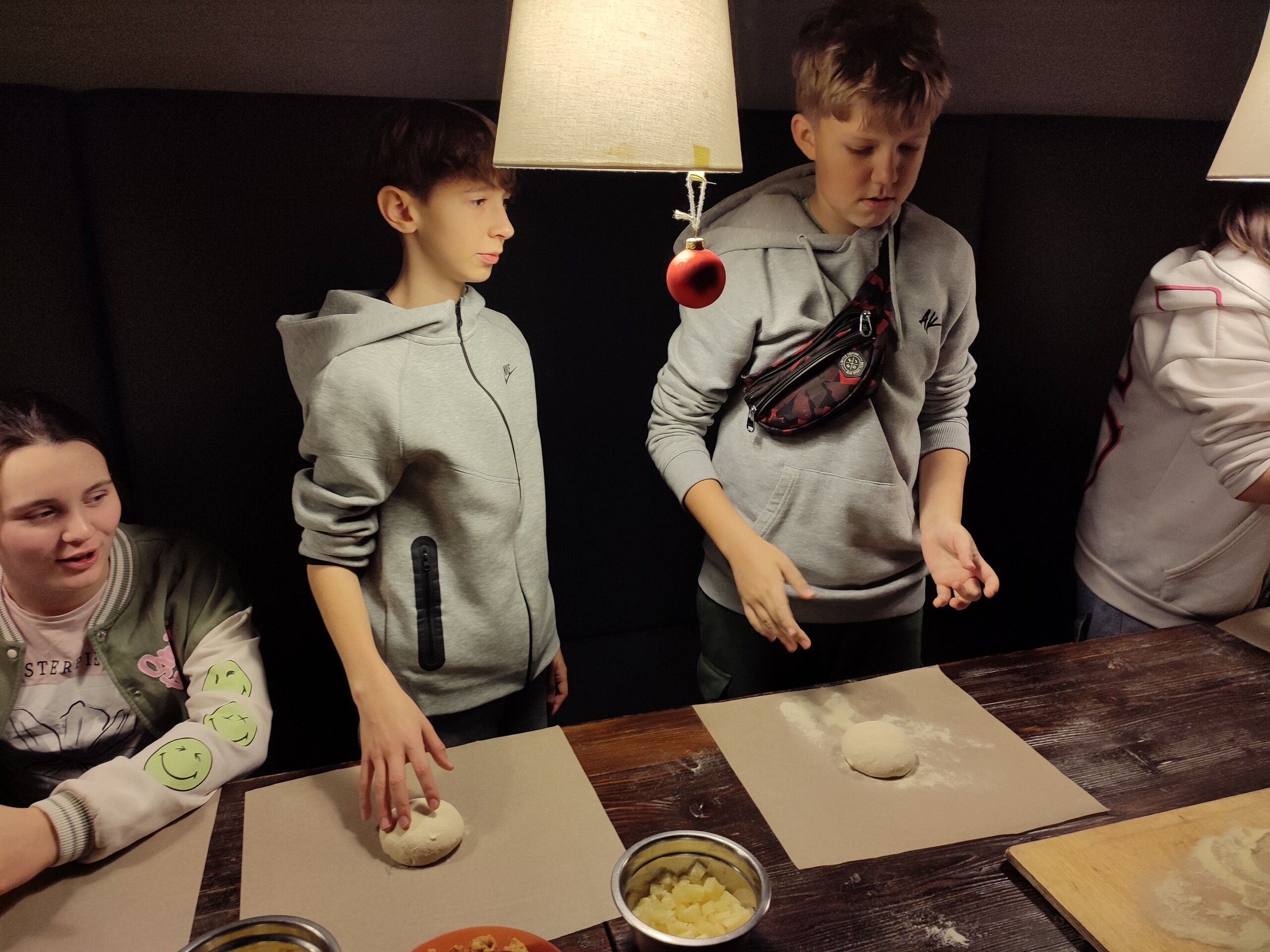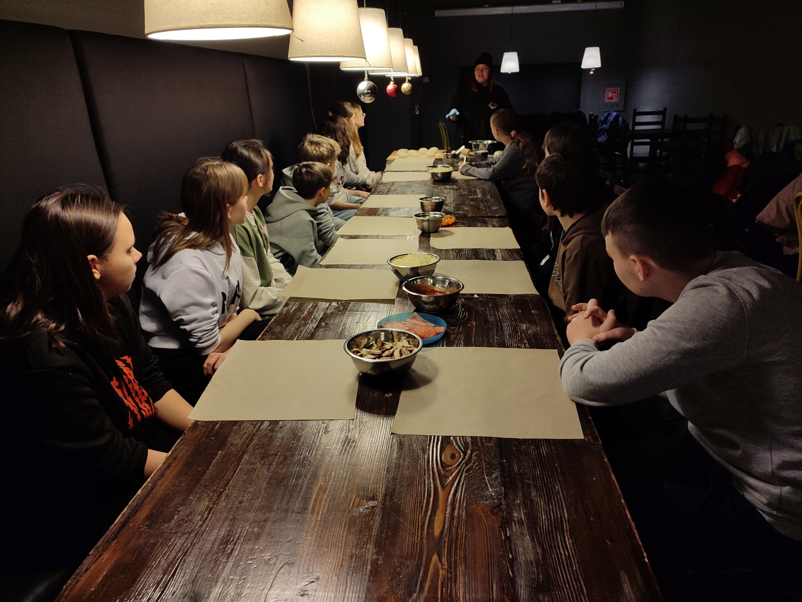 W tym czasie ósmoklasiści brali udział w warsztatach robienia pizzy. Po określonym czasie nastąpiła zamiana. „Pizzermenka” pracująca w restauracji wprowadziła nas w świat gotowania, zdradziła tajniki przygotowania i wyrabiania ciasta do pizzy oraz dobrania odpowiednich składników. Nasi uczniowie wyjątkowo zaangażowali się w przygotowanie włoskiego przysmaku według instrukcji profesjonalistki i własnych upodobań. Już po kilku minutach zapachniało pieczonym ciastem, a po kilkunastu… można było jeść. Nawet najbardziej wybredni smakosze wyrazili zadowolenie po spróbowaniu wykwintnego, bo własnoręcznie przygotowanego, dania.