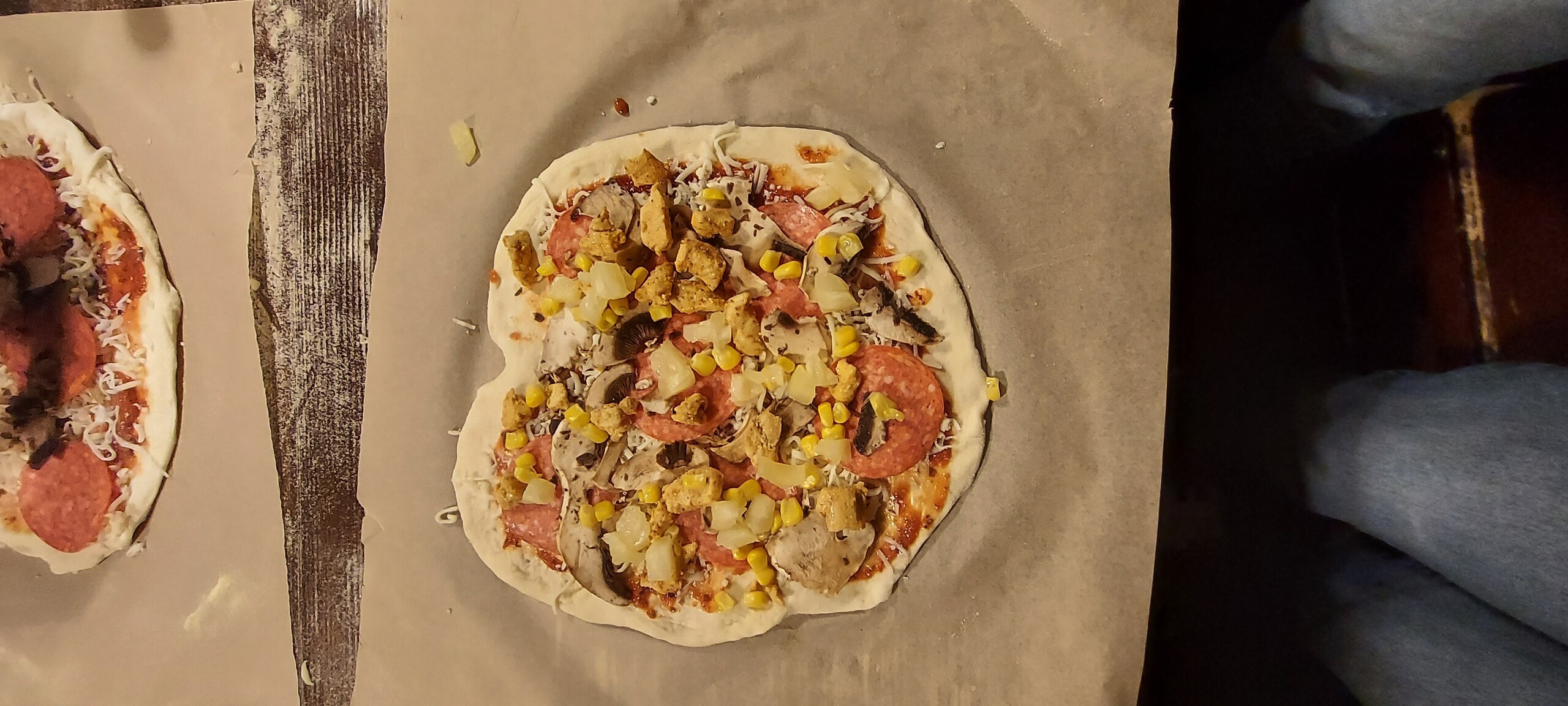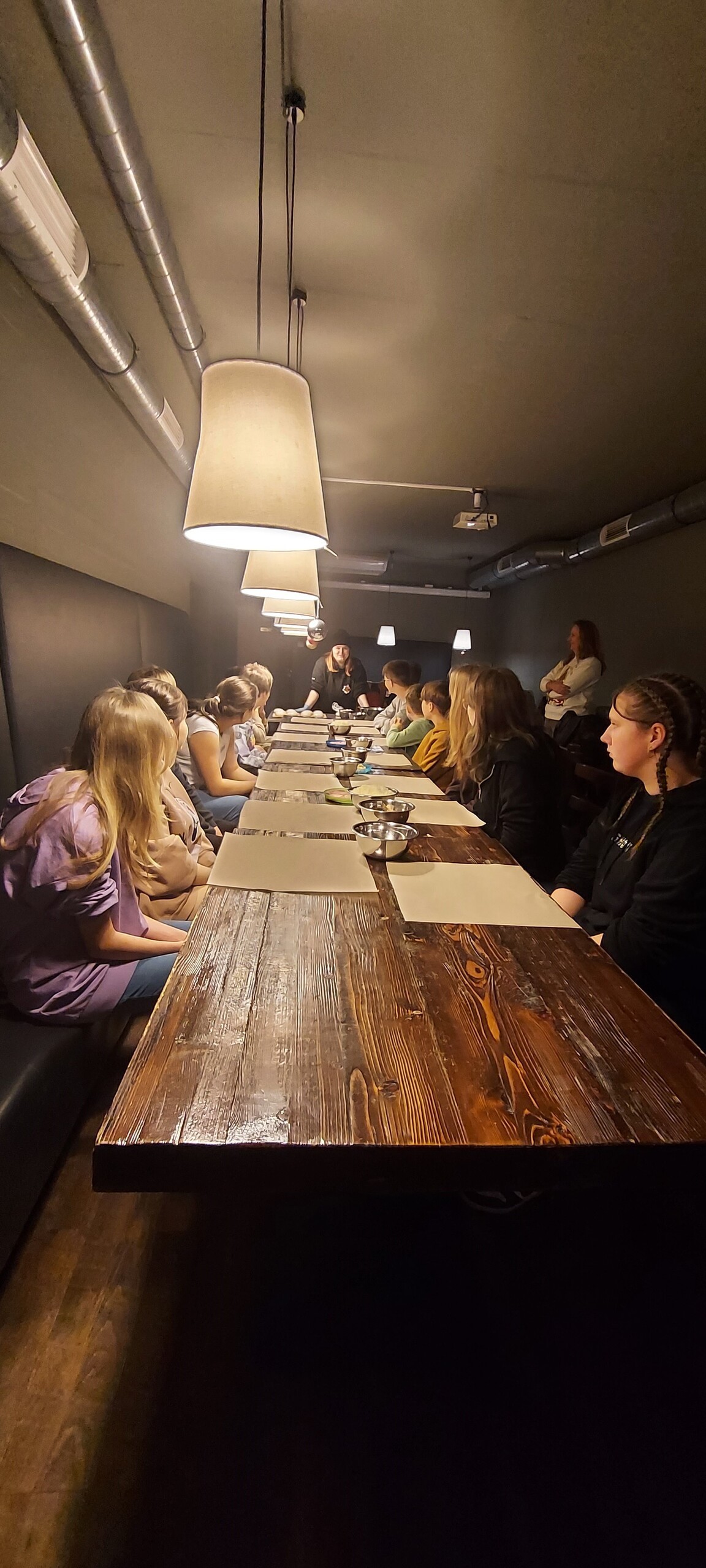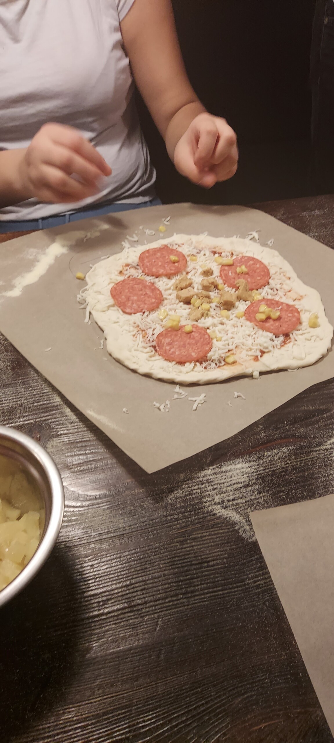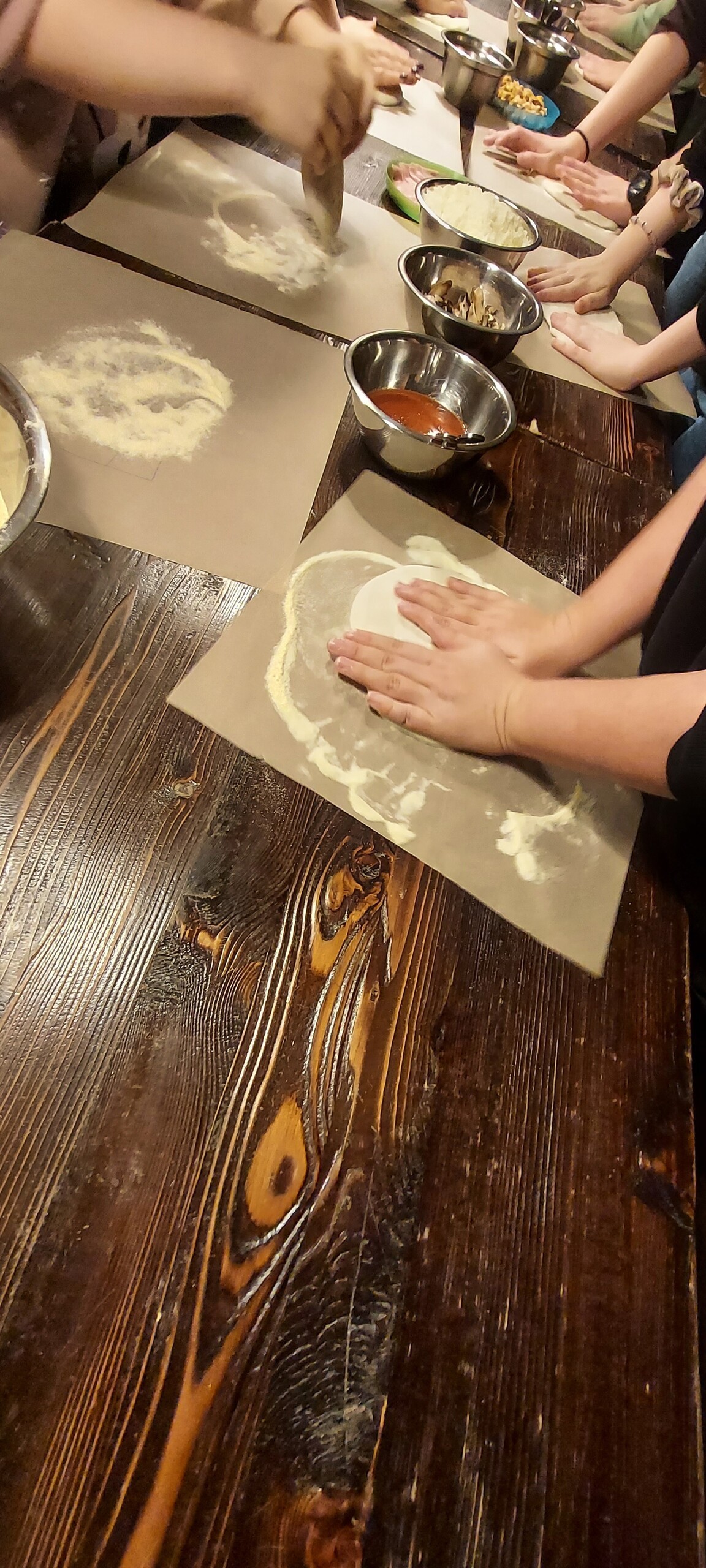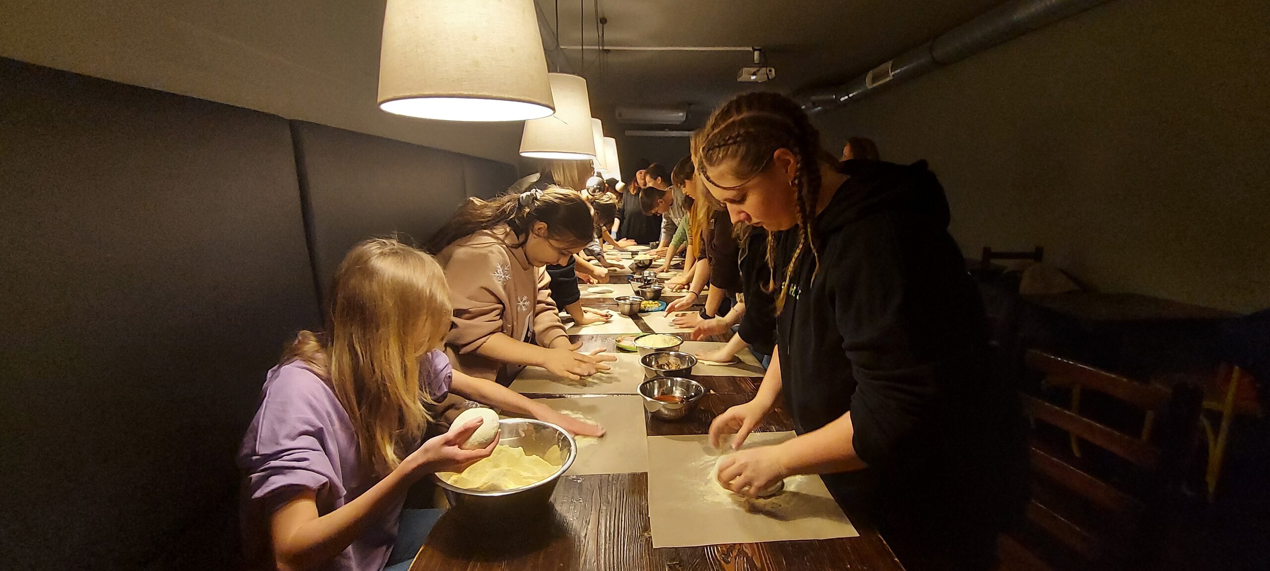 W tym czasie ósmoklasiści brali udział w warsztatach robienia pizzy. Po określonym czasie nastąpiła zamiana. „Pizzermenka” pracująca w restauracji wprowadziła nas w świat gotowania, zdradziła tajniki przygotowania i wyrabiania ciasta do pizzy oraz dobrania odpowiednich składników. Nasi uczniowie wyjątkowo zaangażowali się w przygotowanie włoskiego przysmaku według instrukcji profesjonalistki i własnych upodobań. Już po kilku minutach zapachniało pieczonym ciastem, a po kilkunastu… można było jeść. Nawet najbardziej wybredni smakosze wyrazili zadowolenie po spróbowaniu wykwintnego, bo własnoręcznie przygotowanego, dania.