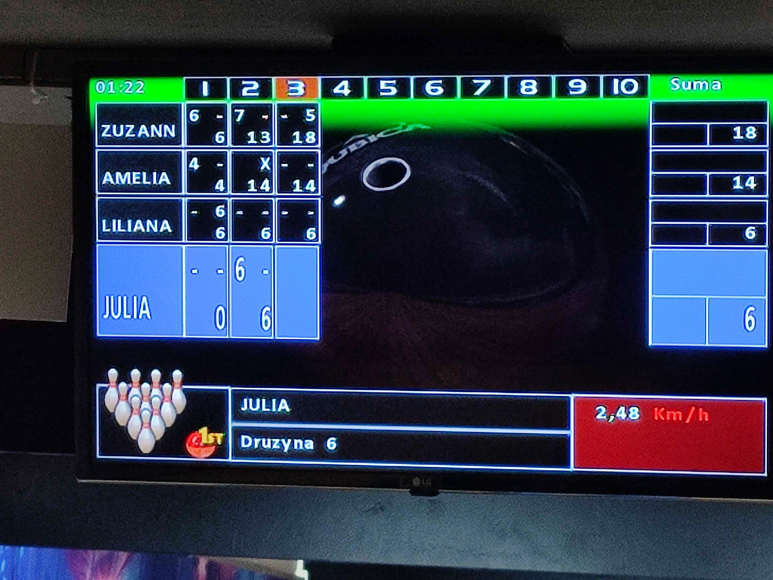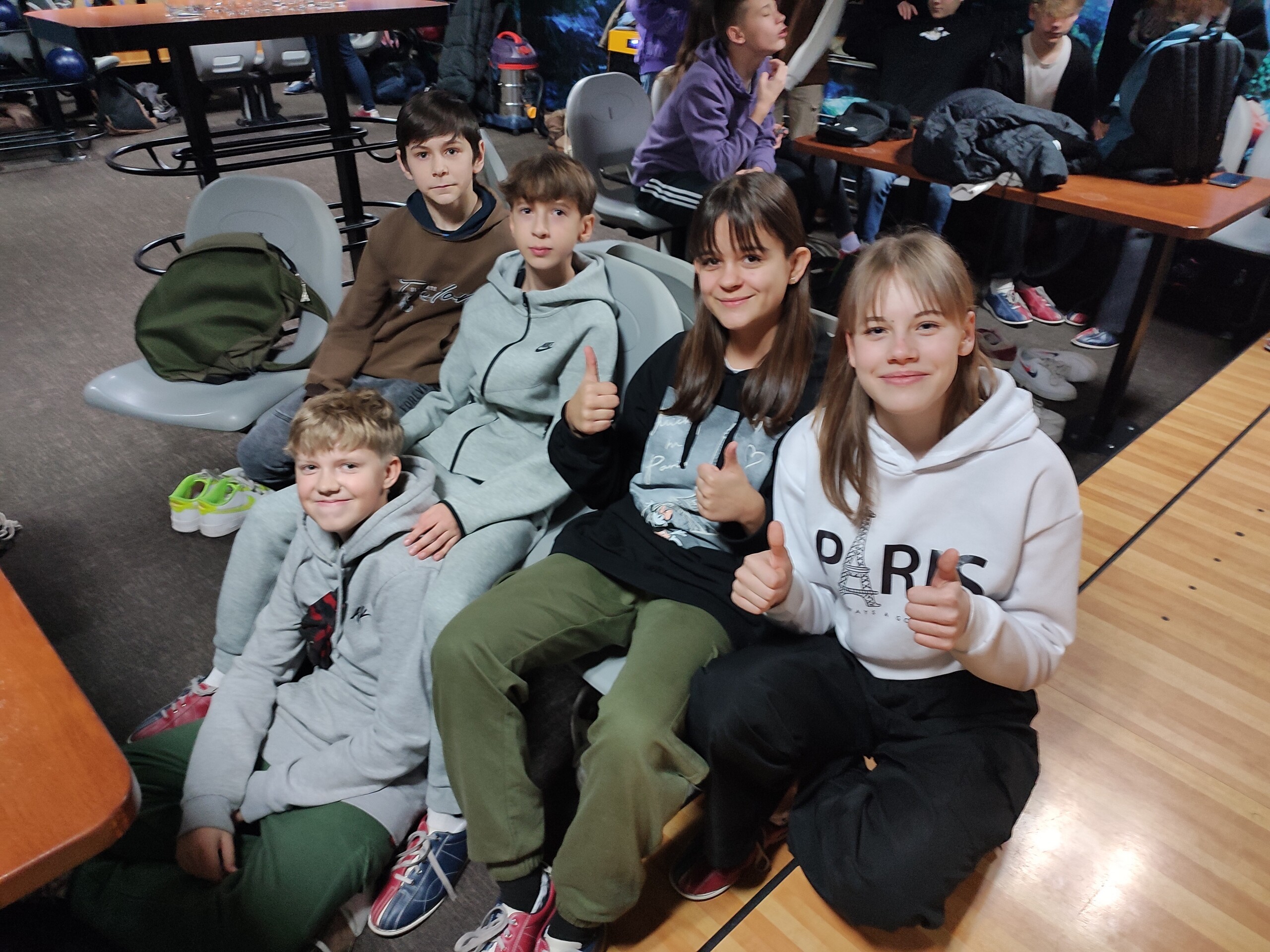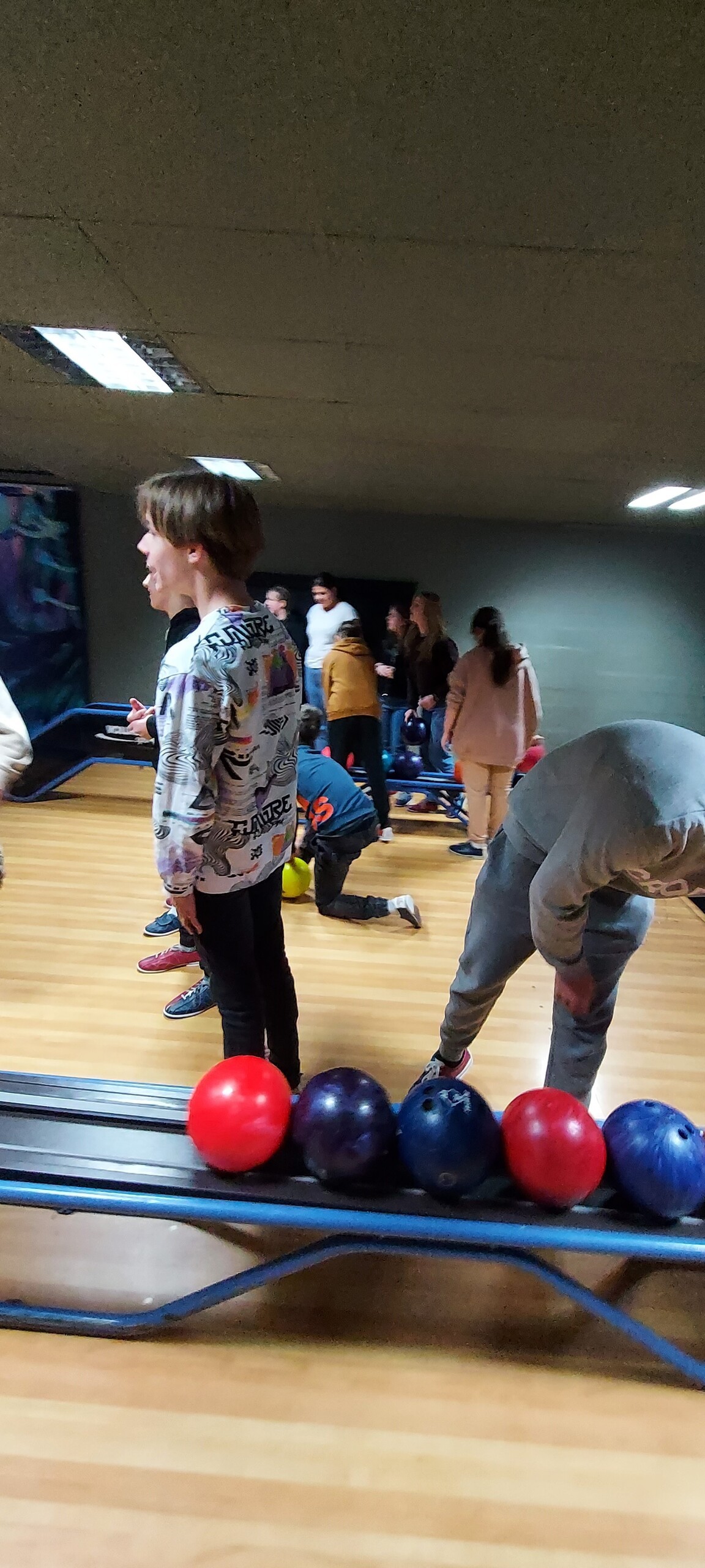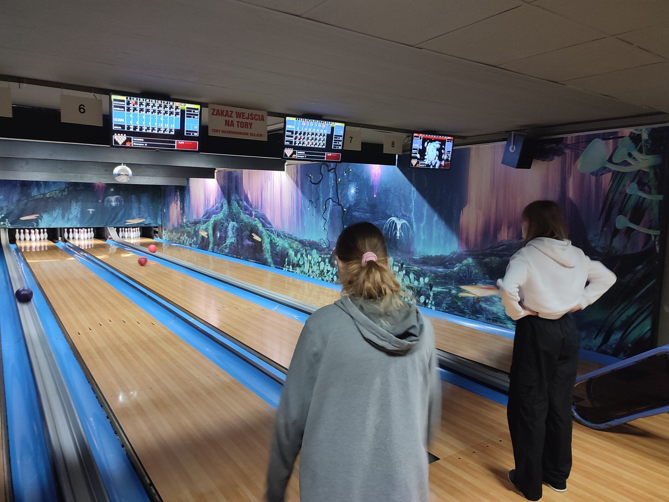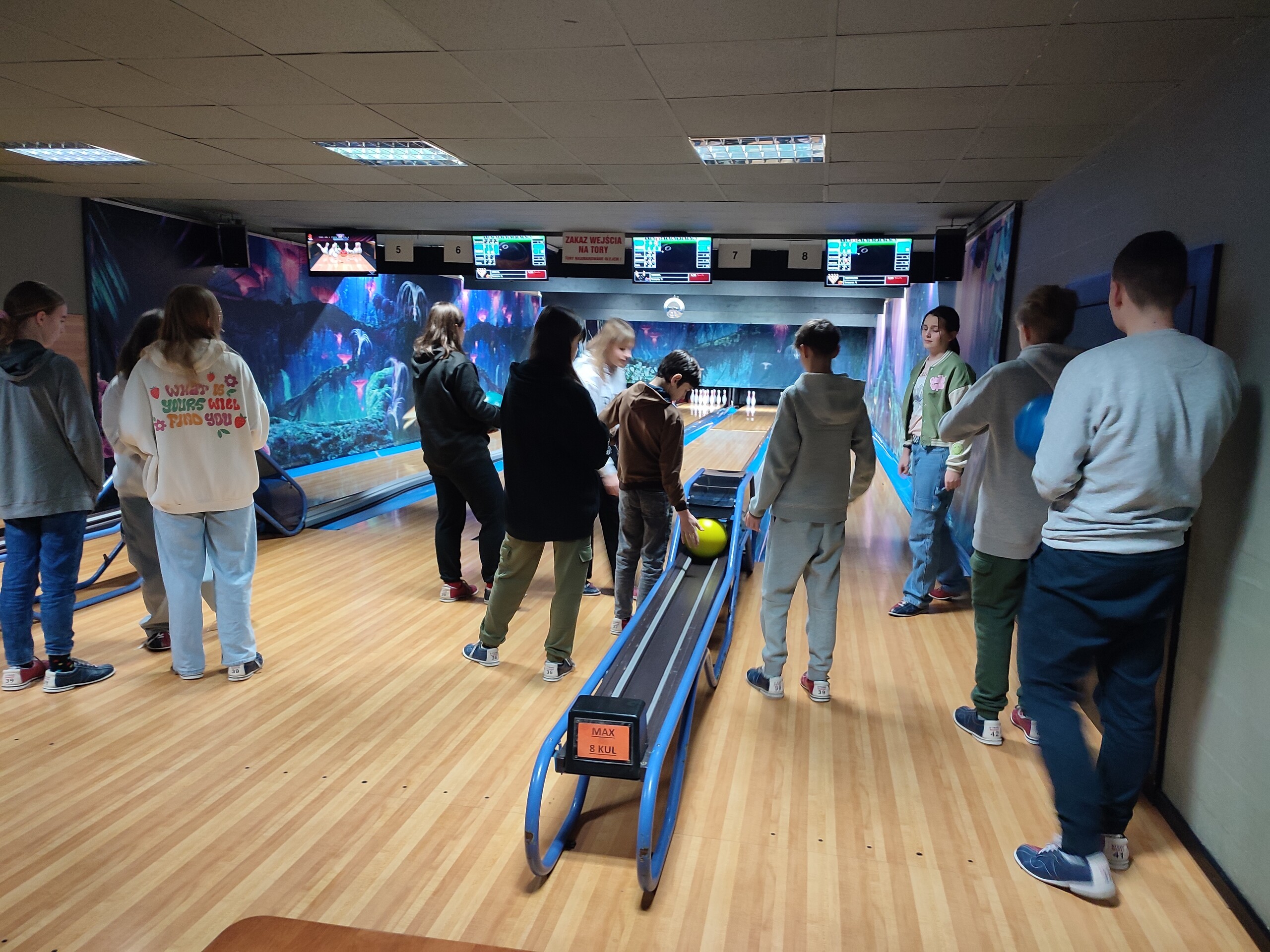 Uczniowie klas siódmych najpierw udali się na bowling. Do naszej dyspozycji zostały oddane 3 tory. Na początku nikt się nie spodziewał, że gra w kręgle może wywoływać aż takie emocje. Pozytywne napięcie wzrosło, kiedy okazało się, że wśród naszych uczniów jest wielu wcześniej nieodkrytych mistrzów.