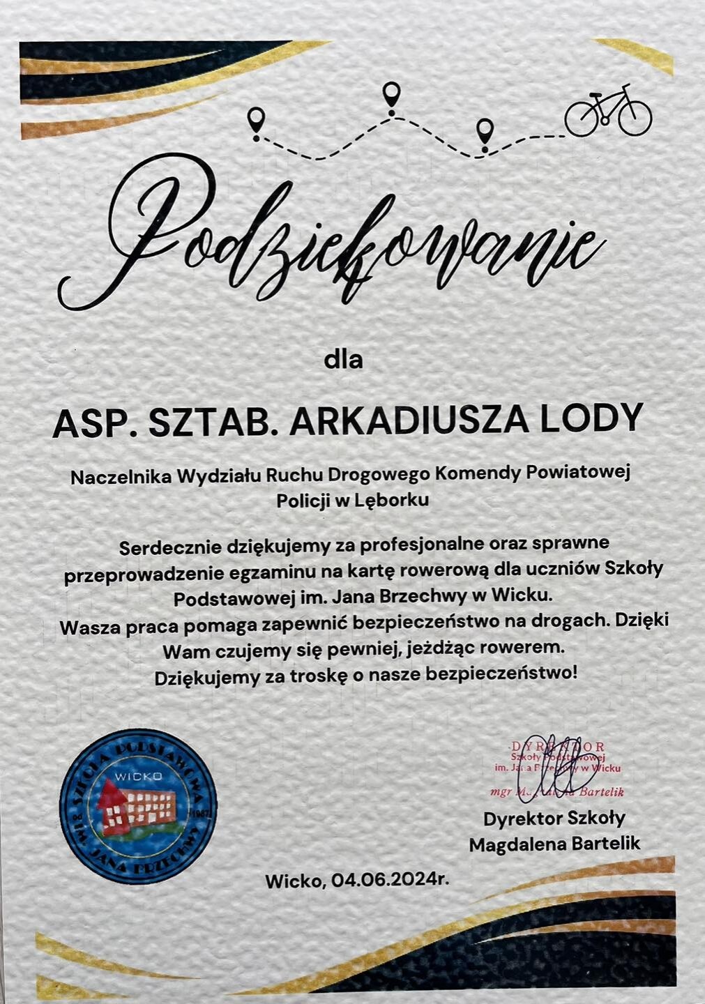 Składamy serdeczne podziękowania na ręce Naczelnika Wydziału Ruchu Drogowego Komendy Powiatowej Policji w Lęborku, pana Arkadiusza Lody, za profesjonalne i sprawne przeprowadzenie egzaminu praktycznego na kartę rowerową dla uczniów naszej szkoły.