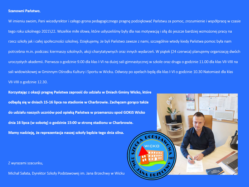 Fotorelacja z uroczystego zakończenia roku szkolnego 2021/2022 - apel dla kl. VII - VIII SP Wicko