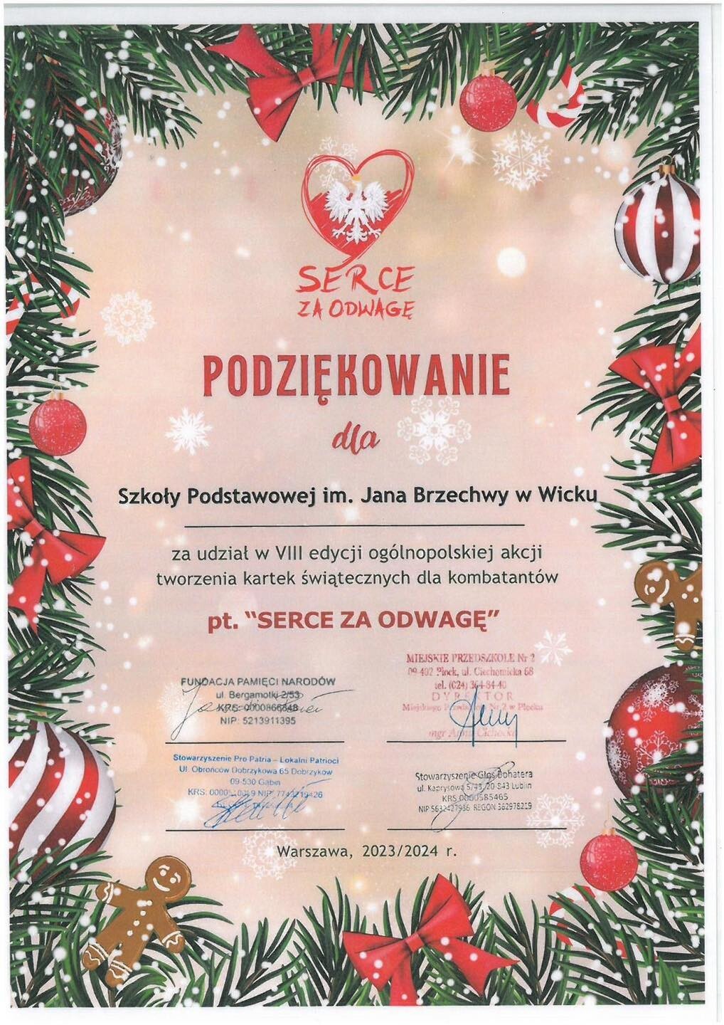 Miło nam poinformować, że nasza szkoła otrzymała dyplom z podziękowaniem za udział w VIII edycji ogólnopolskiej akcji tworzenia kartek świątecznych dla kombatantów pod nazwą "Serce za odwagę". Dziękujemy!
