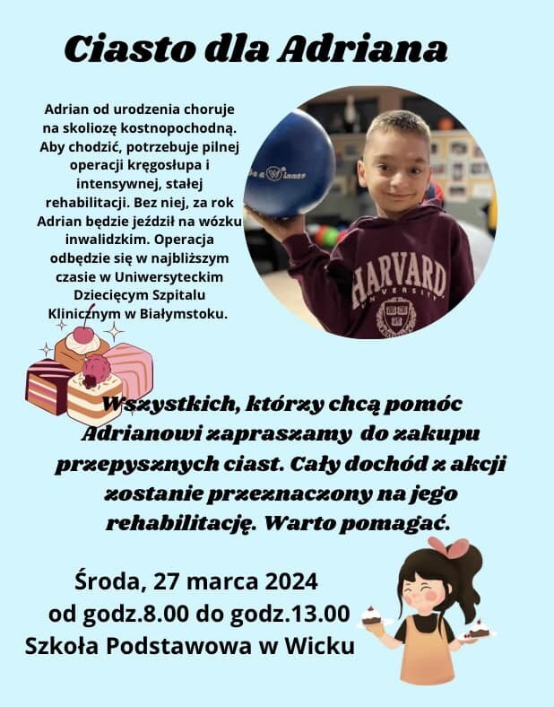 Naszego ucznia czeka poważna operacja i intensywna, długotrwała rehabilitacja. Aby pomóc Adrianowi, w środę, 27 marca 2024, będziemy sprzedawać ciasta.