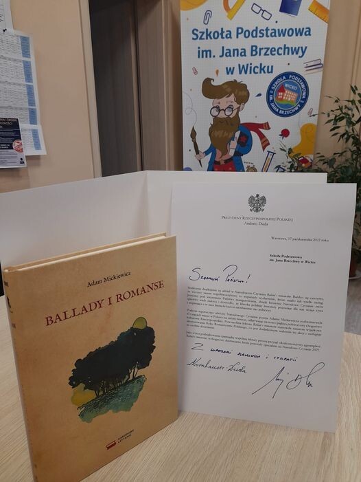 Dziękujemy za piękny prezent w postaci listu od Pana Prezydenta RP oraz egzemplarza "Ballad i romansów" Adama Mickiewicza. Jak co roku, nasza szkoła we wrześniu była współorganizatorem akcji "Narodowe Czytanie" w Gminie Wicko.