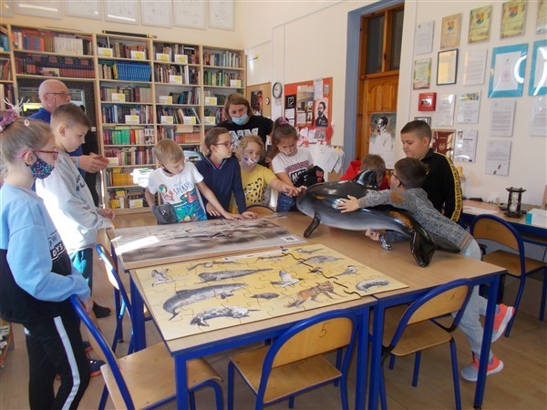 W ramach przypadającego na dzień przed spotkaniem z Patrolem WWF Światowego Dnia Ptaków Pan Irek - przyrodnik z Łeby reprezentujący WWF na tym terenie - spotkał się z naszymi trzecio- i czwartoklasistami. Tematem spotkań z przyrodą były nie tylko nadmorskie ptaki występujące na Pomorzu, ale również inni przedstawiciele bałtyckiej flory i fauny, zwłaszcza te gatunki, które są zagrożone wyginięciem i wymagają szczególnej ochrony. Dzięki interesującym materiałom edukacyjnym, które Pan Irek wypożyczył Bibliotece Szkolnej w Wicku, dzieciaki z wielką ochotą brały udział we wspólnym układaniu przyrodniczych puzzle i przyglądały się naturalnej wielkości modelowi morświna. Składamy serdeczne podziękowania za przygotowanie cyklu zajęć z WWF.